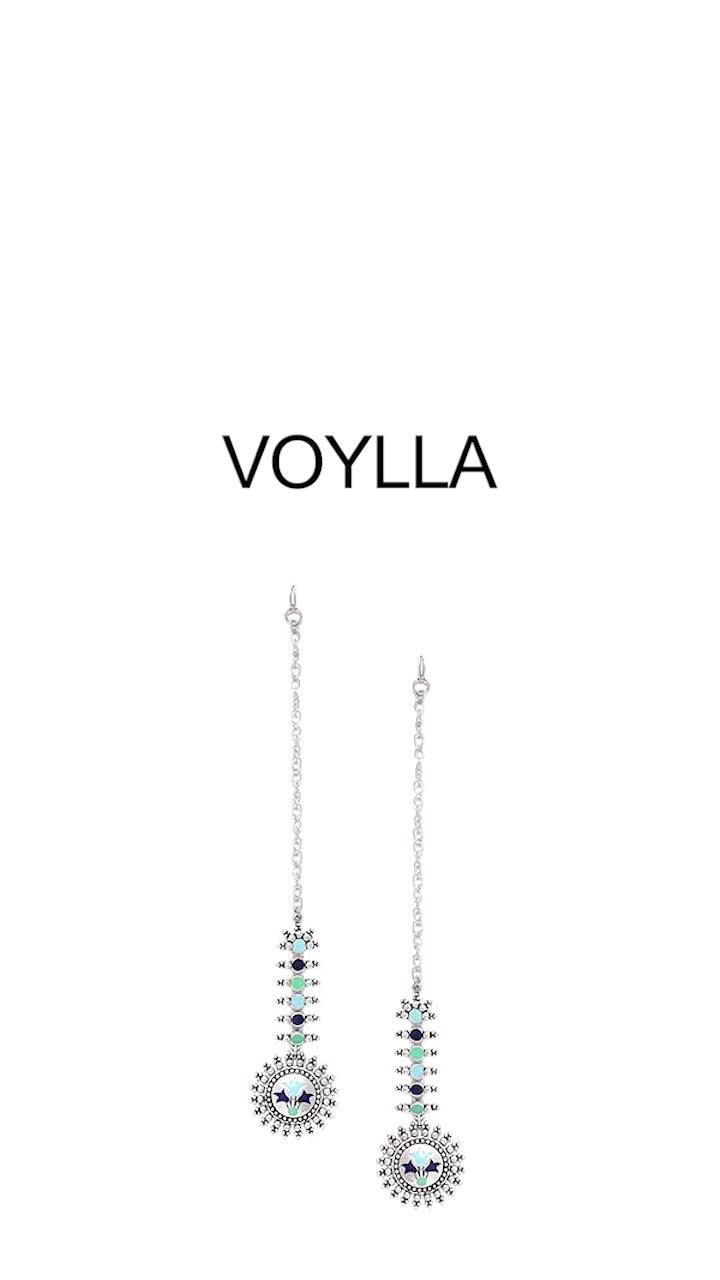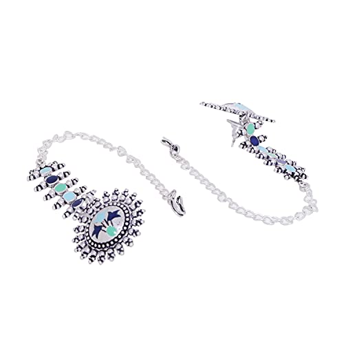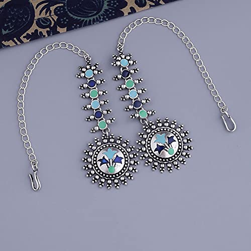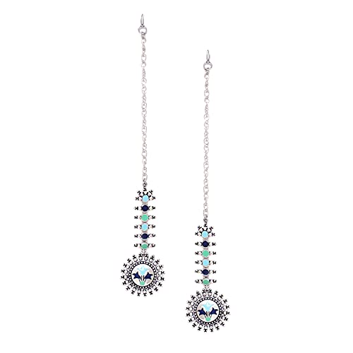 Women's Oxidised Long Chain With Circles And Blue Studs Kanauti Dangler Earrings(Free Size)(Silver)
