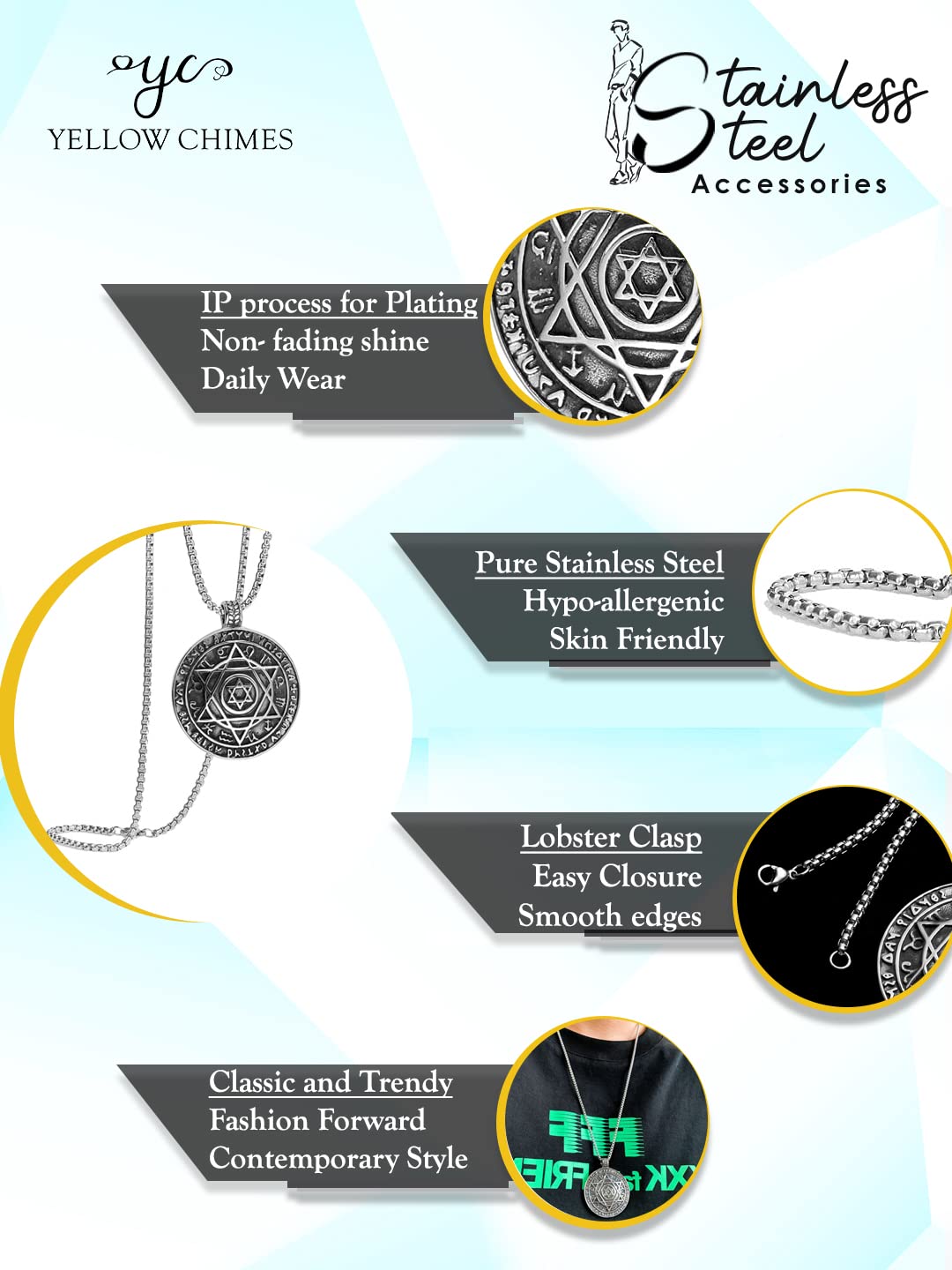 Yellow Chimes Pendant for Men and Boys Silver Pendants For Men | Stainless Steel Black Pendant Chain for Men | Birthday Gift for Men and Boys Anniversary Gift for Husband