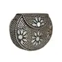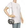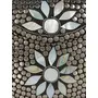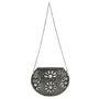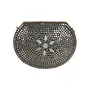 This silver & white mosaic metal halfmoon clutch with stone work has one main compartment with flap closure and a detachable metal chain. Can also be used as a sling bag.