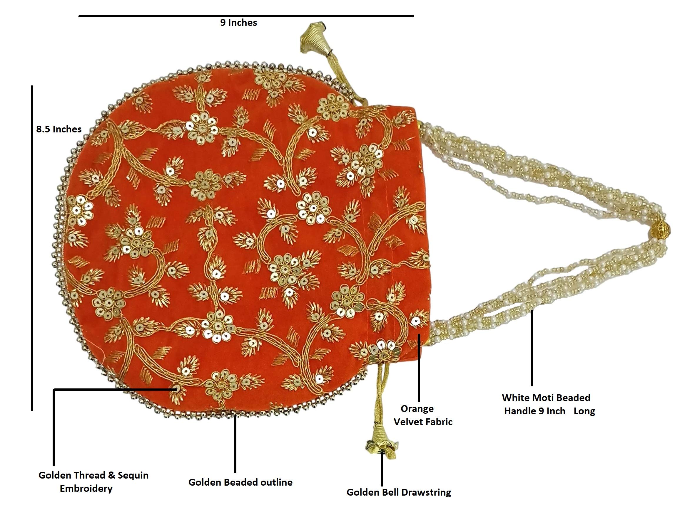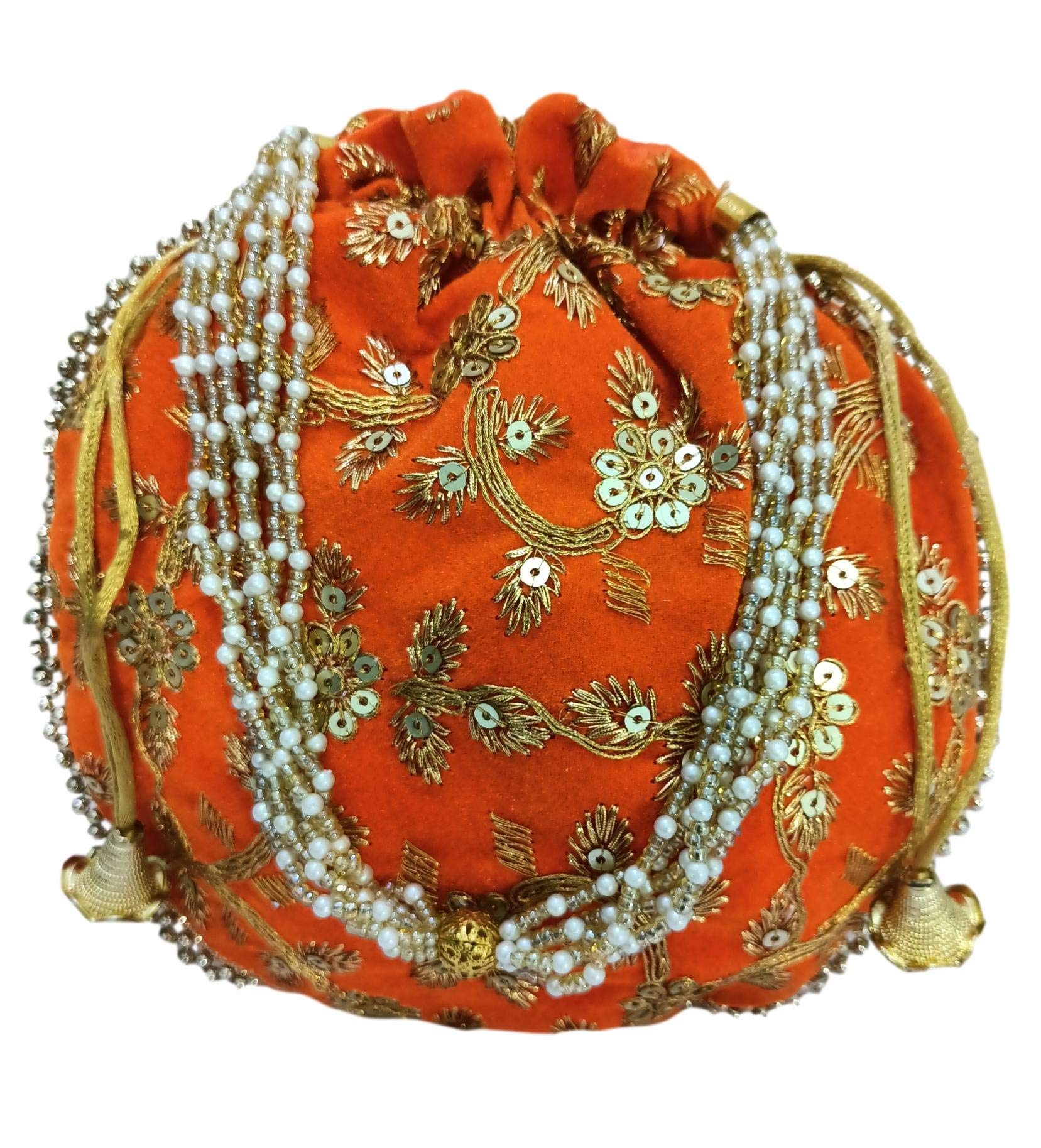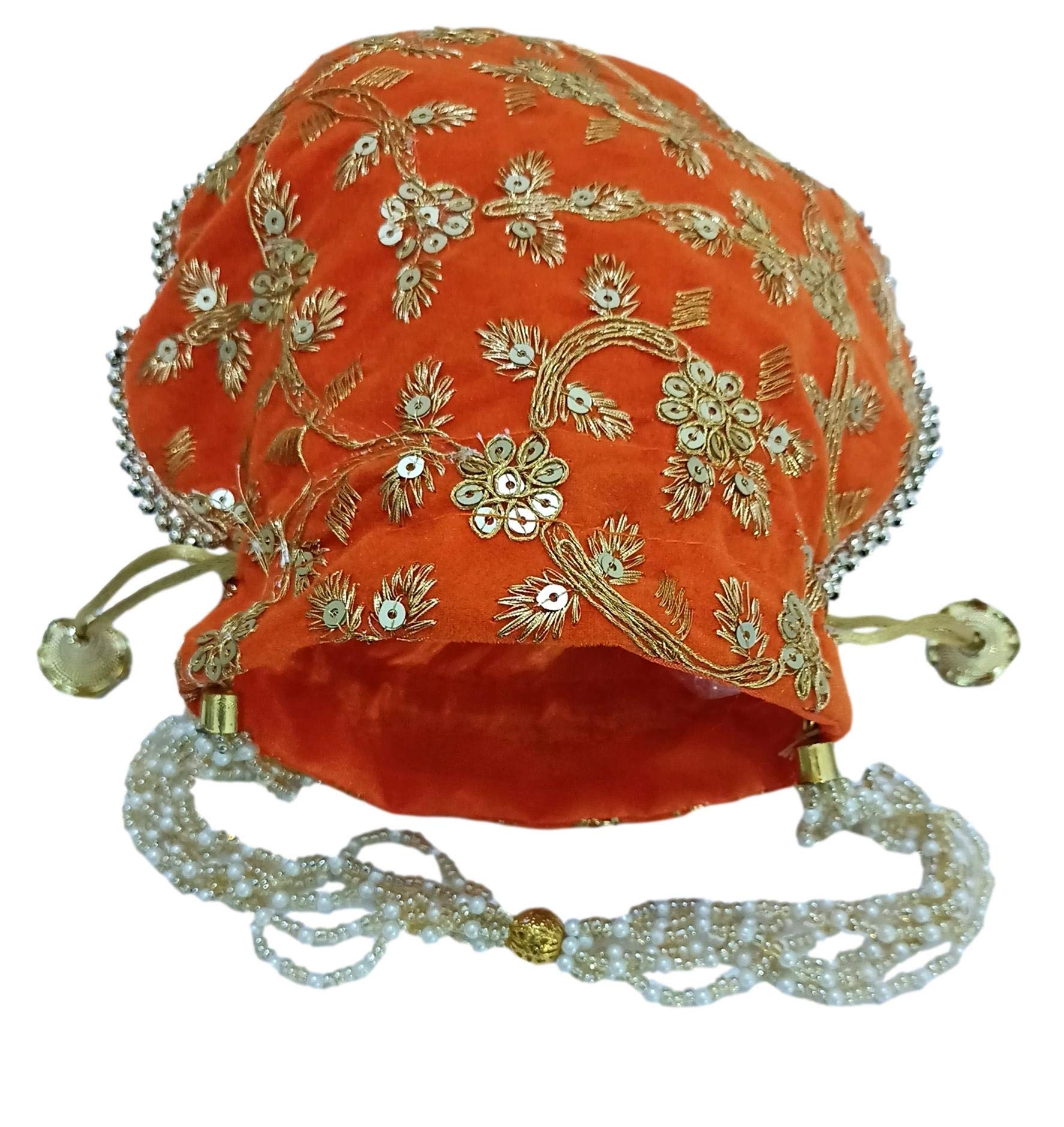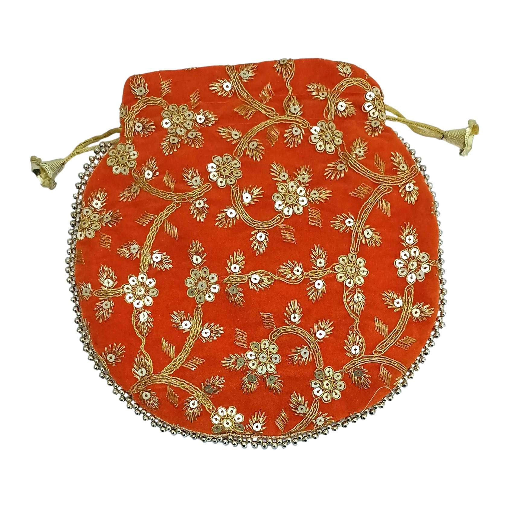 This velvet potli bag is perfect for ethnic dress and wedding fashion. This Potli bag also meets the purpose of return gift on wedding and other occasions. It is shiny in appearance. It has capacity of 400 gms. athizay orange potli hand bags for wedding gift items and return gift potli bags