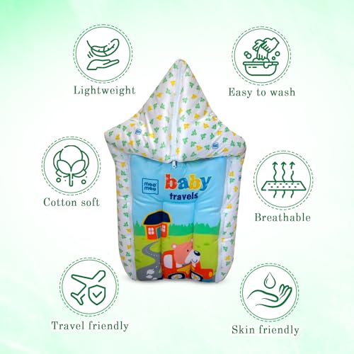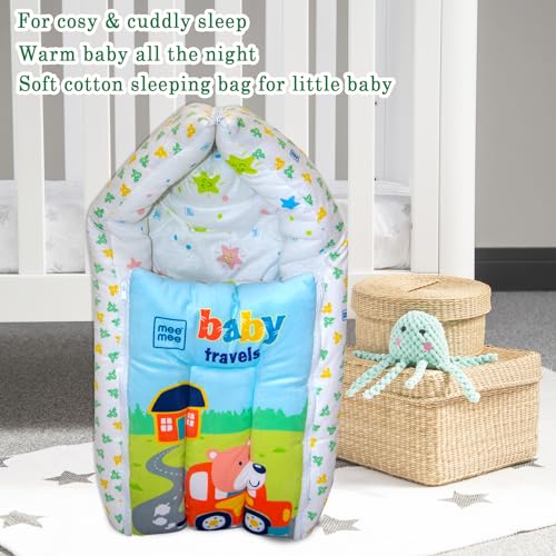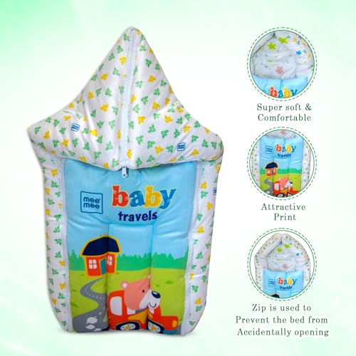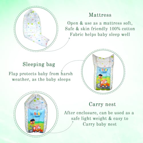 MOST COMFORTABLE FOR YOUR BABY: This baby sleeping bag ensures a hug of comfort to your baby so that the baby is reassured & keeps them in tight fit and thus they can be tucked into the bed or in your car seat easily. COZY AND SECURE | The design for our sleeping for baby ensures that your baby's arms and legs stay safely inside the bag reducing the risk of them getting tangled up in loose blankets or sheets. This creates a cozy and secure environment for your baby to sleep in. MULTI-FUNCTIONAL: Its light-weight and compact design makes it very easy to convert this into a travel companion. TRAVEL FRIENDLY CARRY NEST: When you're on-the-go the sleeping bag can be transformed into a convenient carry nest. PROVIDES A SNUG FIT -- The new born babies sleeping bag allows you to carry your baby outdoors while keeping it extremely relaxed. The materials used are breathable. The sleeping bag provides a snug fit to your baby for optimal sleeping comfort. The zippered closure of the sleeping bag lets you to open and close it with convenience. SAFE: Made of hypoallergenic cotton fibre this bed is perfect for the baby skin & turns to be the preferred lounger for the baby ADAPTABLE: Grows with your baby with the help of the zipper. ALL WEATHER FRIENDLY: In winter and AC environment the zipper can be closed and the bedding acts as a hooded quilt whereas in case of warm weather it can be used as a mattress CO-SLEEPING: This baby bedding set lets you co-sleep with your baby it creates a barrier between baby and parents giving the baby their own cozy space