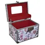 Pride large aluminium framed Jewellery vanity case with a faux leather effect covering and perfect for storing make up Jewellery bangles cosmetics and toiletries. It comes with robust design easy grip carry handle faux maroon suede interior for a luxury finish and a number lock to keep your items safe and secure. A stunning vanity case crafted beautifully for professionals and perfect for home use. This gorgeous cosmetics/Jewellery case is made from silver hinges which guarantees durability. The stylish handle also ensures easy transportation with its lightweight nature. The case comes with a number lock not only complementing the hinges but provides ultimate security for example when taking it away for the weekend you know your cosmetics will be safe and secure. A must have for sorting make up beauty products jewellery And More!! SIZE : 23*17*17 CMS