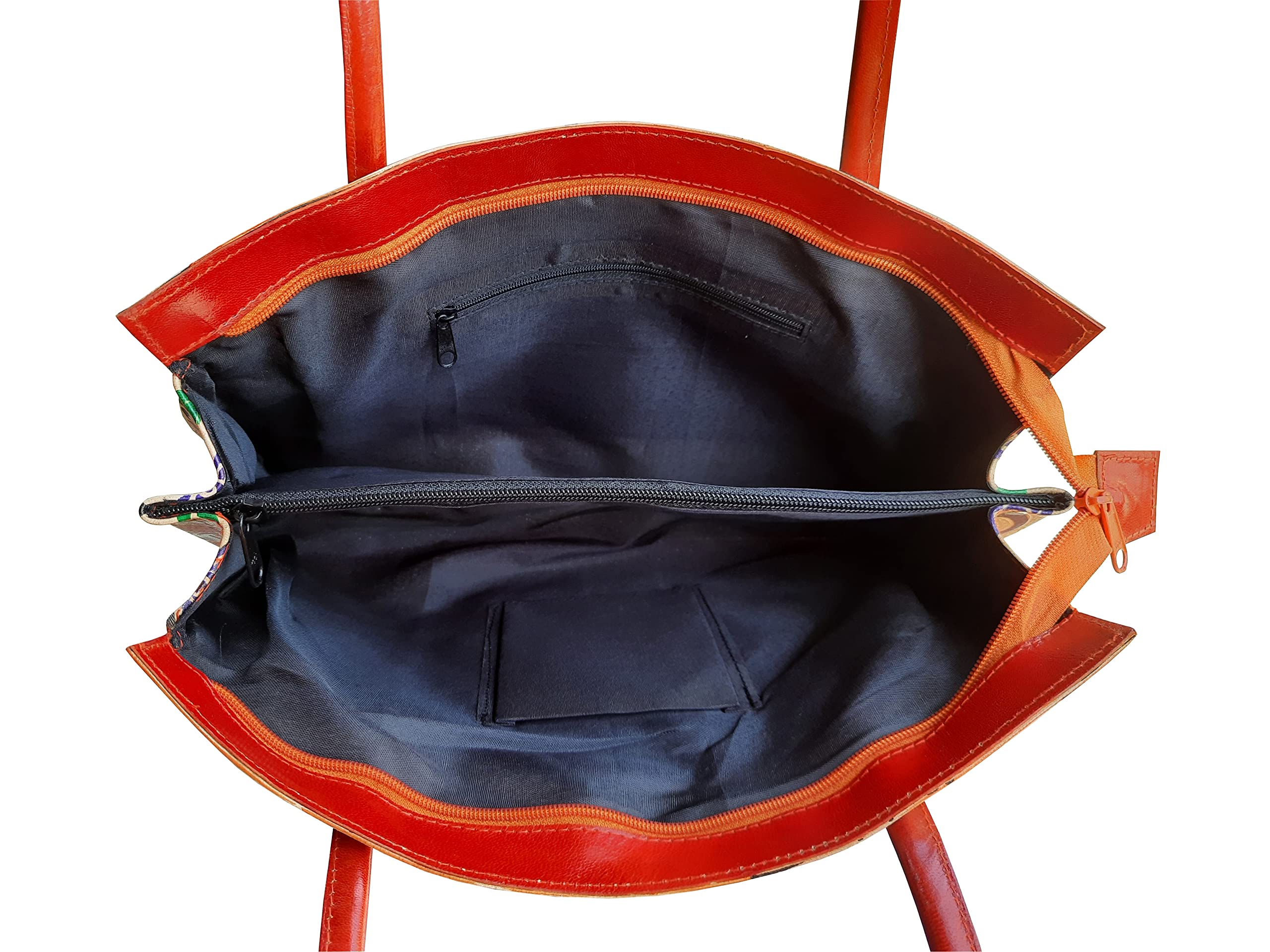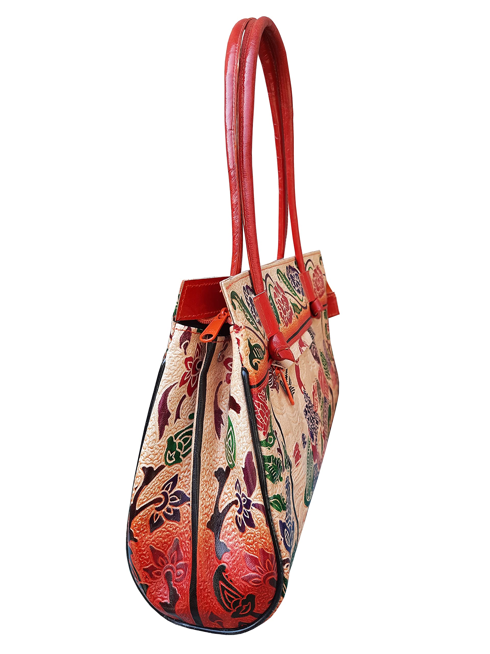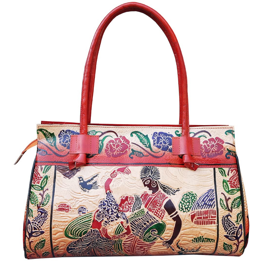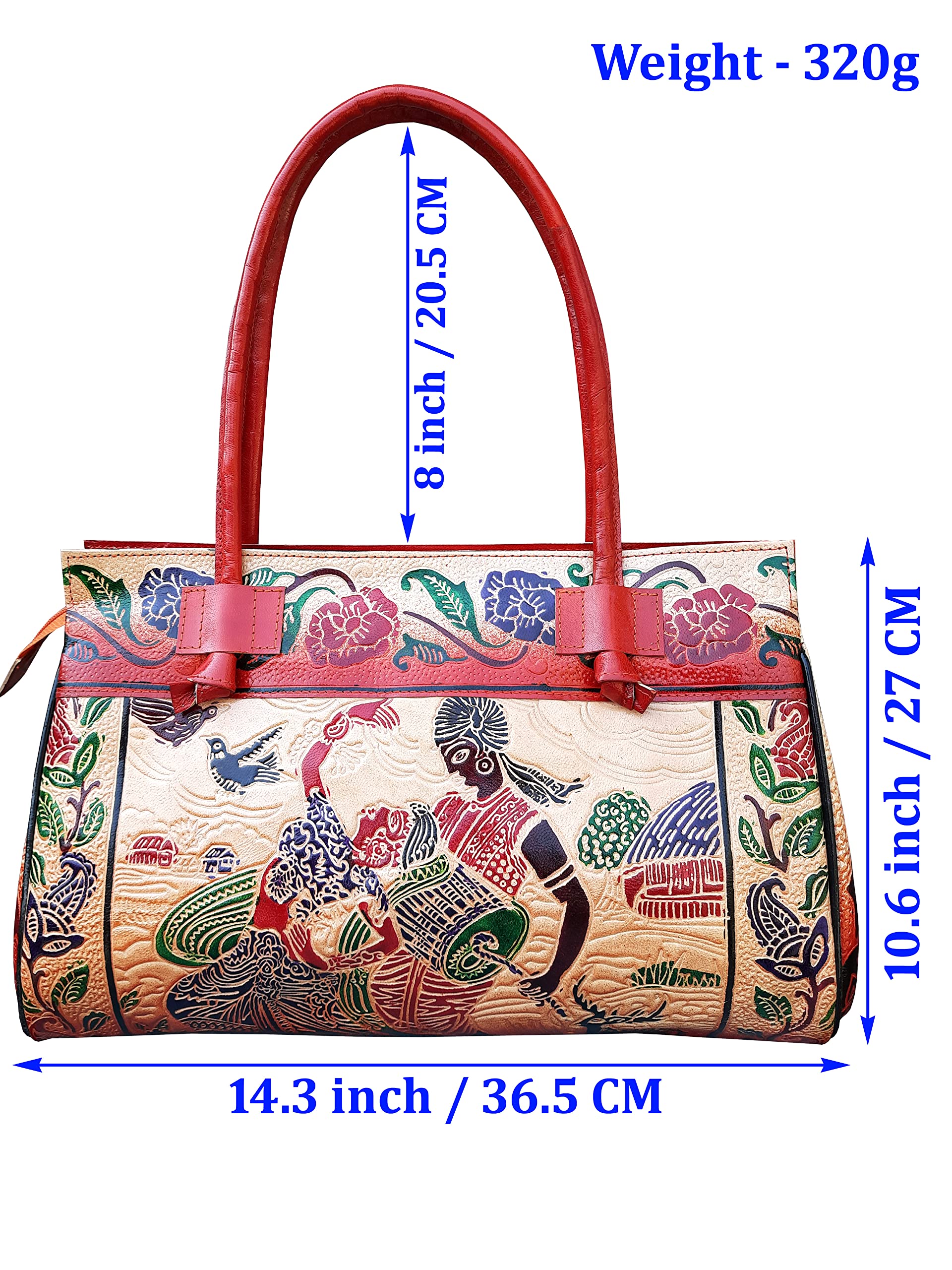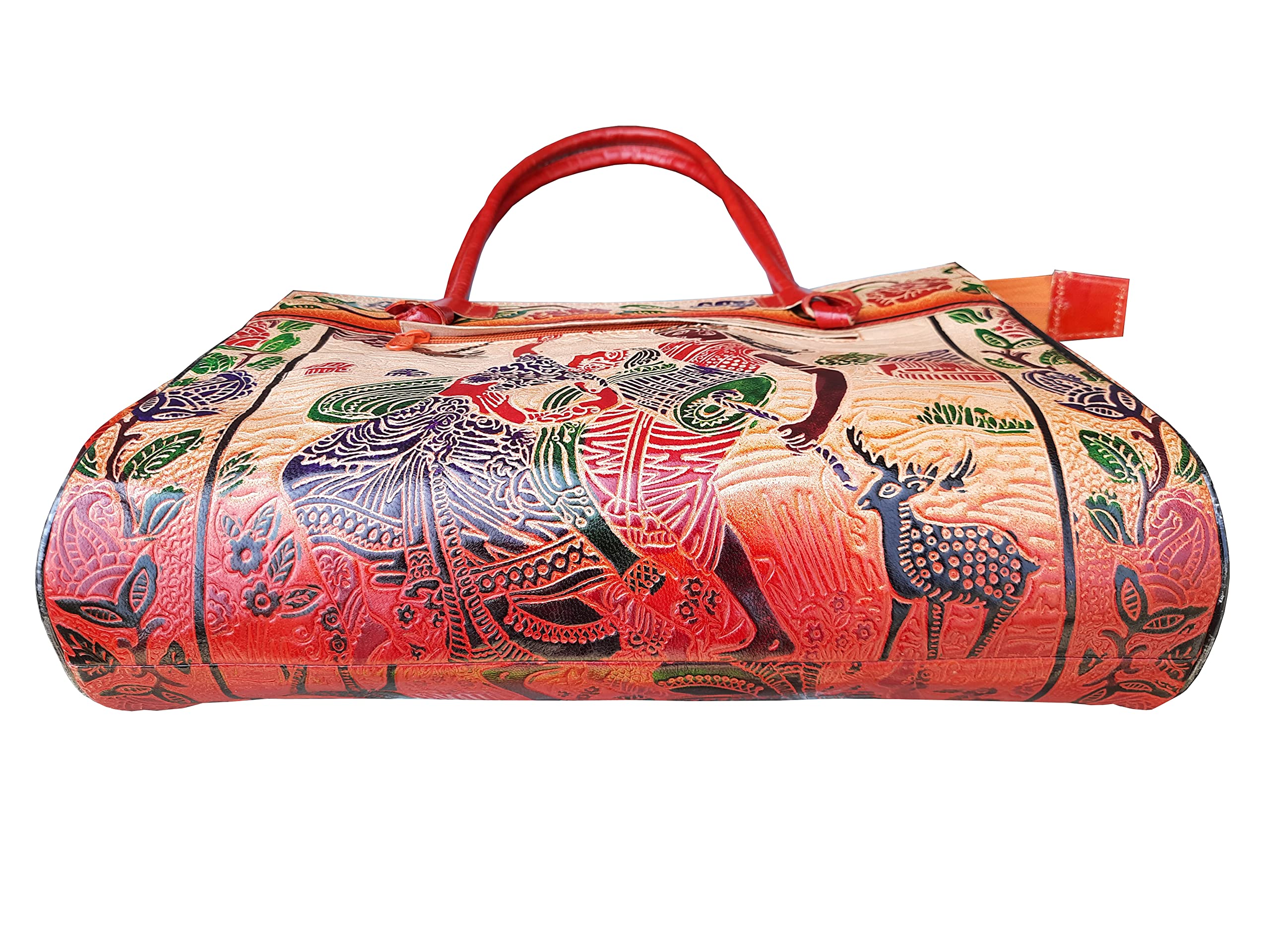 Handcrafted from Genuine Leather a Beautiful Ethnic Art of West Bengal. Design on Both Sides Double Shoulder Tote Handle One Main Zipper compartment One Zipper pocket in Back and Three Compartments inside Two zipper and One open cell phone compartment. Closes fully with zip. This purse is a classic example of age old Shantiniketan craft which was introduced in West Bengal India during the 1940s. The Shantiniketan style evolved as a result of the Art Movement and these products have now become world famous for their applique batik and embossed craft work. The process of burnishing the leather gives it an elegant sheen and brings out the colors. The major embossing craft is done by hand and is an intricate process. After the final leather made it is then stitched into the desired product coated with a lacquer finish for making the product shiny and long lasting. We are happy for your interest SHANTINIKETAN EMBOSSED LEATHER PRODUCTS and artist of Shantinikan thanks to you.
