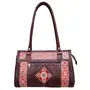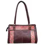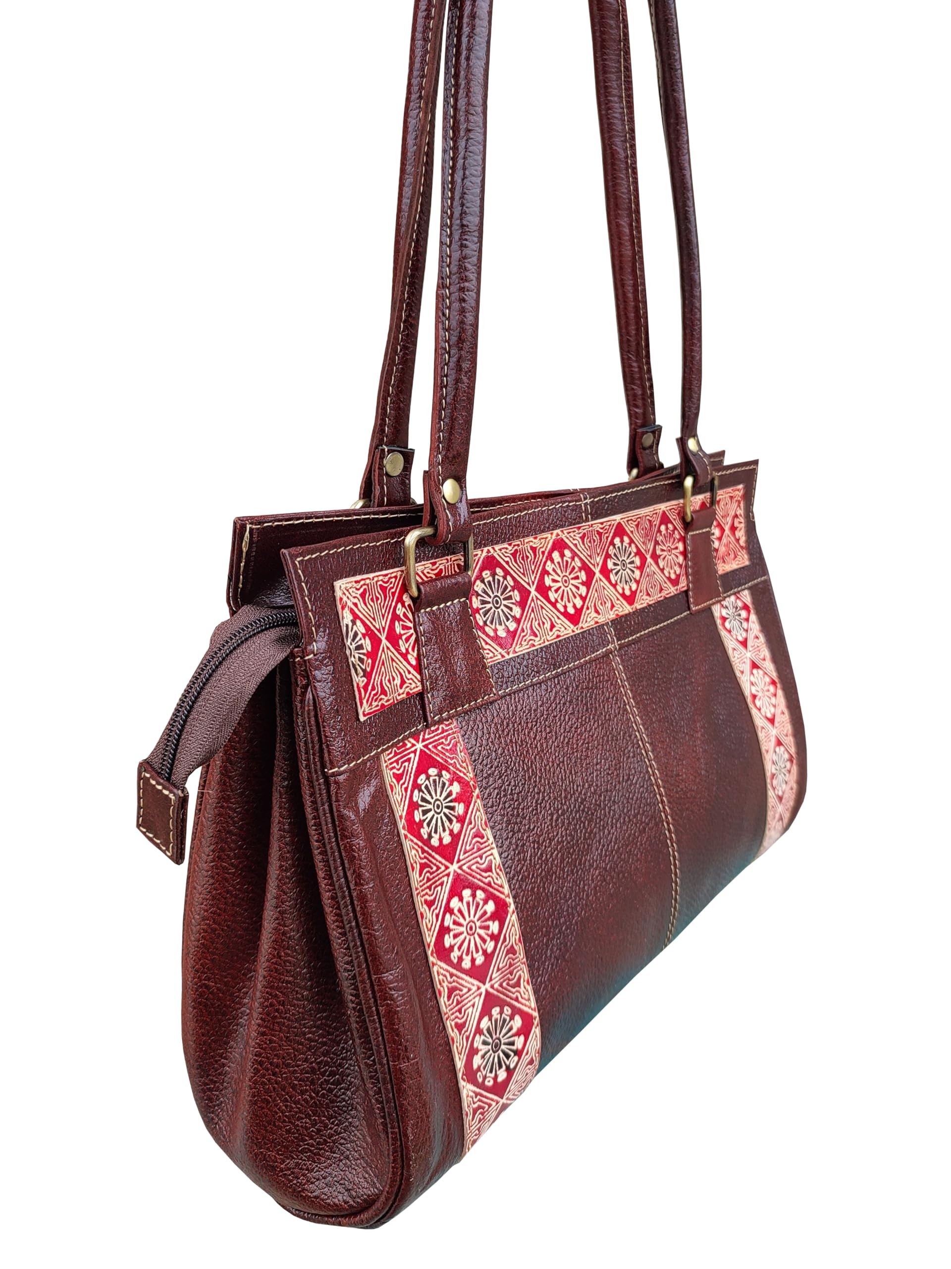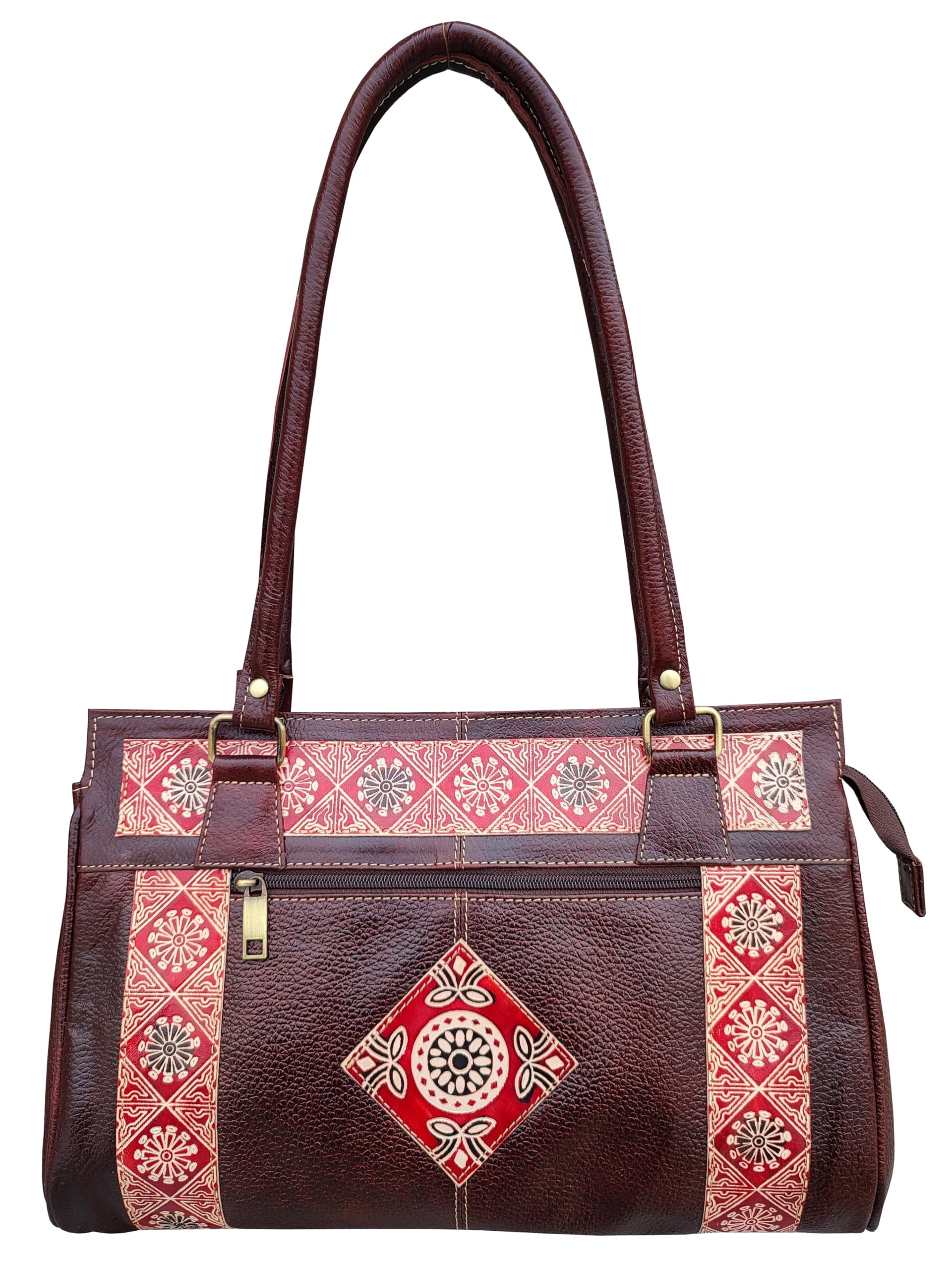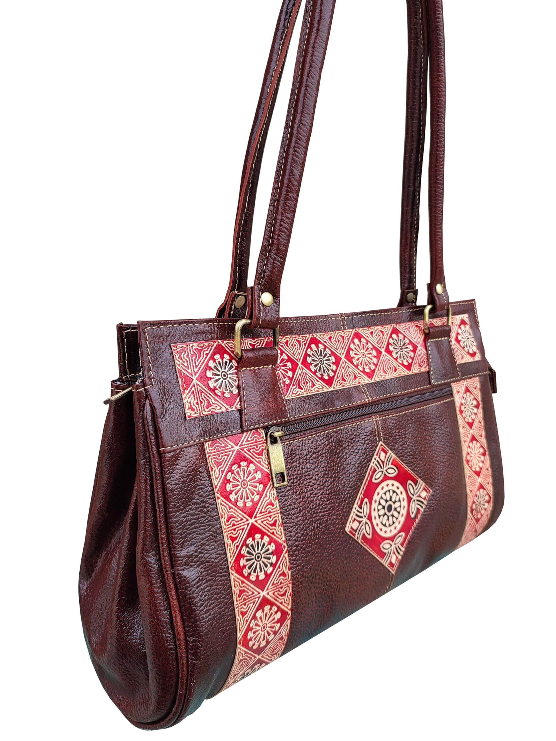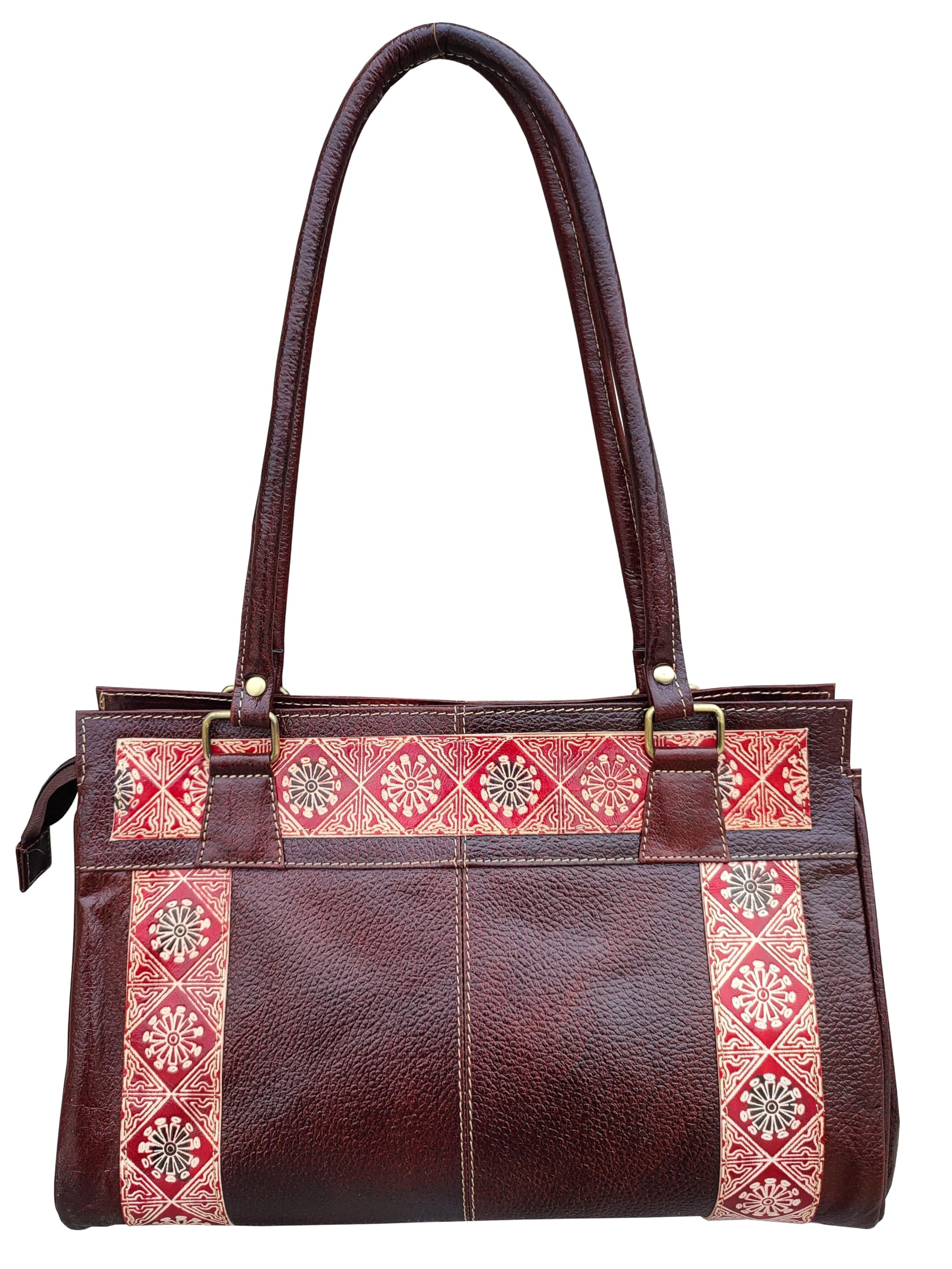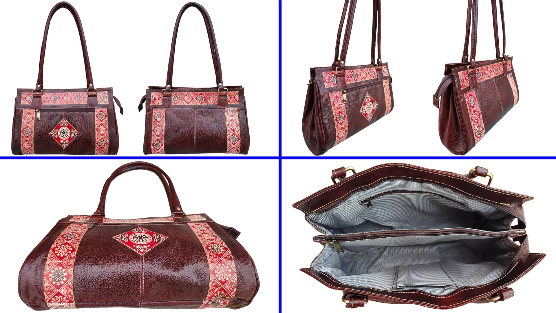 Handcrafted from Genuine Leather a Beautiful Ethnic Art of West Bengal. Double Shoulder Tote Handle One Main Zipper compartment One Zipper pocket in Back and Three Compartments inside Two zipper and One open cell phone compartment. Closes fully with zip. This purse is a classic example of age old Shantiniketan craft which was introduced in West Bengal India during the 1940s. The traditional motifs used for these Shantiniketan bags depict the rich cultural heritage of India. The Shantiniketan style evolved as a result of the Art Movement and these products have now become world famous for their appliqu batik and embossed craft work. The process of burnishing the leather gives it an elegant sheen and brings out the colors. The major embossing craft is done by hand and is an intricate process. After the final leather made it is then stitched into the desired product coated with a lacquer finish for making the product shiny and long lasting. We are happy for your interest SHANTINIKETAN EMBOSSED LEATHER PRODUCTS and artist of Shantinikan thanks to you.