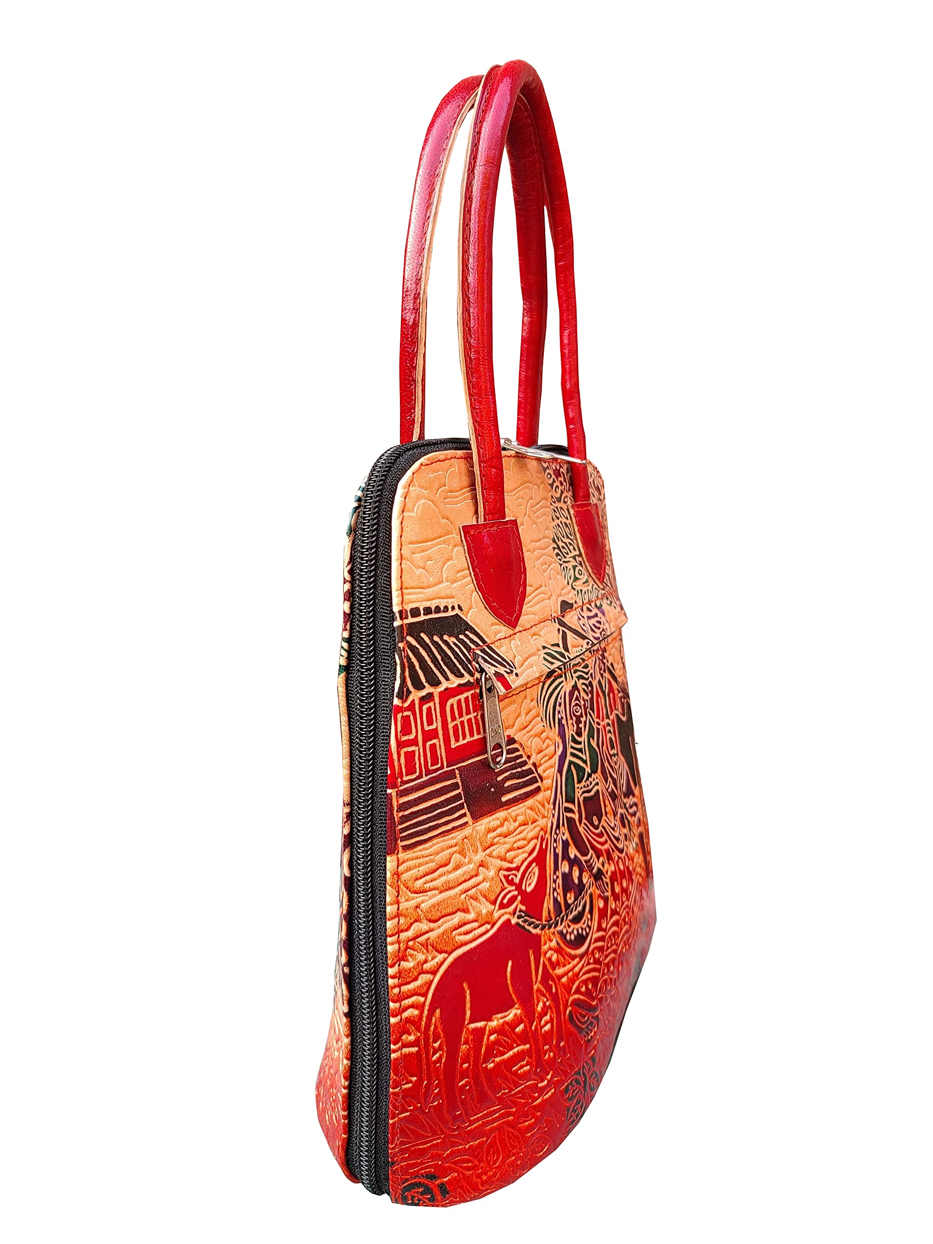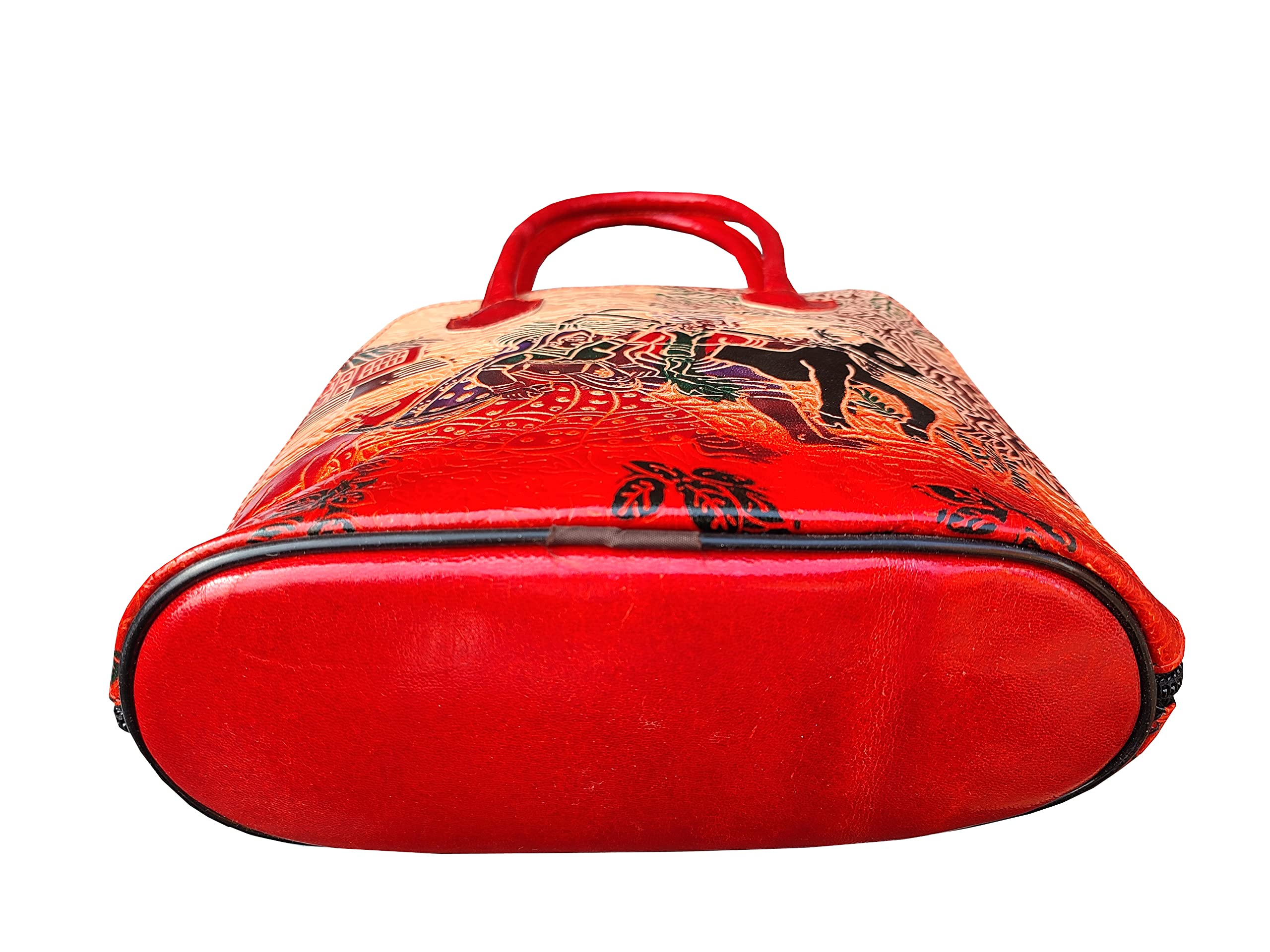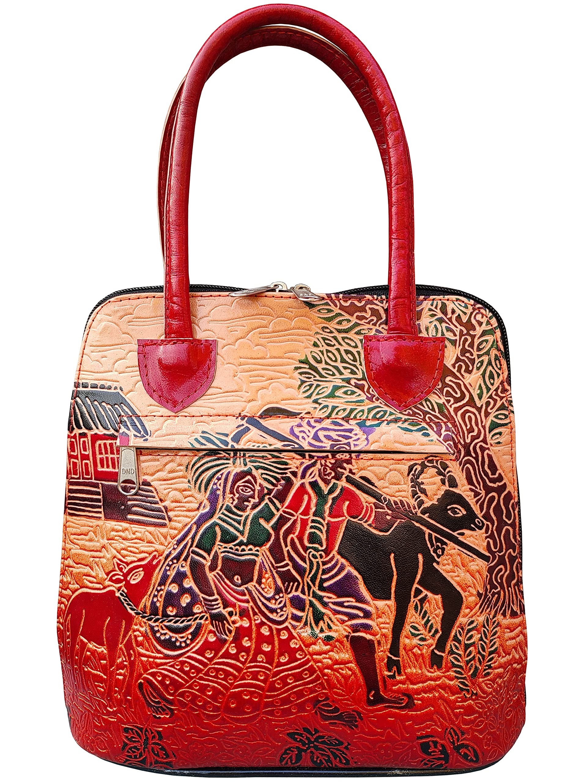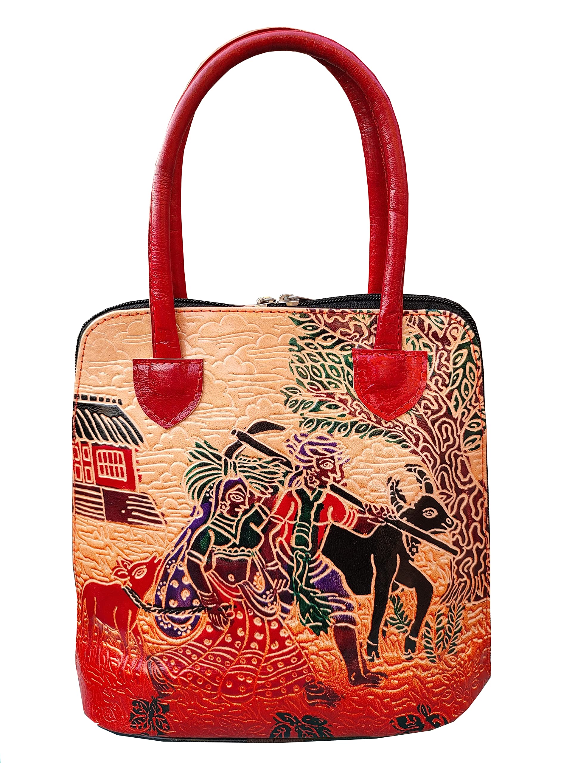 Handcrafted from Genuine Leather a Beautiful Ethnic Art of West Bengal. Design on Both Sides Double Handle One Main Zipper compartment One Zipper pocket in Back and Two zipper Compartments inside Closes fully with zip. This purse is a classic example of age old Shantiniketan craft which was introduced in West Bengal India during the 1940s. The Shantiniketan style evolved as a result of the Art Movement and these products have now become world famous for their applique batik and embossed craft work. The process of burnishing the leather gives it an elegant sheen and brings out the colors. The major embossing craft is done by hand and is an intricate process. After the final leather made it is then stitched into the desired product coated with a lacquer finish for making the product shiny and long lasting. We are happy for your interest SHANTINIKETAN EMBOSSED LEATHER PRODUCTS and artist of Shantinikan thanks to you.