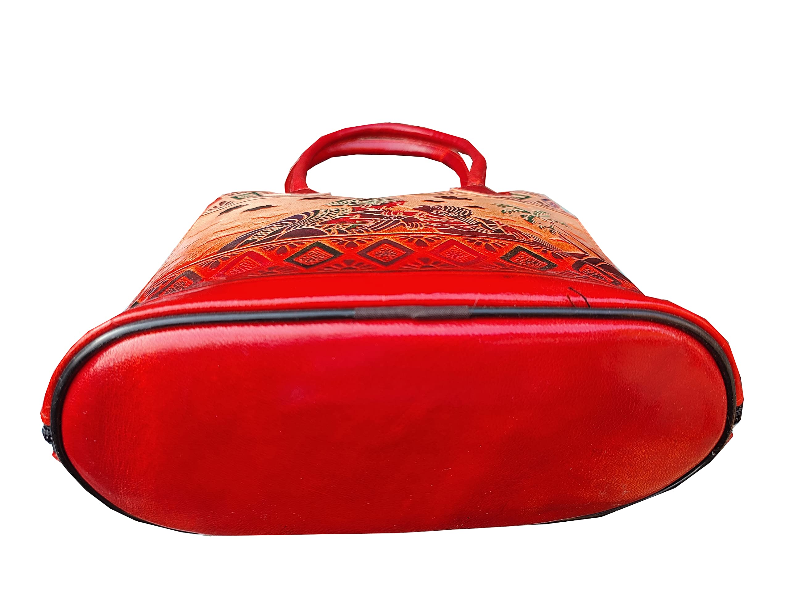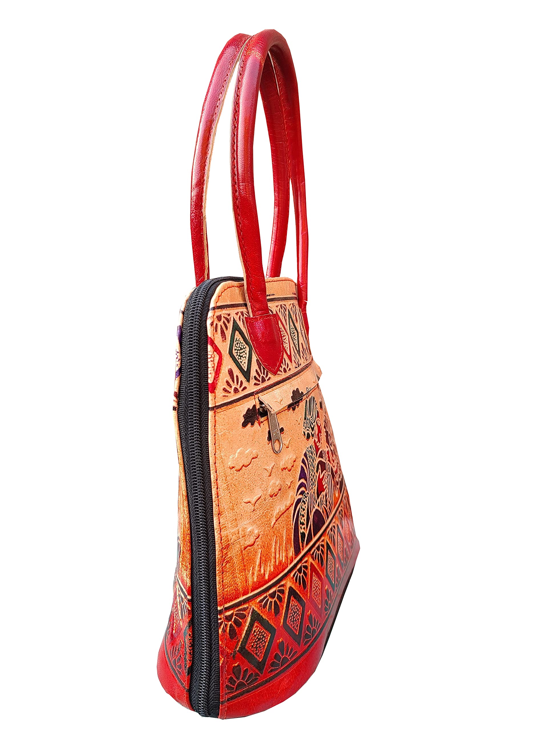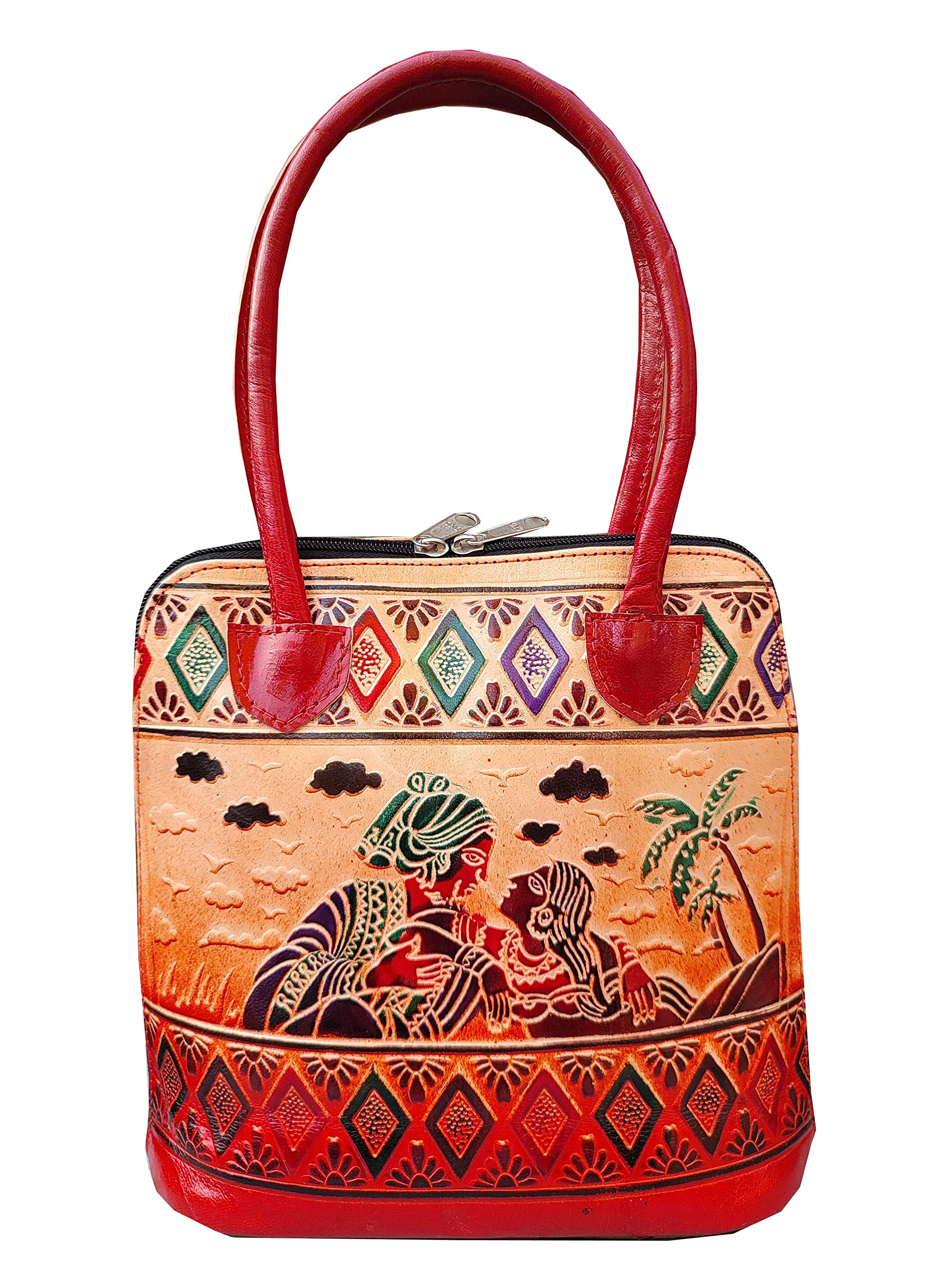 Handcrafted from Genuine Leather a Beautiful Ethnic Art of West Bengal. Design on Both Sides Double Handle One Main Zipper compartment One Zipper pocket in Back and Two zipper Compartments inside Closes fully with zip. This purse is a classic example of age old Shantiniketan craft which was introduced in West Bengal India during the 1940s. The Shantiniketan style evolved as a result of the Art Movement and these products have now become world famous for their applique batik and embossed craft work. The process of burnishing the leather gives it an elegant sheen and brings out the colors. The major embossing craft is done by hand and is an intricate process. After the final leather made it is then stitched into the desired product coated with a lacquer finish for making the product shiny and long lasting. We are happy for your interest SHANTINIKETAN EMBOSSED LEATHER PRODUCTS and artist of Shantinikan thanks to you.