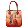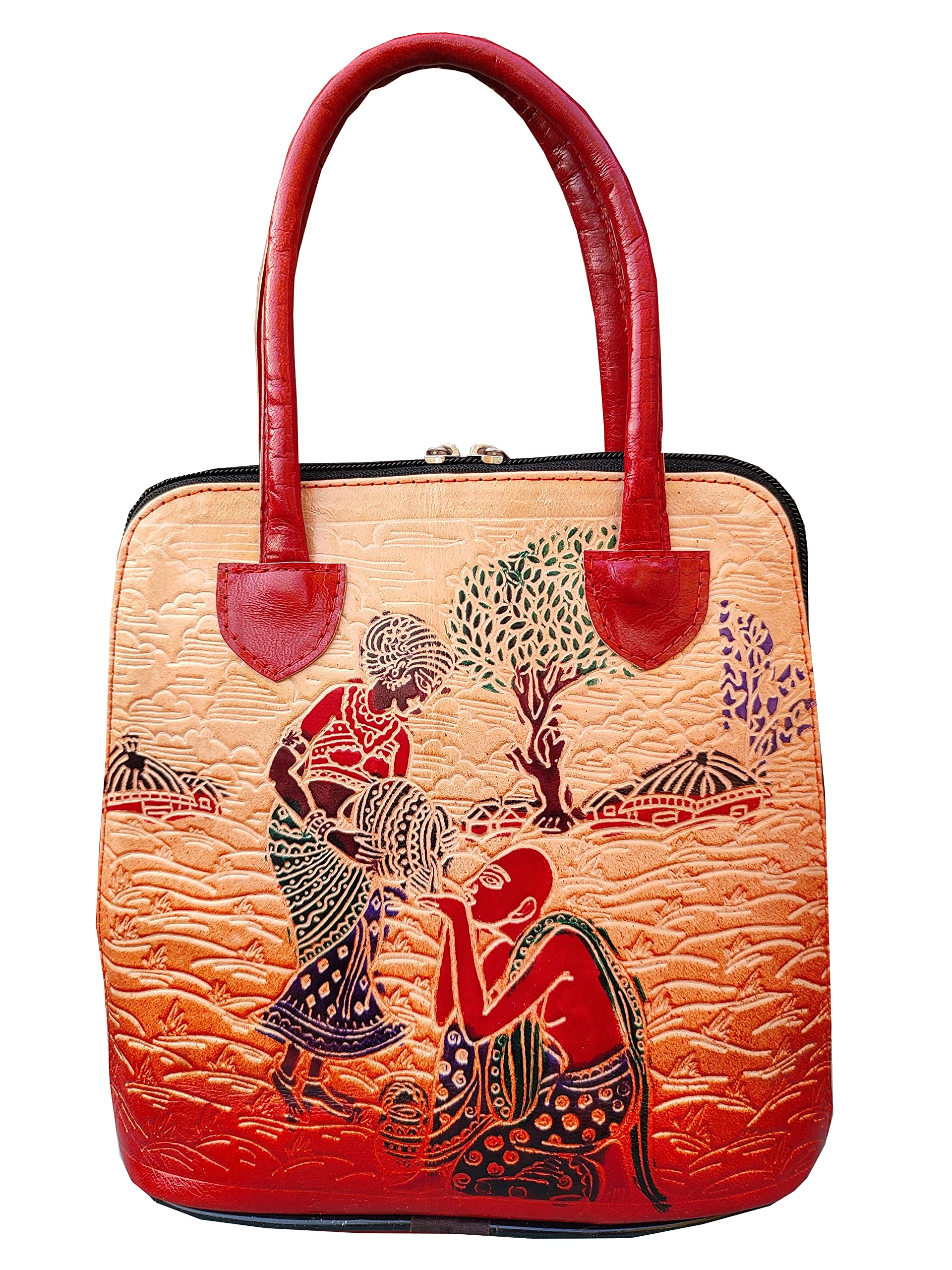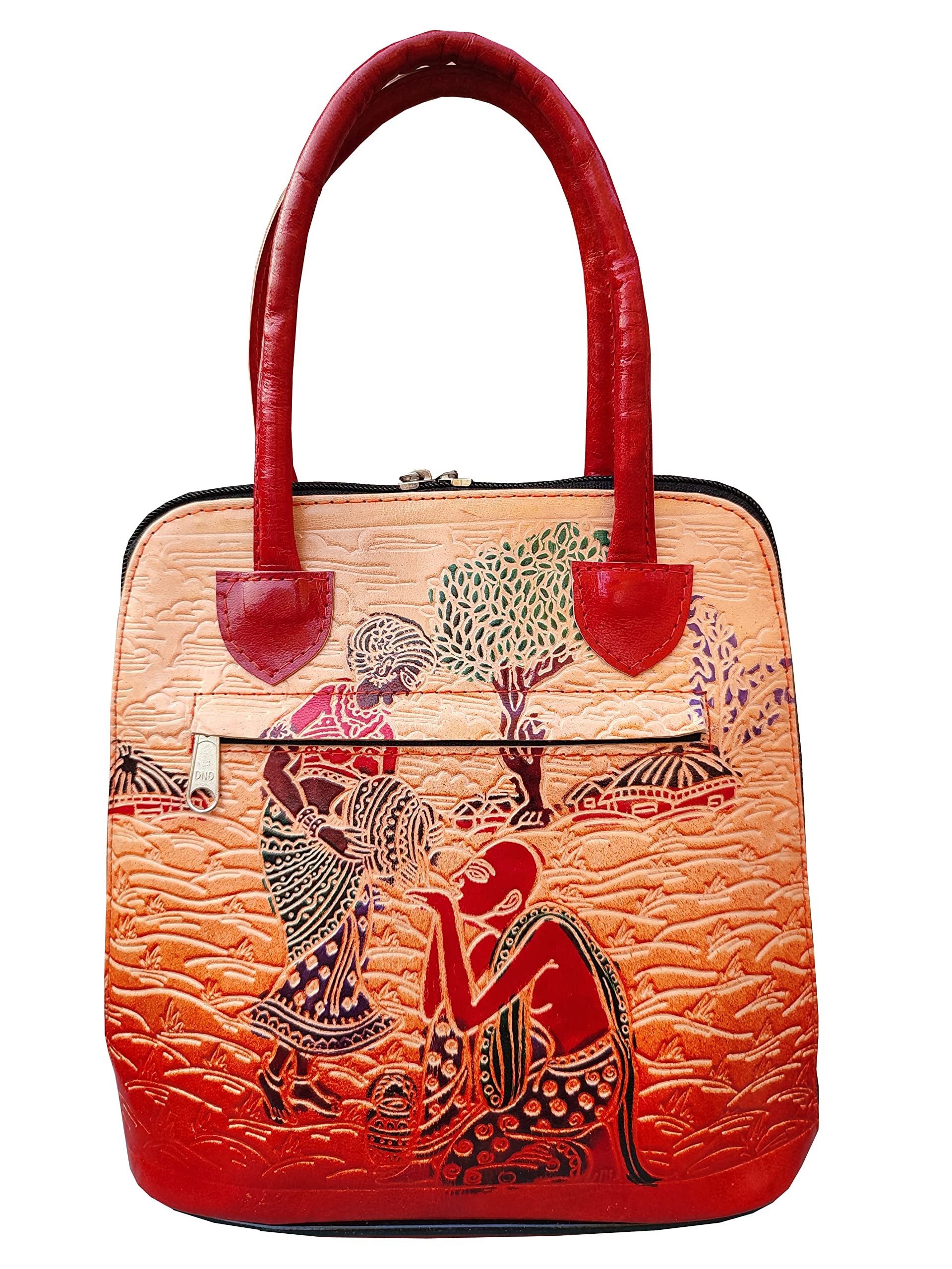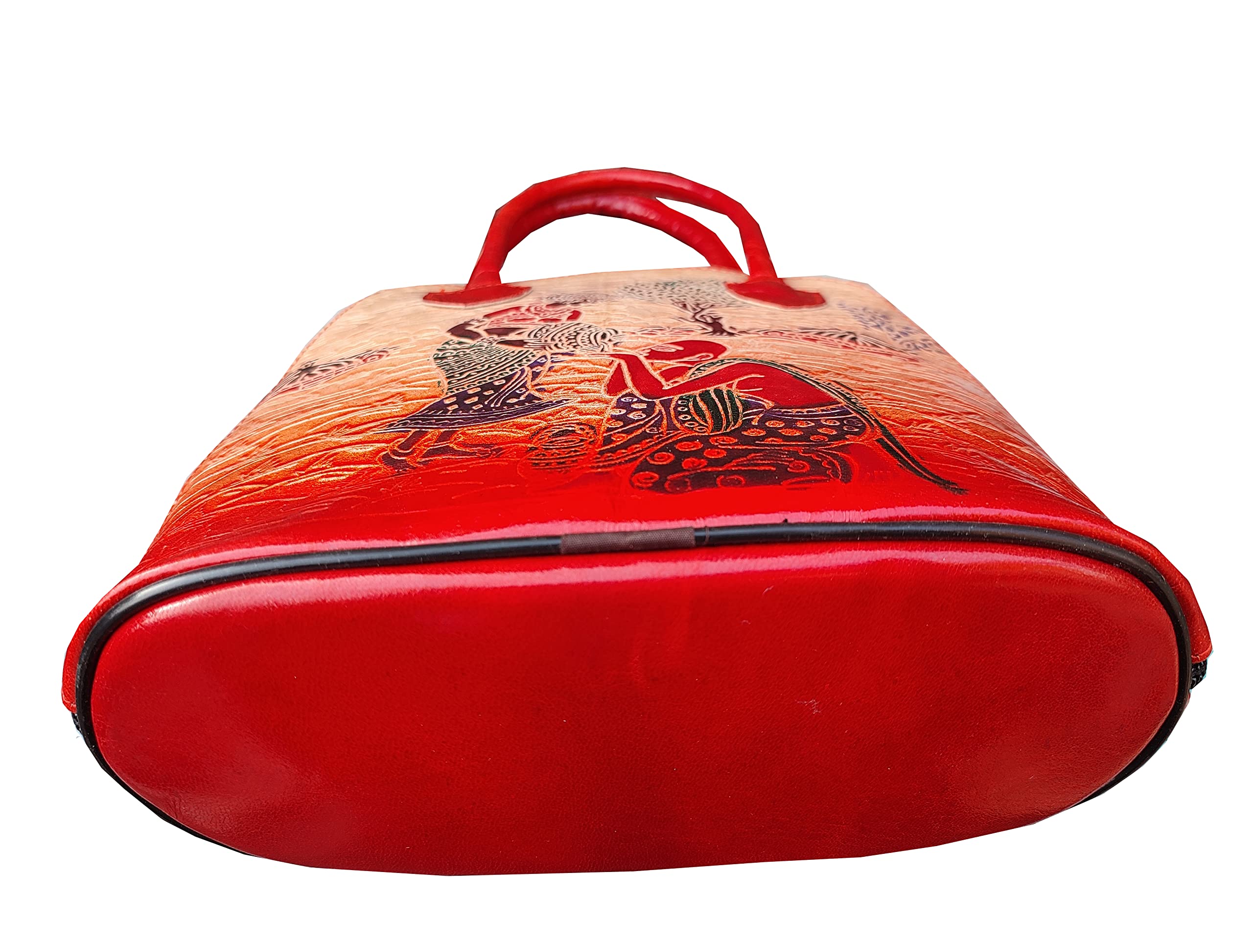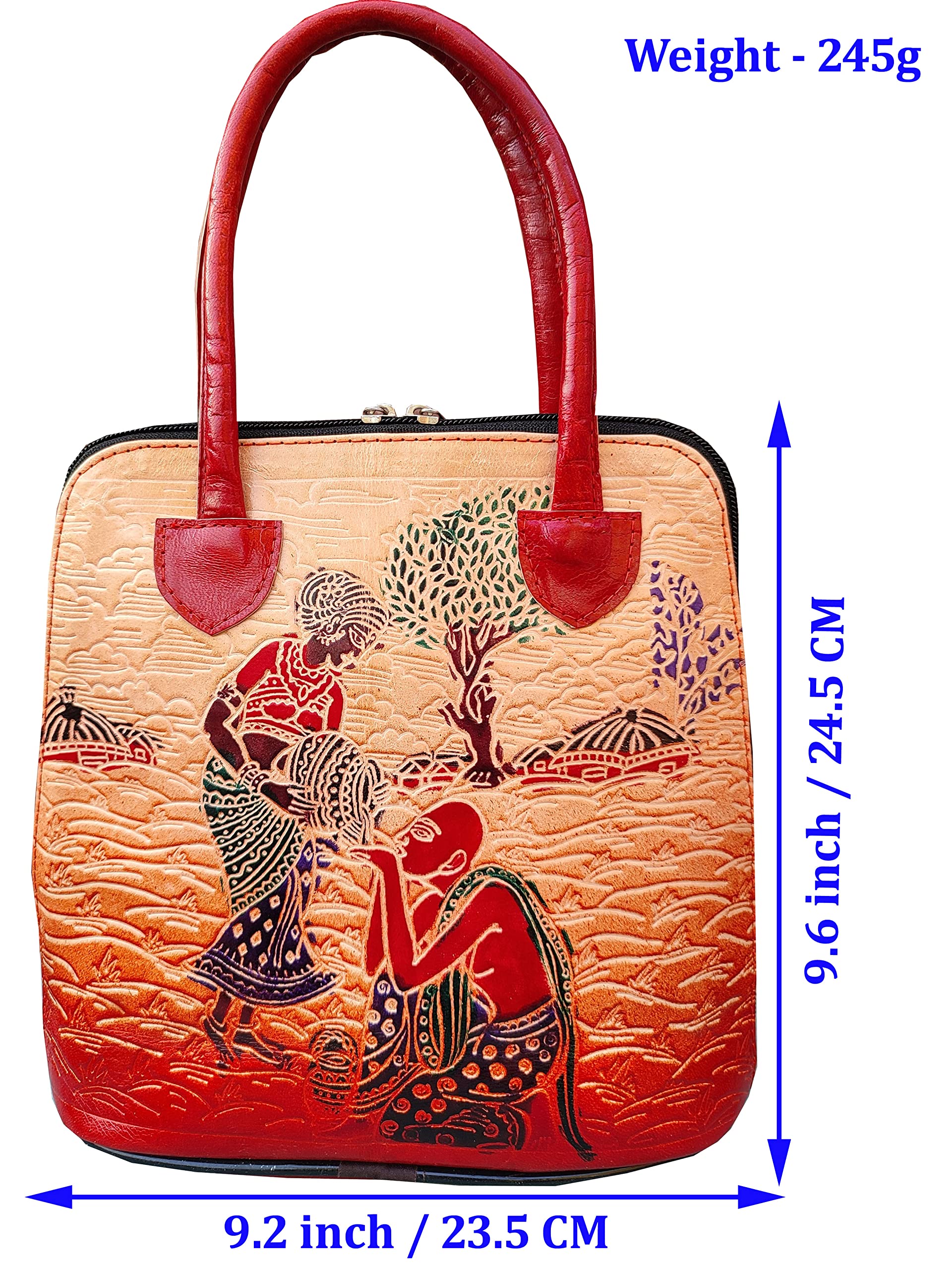 Handcrafted from Genuine Leather a Beautiful Ethnic Art of West Bengal. Design on Both Sides Double Handle One Main Zipper compartment One Zipper pocket in Back and Two zipper Compartments inside Closes fully with zip. This purse is a classic example of age old Shantiniketan craft which was introduced in West Bengal India during the 1940s. The Shantiniketan style evolved as a result of the Art Movement and these products have now become world famous for their applique batik and embossed craft work. The process of burnishing the leather gives it an elegant sheen and brings out the colors. The major embossing craft is done by hand and is an intricate process. After the final leather made it is then stitched into the desired product coated with a lacquer finish for making the product shiny and long lasting. We are happy for your interest SHANTINIKETAN EMBOSSED LEATHER PRODUCTS and artist of Shantinikan thanks to you.