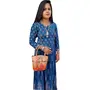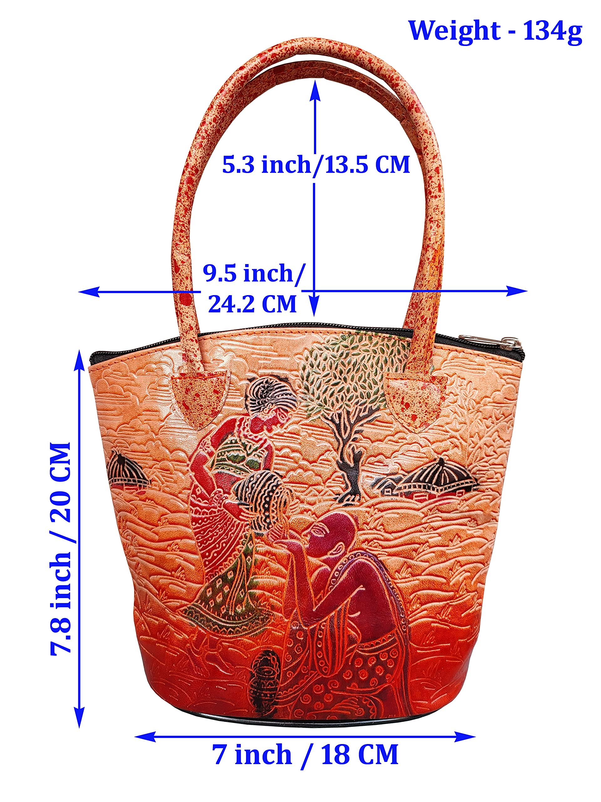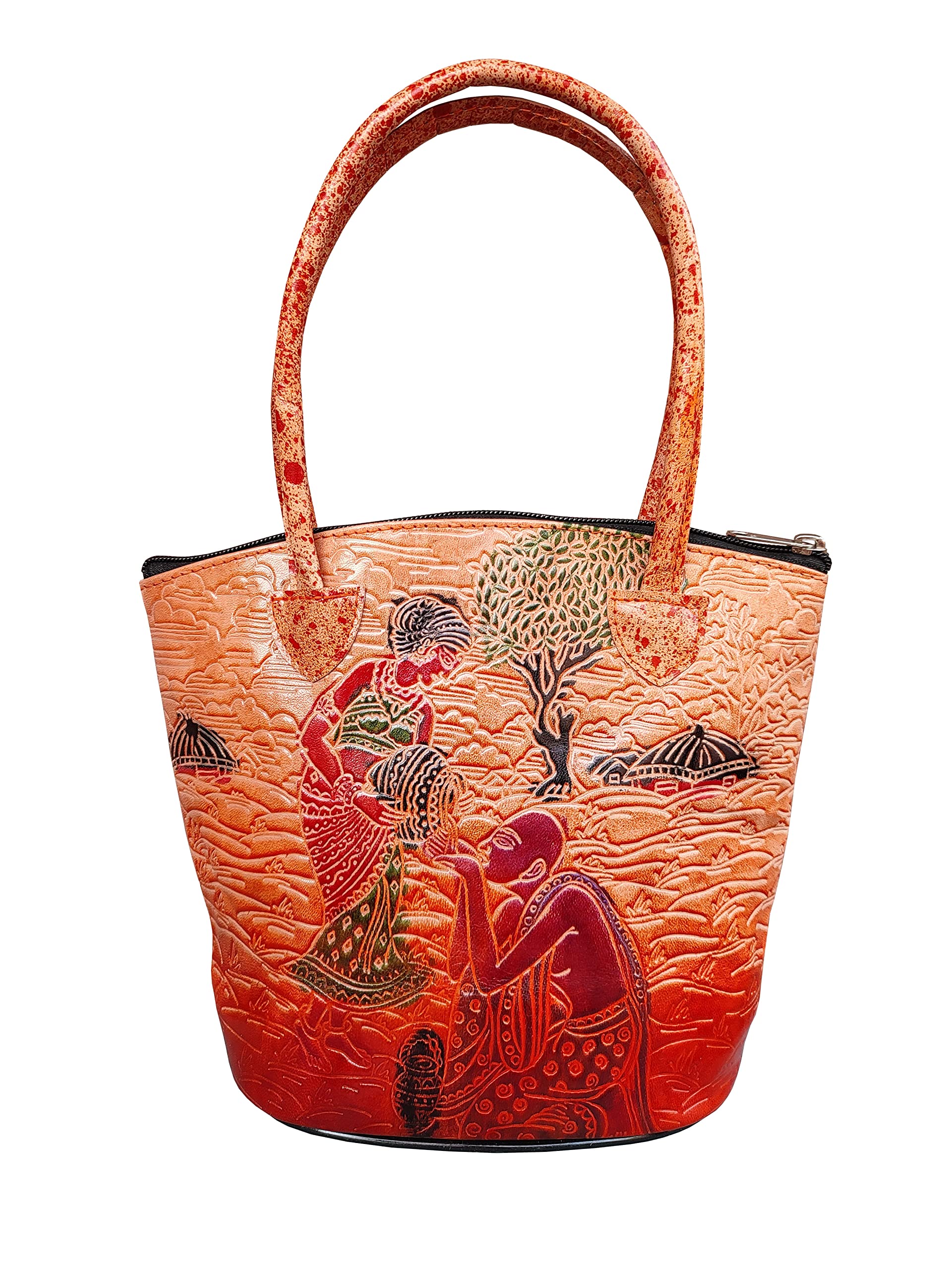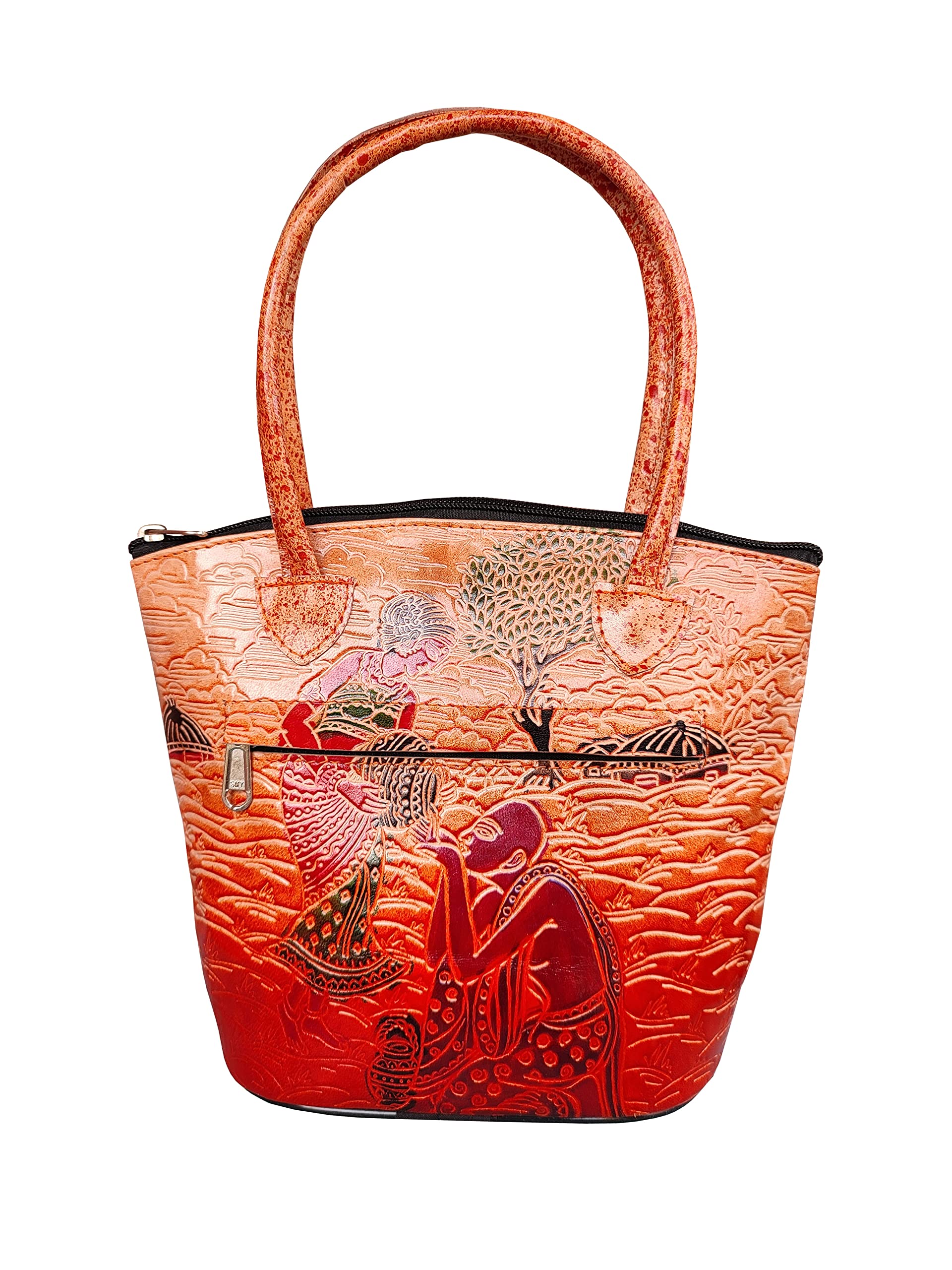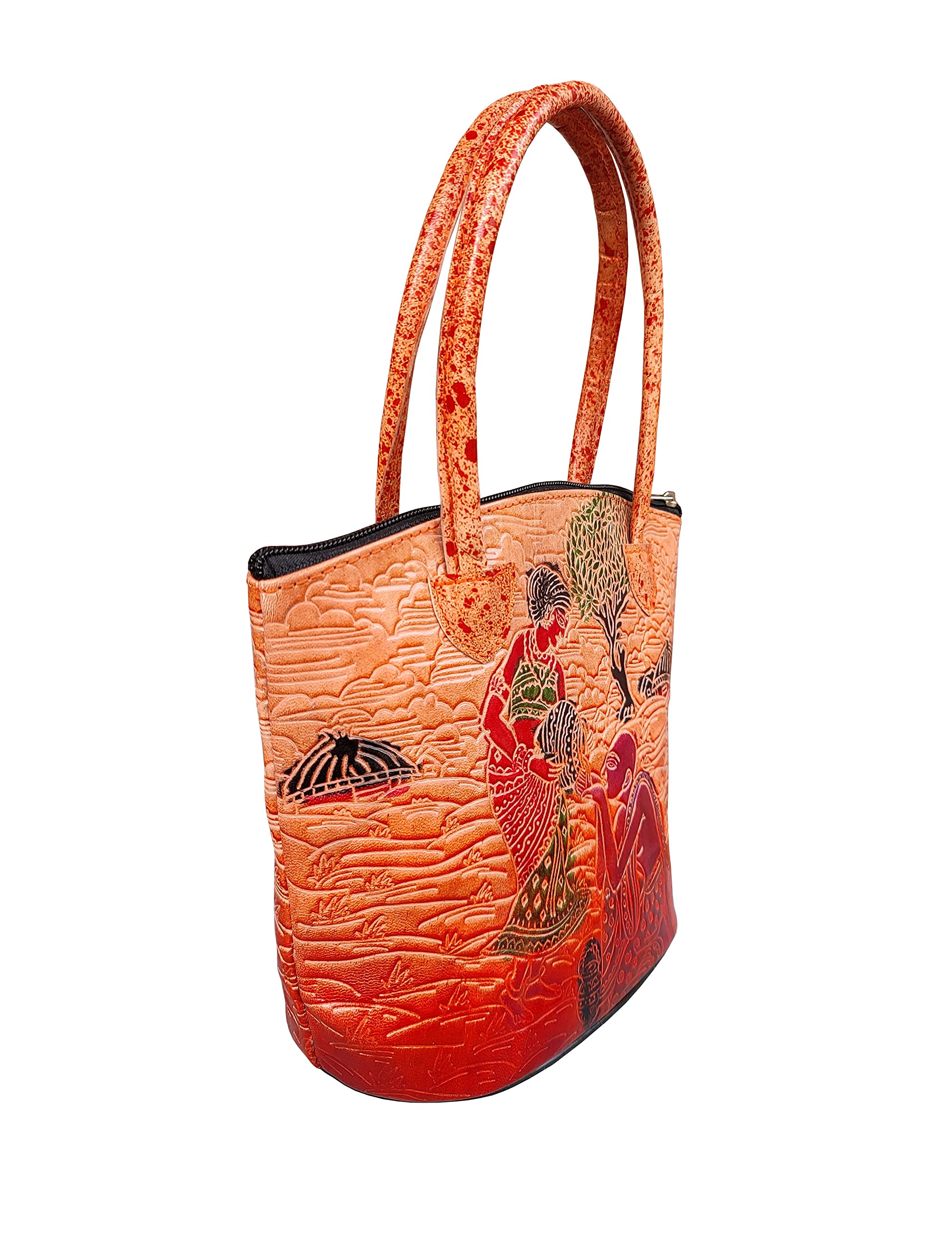 Handcrafted from Genuine Leather a Beautiful Ethnic Art of West Bengal. Design on Both Sides Double Handle One Main Zipper compartment and One zipper Cell phone compartment inside One Zipper pocket in Back. Closes fully with zip. This purse is a classic example of age old Shantiniketan craft which was introduced in West Bengal India during the 1940s. The Shantiniketan style evolved as a result of the Art Movement and these products have now become world famous for their applique batik and embossed craft work. The process of burnishing the leather gives it an elegant sheen and brings out the colors. The major embossing craft is done by hand and is an intricate process. After the final leather made it is then stitched into the desired product coated with a lacquer finish for making the product shiny and long lasting. We are happy for your interest SHANTINIKETAN EMBOSSED LEATHER PRODUCTS and artist of Shantinikan thanks to you.