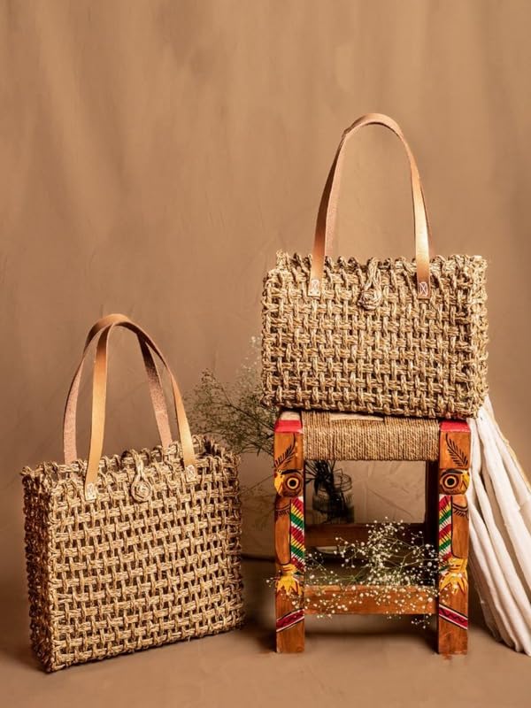 SIKKI CRAFThaat Handmade Zari Mesh Sabai Grass Bag |The natural Sabai zari mesh bag is a gorgeous blend of rustic charm and elegant detailing. Made from Sabai grass the bag features a delicate mesh design with hints of shimmering zari thread. It's perfect for adding a touch of glamour to your everyday style or for special occasions. Get ready to turn heads with this unique and beautiful accessory.