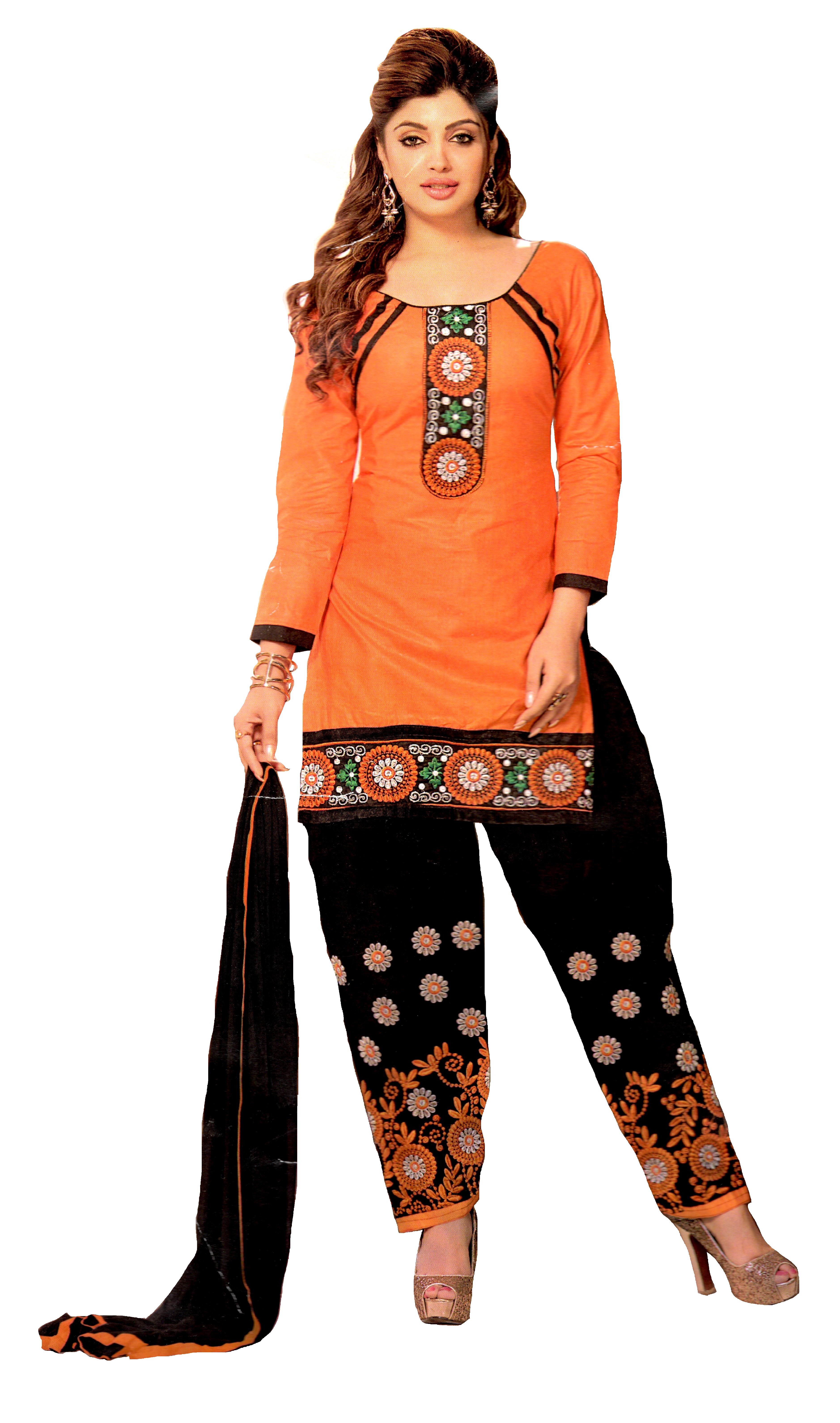 MAHATI cotton orange embroidered salwar suits - Top 2.5m Bottom 2.4 m Dupatta 2.5 m. For stitched suits (with lining) - Size in Inches: Height 46 - Size :S 36 M 38 L 40 XL 42 XXL 44 3XL 46 4XL 48 5XL 50 - Handwash - Dry in Shade - YOU MAKE A MARK WHEN YOU WEAR MAHATI