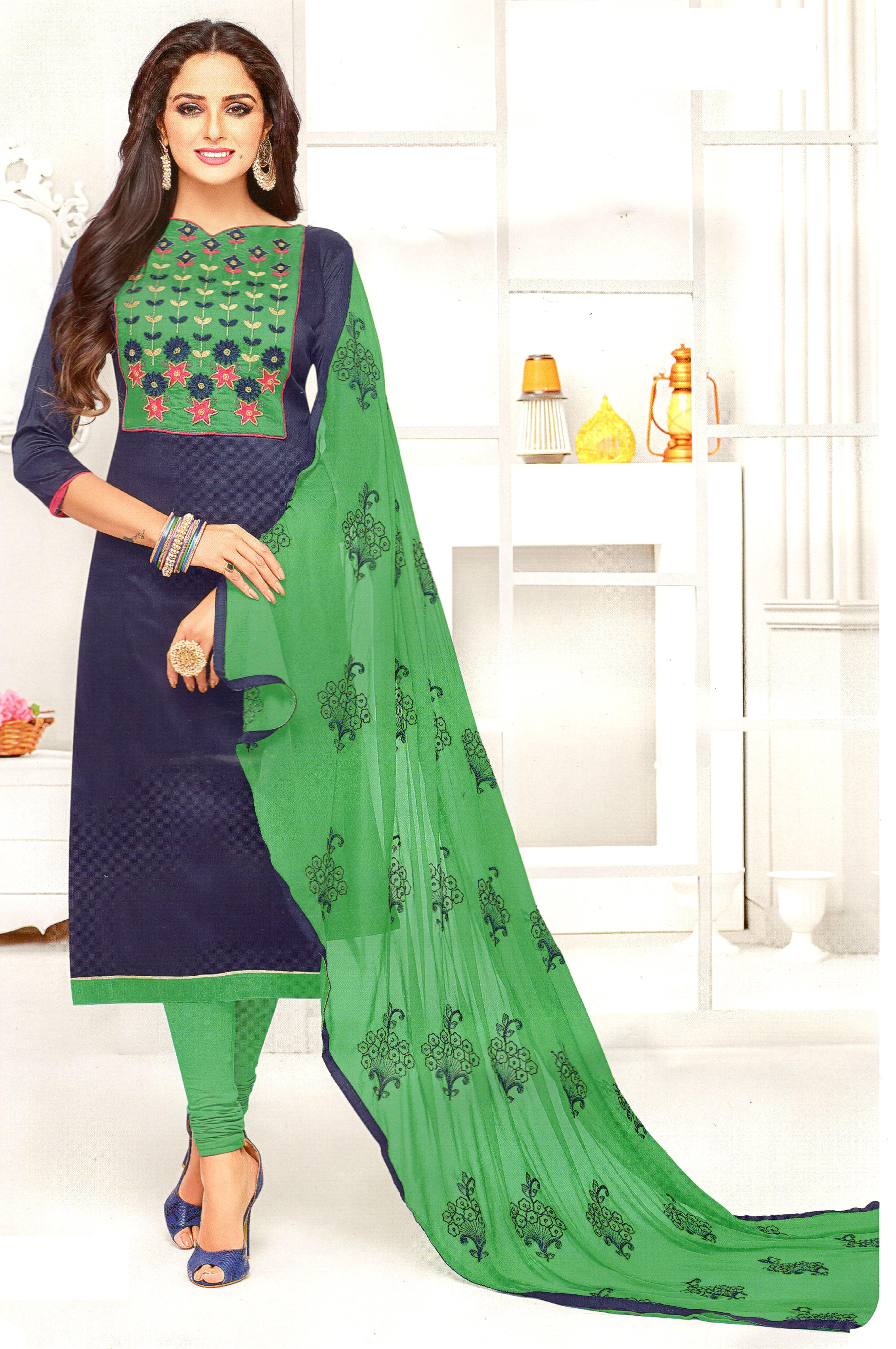MAHATI cotton blue embroidered salwar suits - Top 2.5m Bottom 2.4 m Dupatta 2.5 m. For stitched suits (with lining) - Size in Inches: Height 46 - Size :S 36 M 38 L 40 XL 42 XXL 44 3XL 46 4XL 48 5XL 50 - Handwash - Dry in Shade - YOU MAKE A MARK WHEN YOU WEAR MAHATI