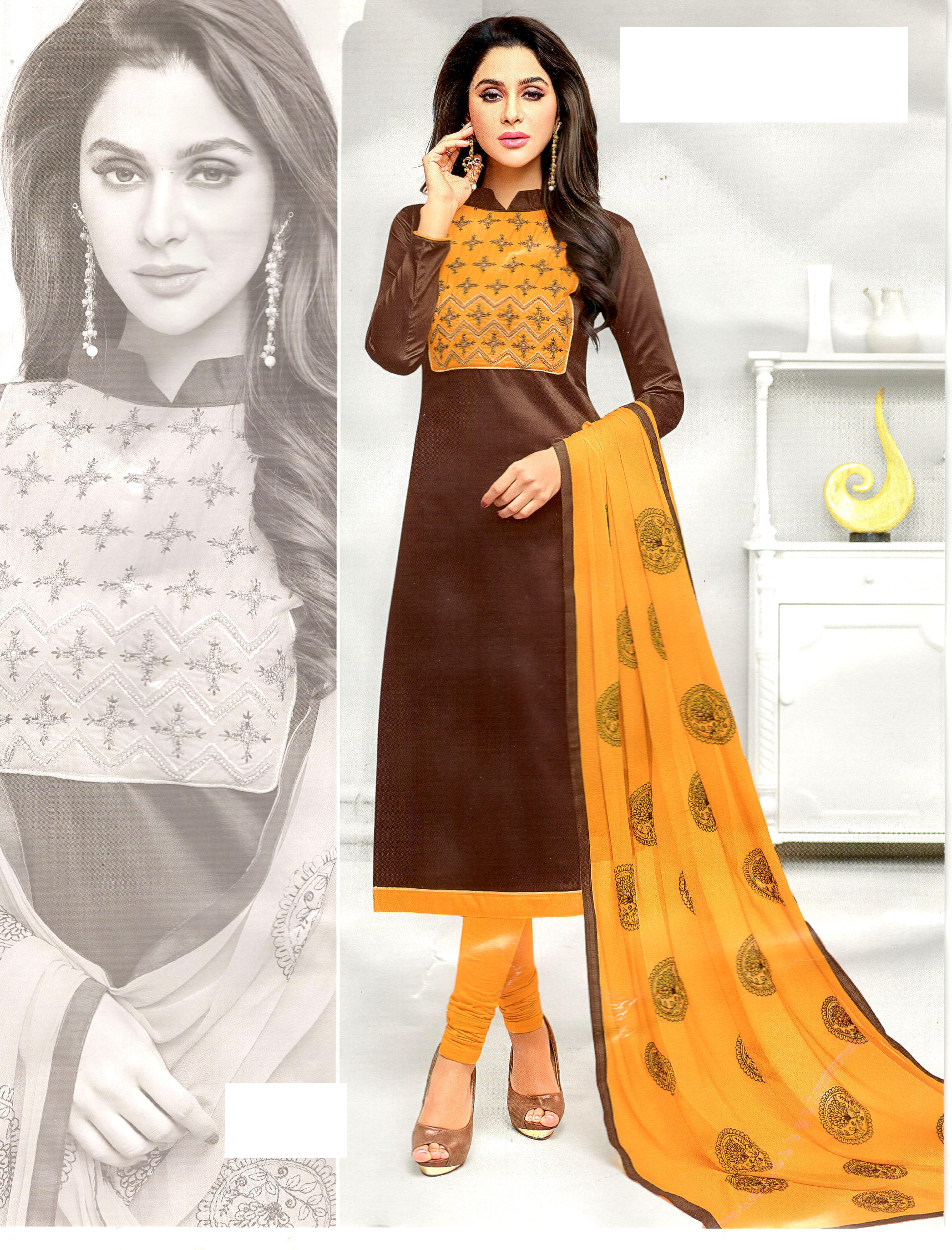 MAHATI cotton brown embroidered salwar suits - Top 2.5m Bottom 2.4 m Dupatta 2.5 m. For stitched suits (with lining) - Size in Inches: Height 46 - Size :S 36 M 38 L 40 XL 42 XXL 44 3XL 46 4XL 48 5XL 50 - Handwash - Dry in Shade - YOU MAKE A MARK WHEN YOU WEAR MAHATI