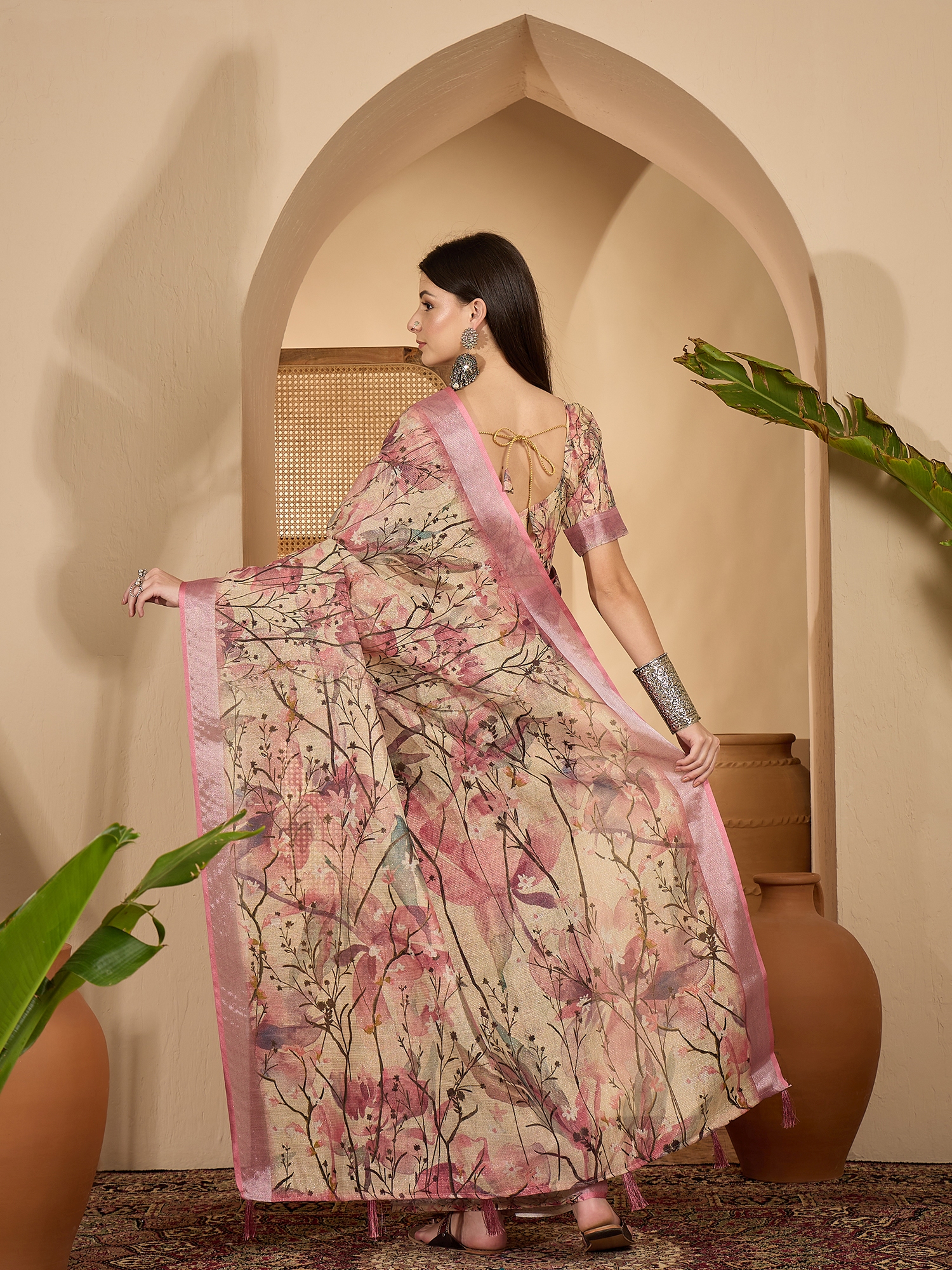 • Saree Work-Digital Print ,Blouse Work- Linen Zari Gold