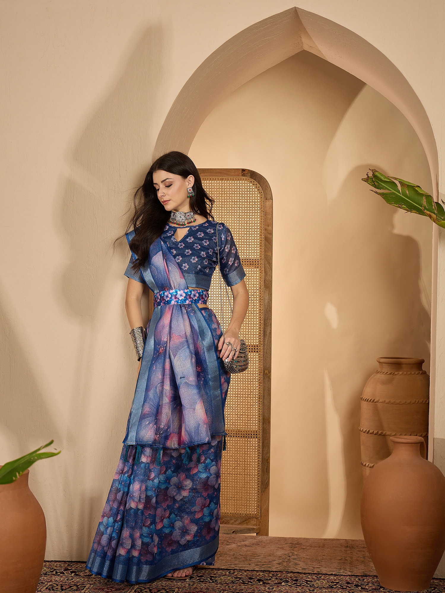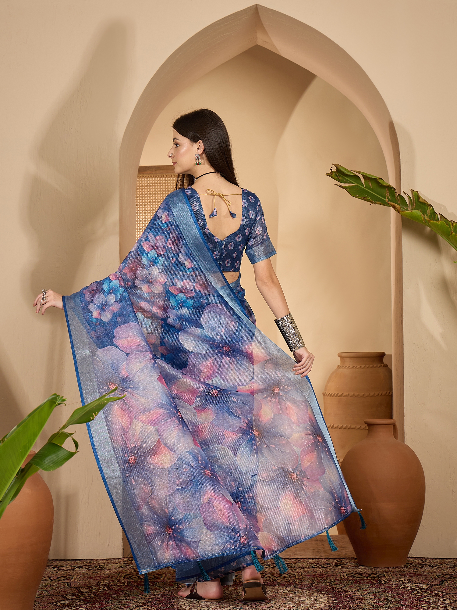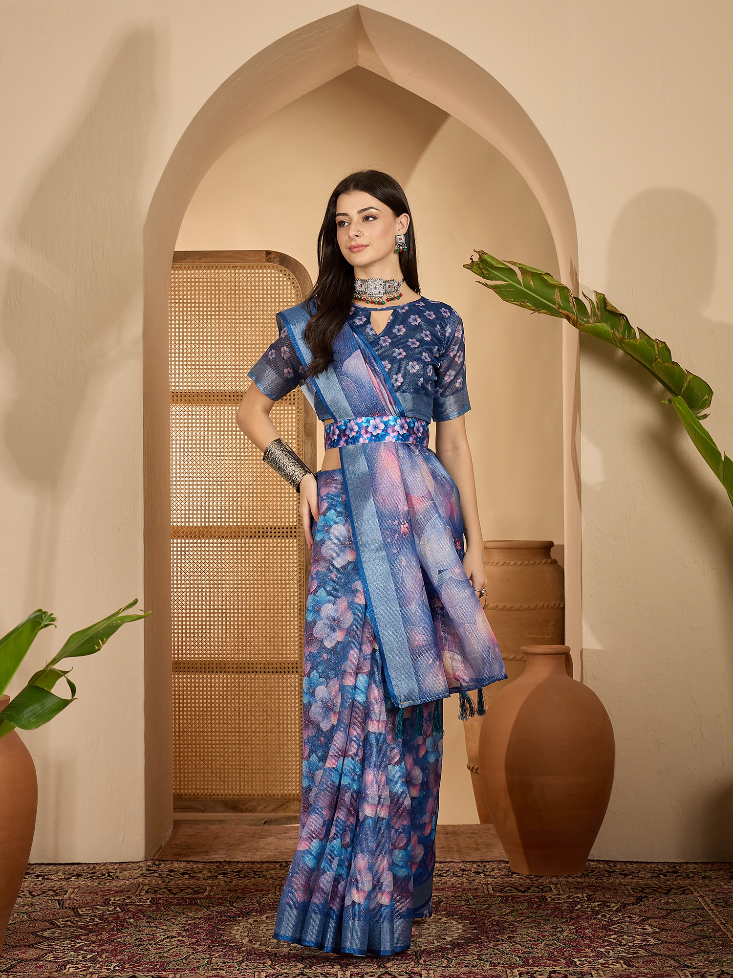 • Saree Work-Digital Print ,Blouse Work- Linen Zari Silver