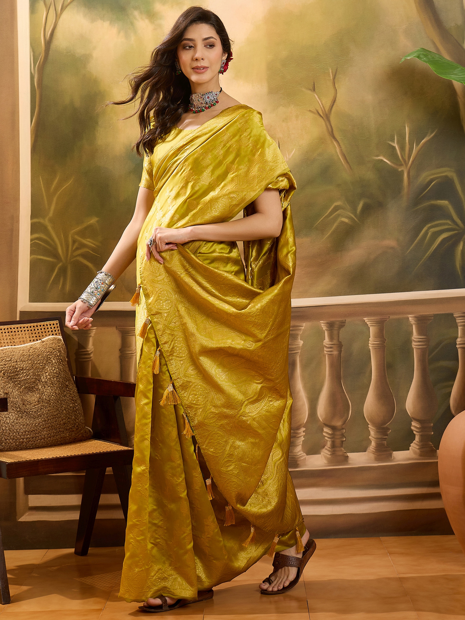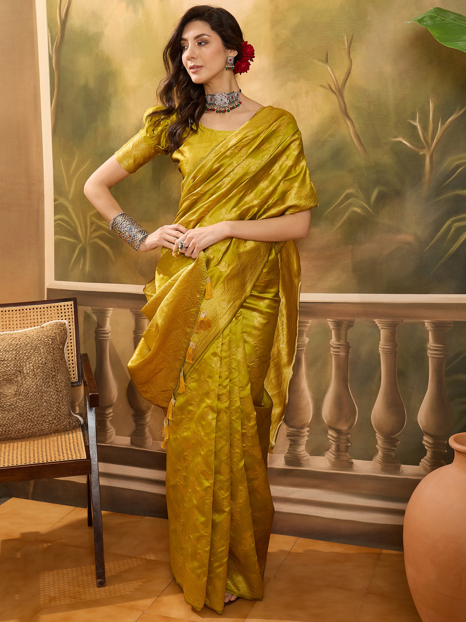AASTHA FASHION Fashion Dream Womens Lime Green Banarasi Jacquard Saree | Soft & Elegant Traditional Wear