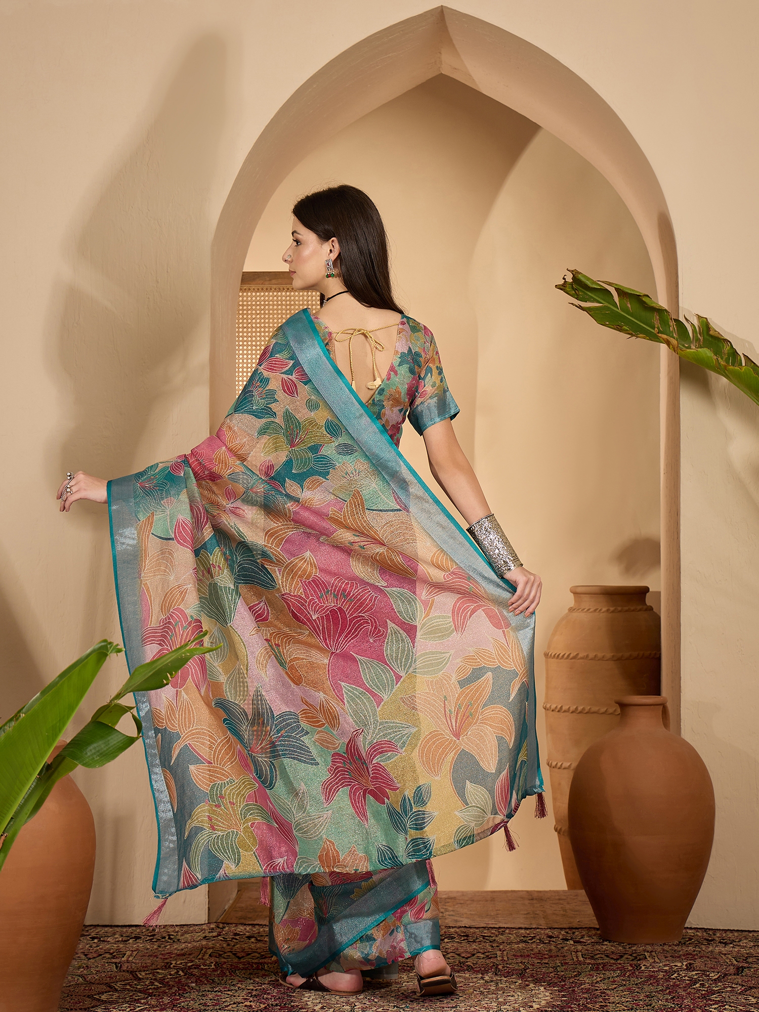 • Saree Work-Digital Print ,Blouse Work- Linen Zari Gold