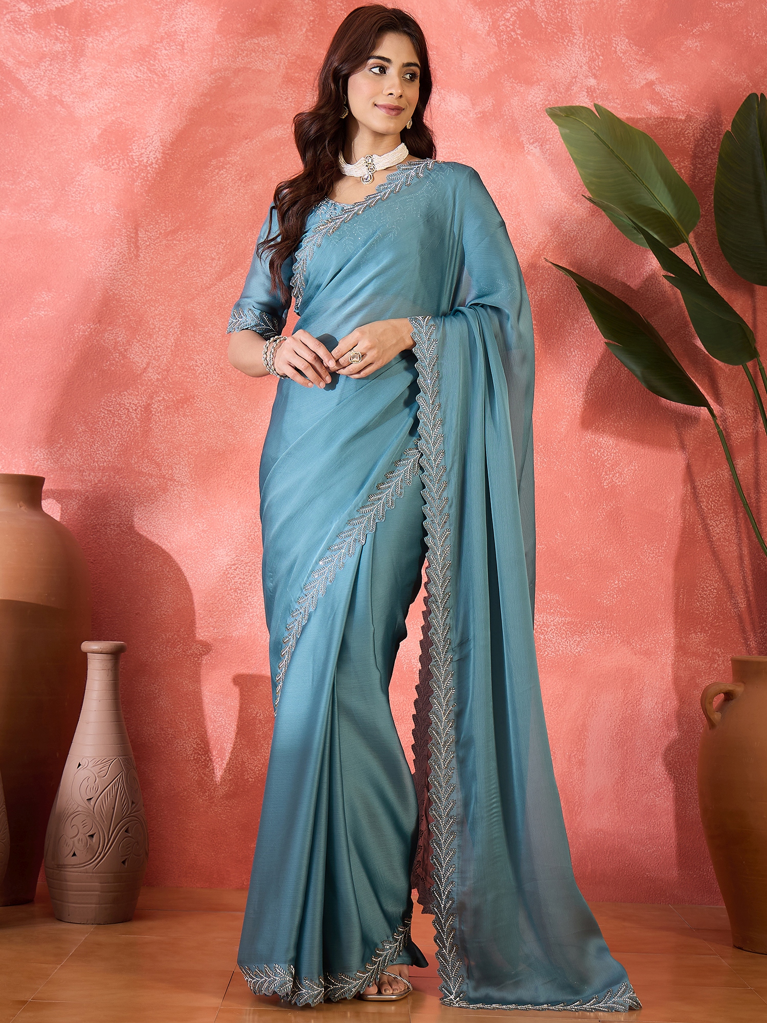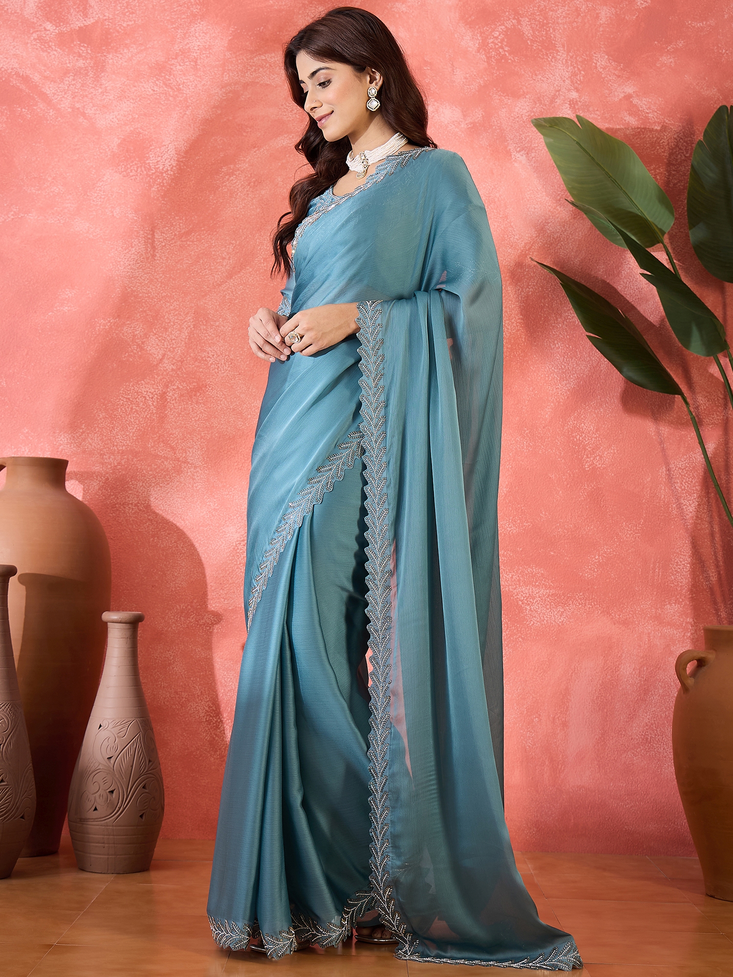 AASTHA FASHION Fashion Dream Womens Teal Heavy Satin Chiffon Saree | Soft & Elegant Traditional Wear