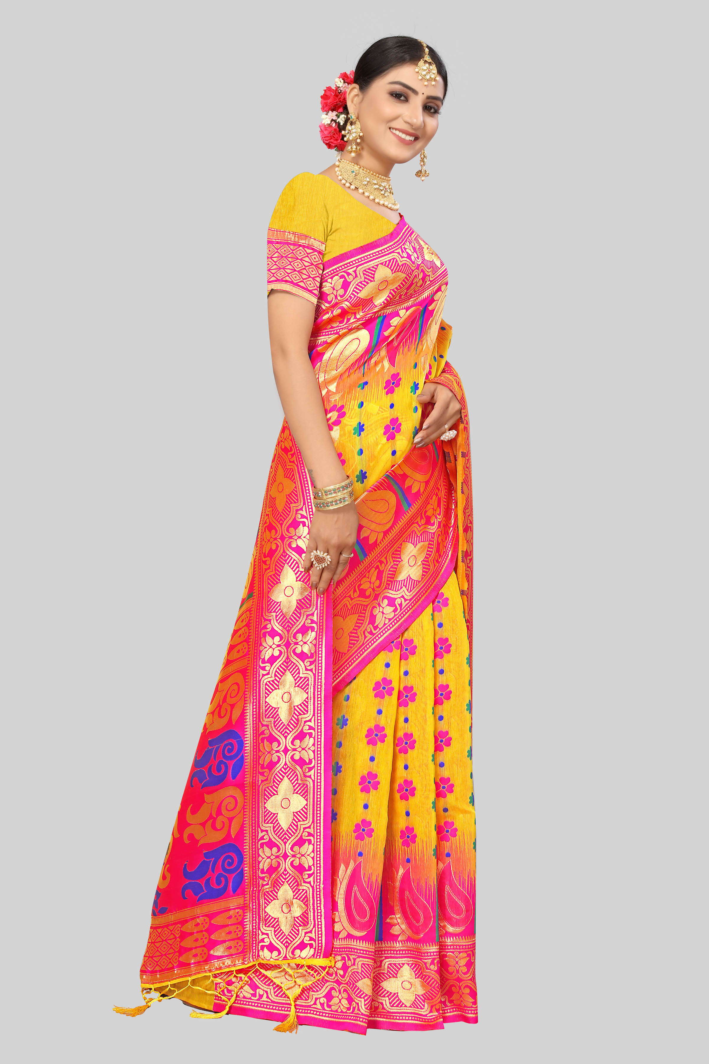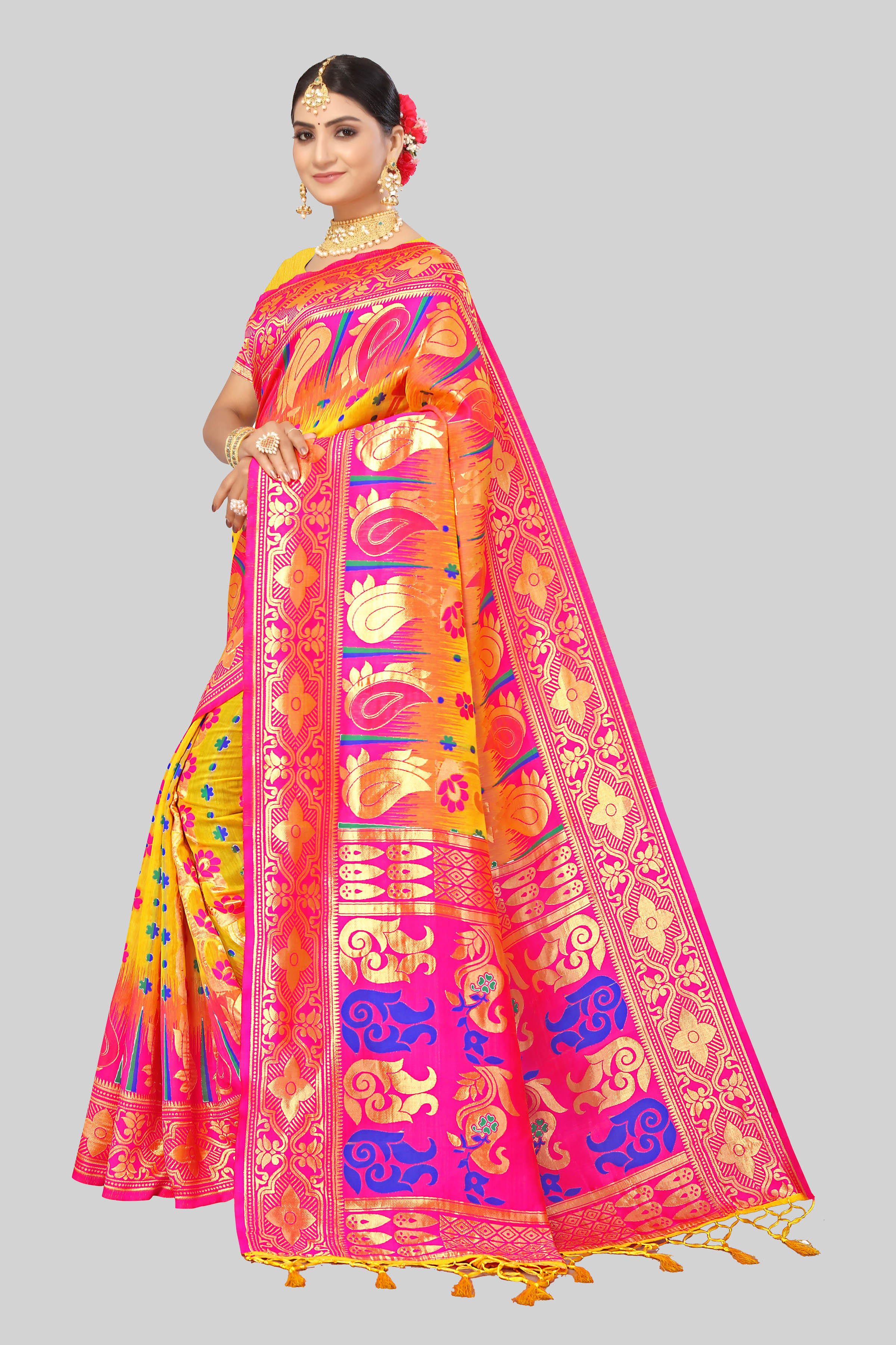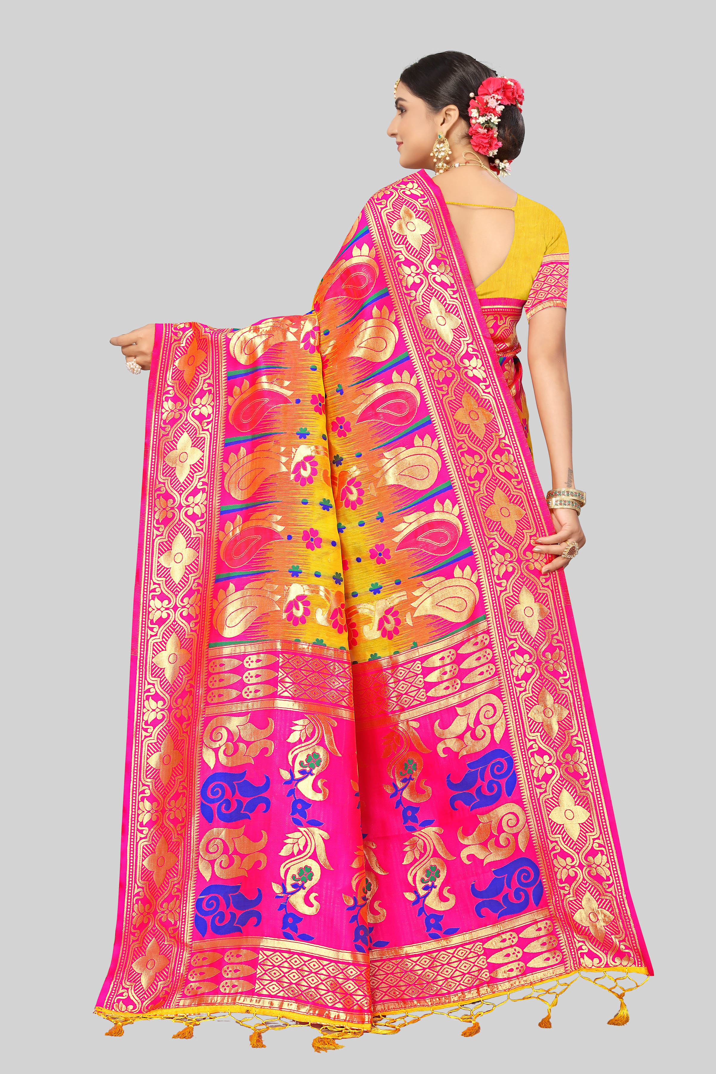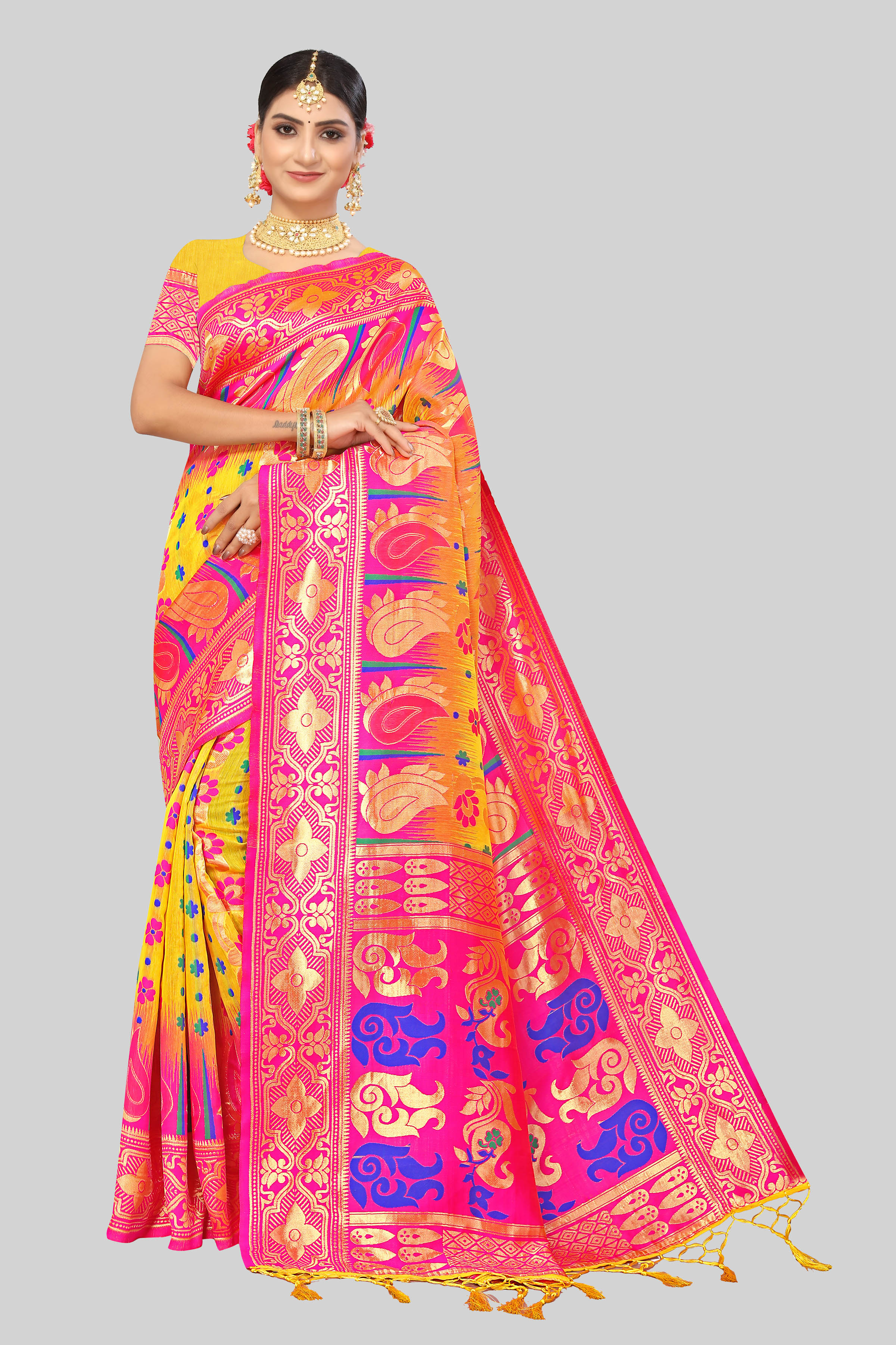 AASTHA FASHION Fashion Dream Womens Yellow,Pink Banarasi Silk Saree | Soft & Elegant Traditional Wear