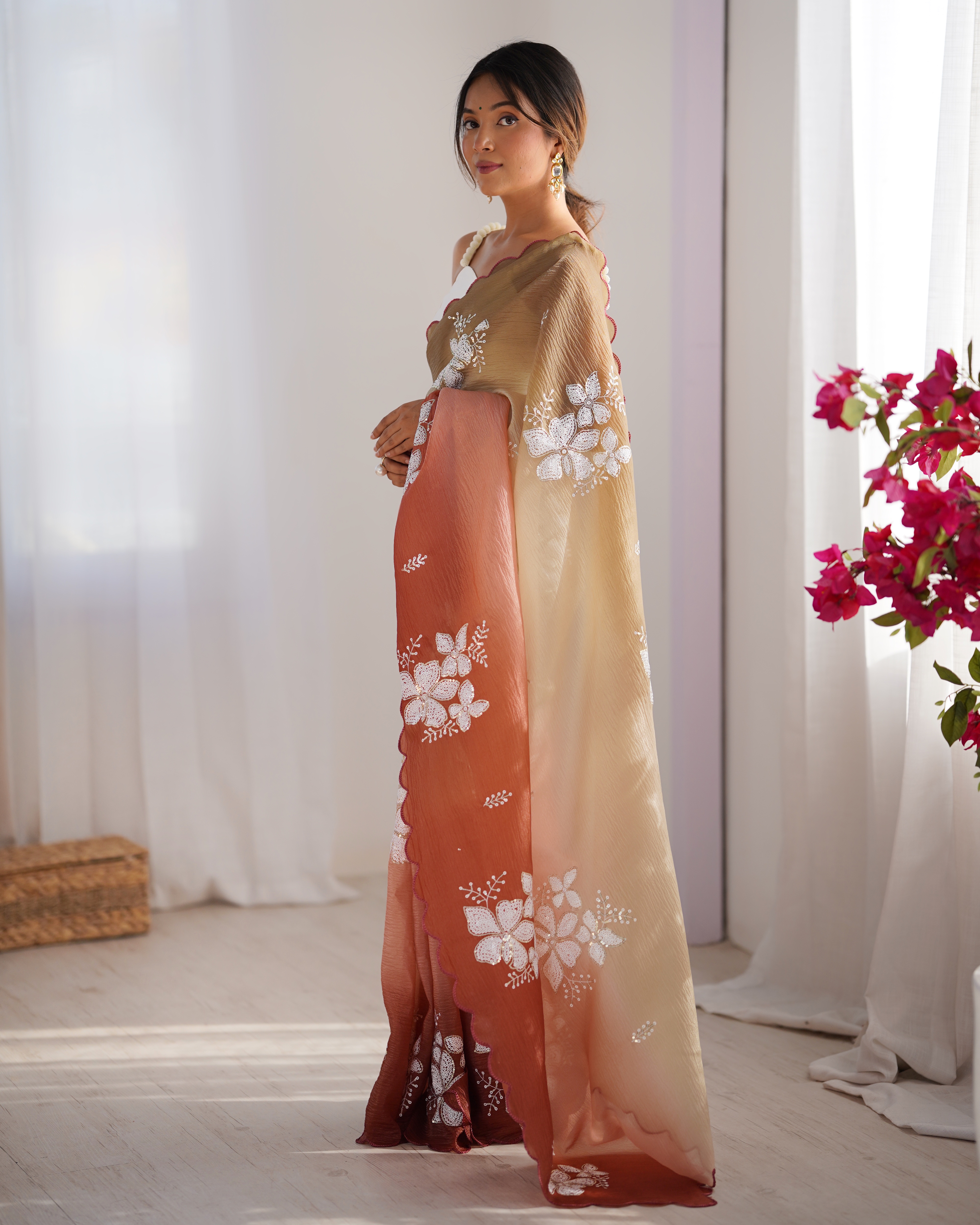 Looking These Party Wear Saree in Fine Dual Shaded Colored.These Saree Are Crunchy Crush And Blouse is Satin Silk Fabricated.Its Beautified With Pedding Color Printed With Designer Dual Sequance Embroidery Work.