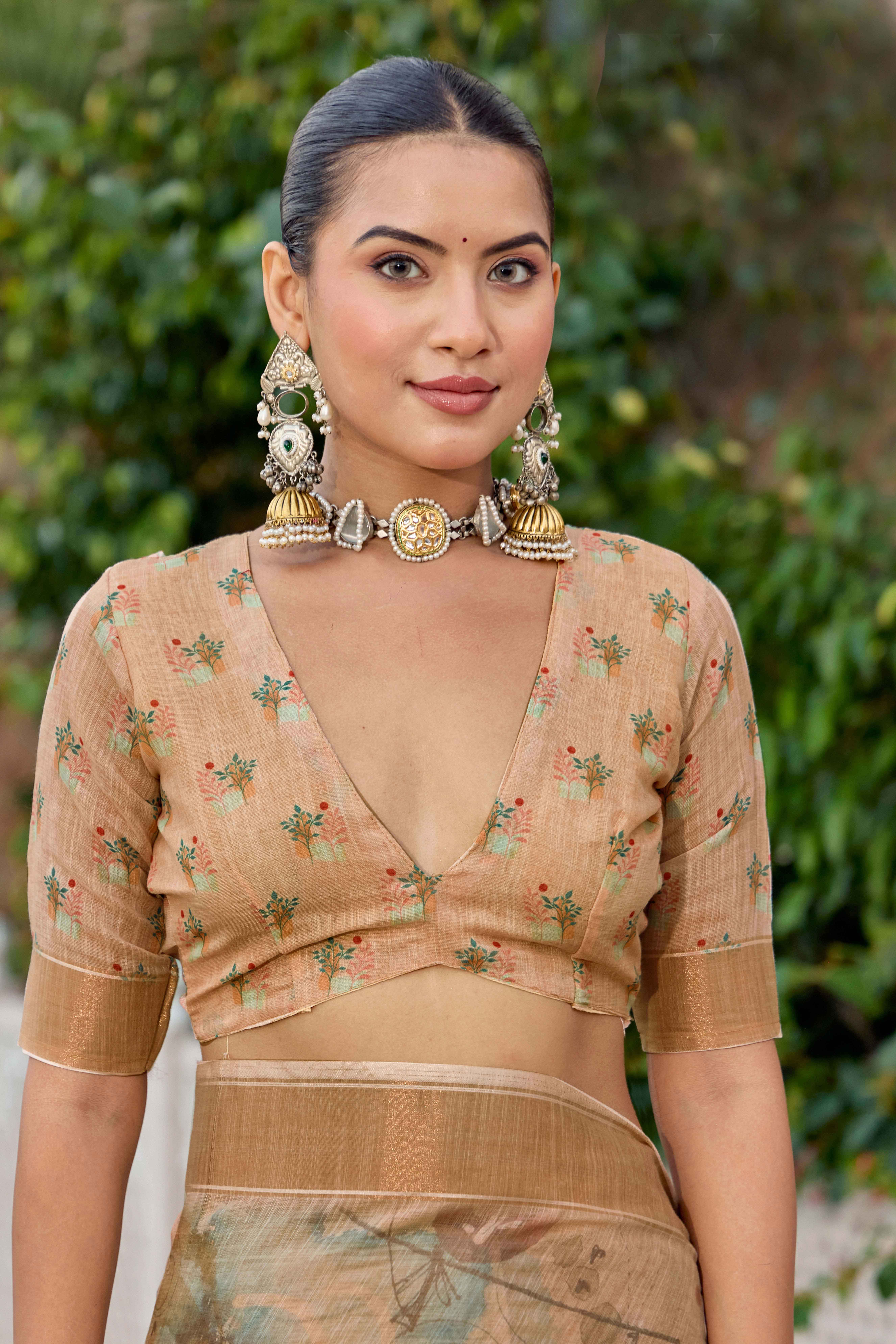 Beige Color Beautiful Linen Silk Fabric Saree With Sophisticated Partywear Saree
