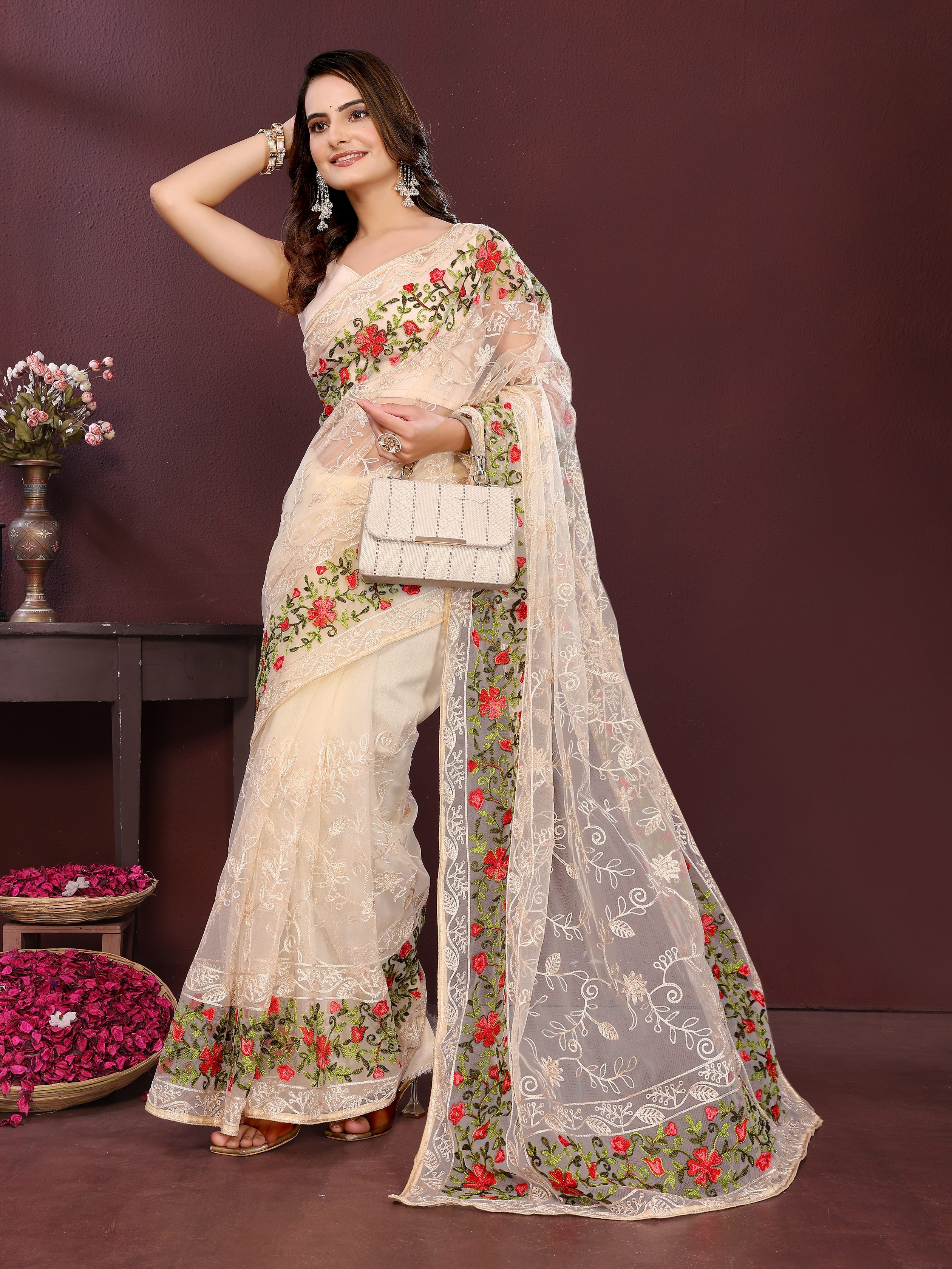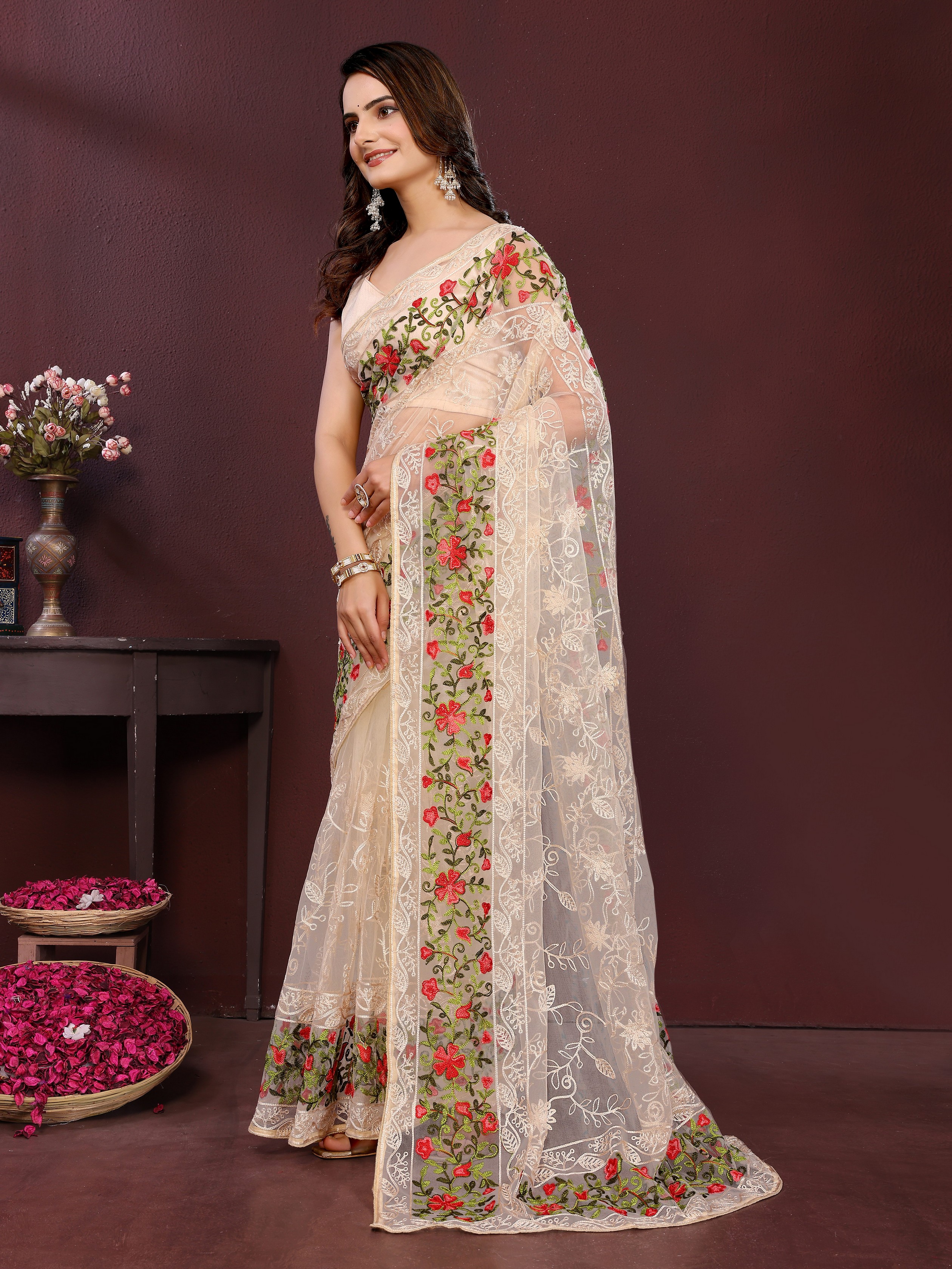 Beige Color Net Fabric Designer Embroidery Work Ethnic Partywear Saree