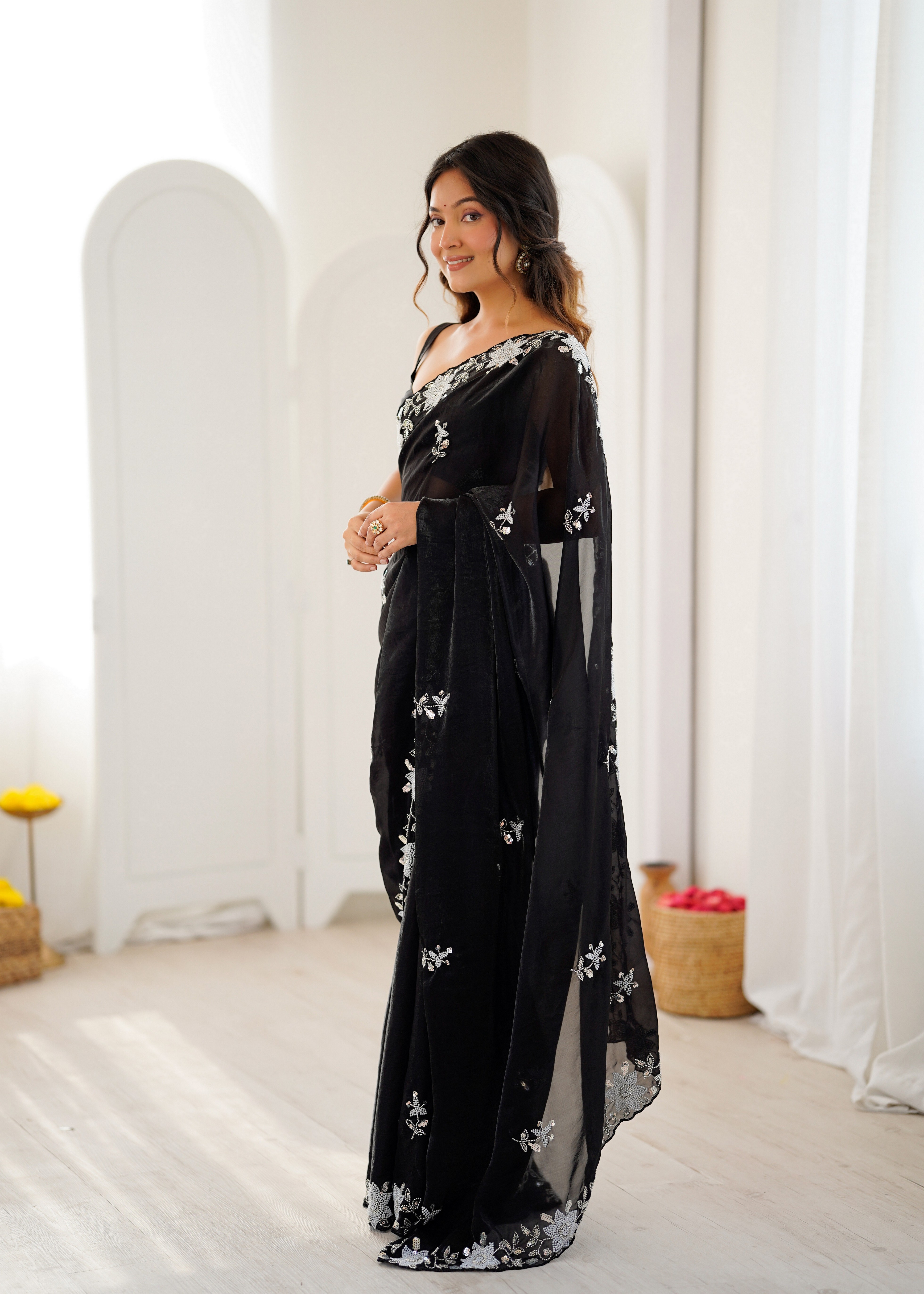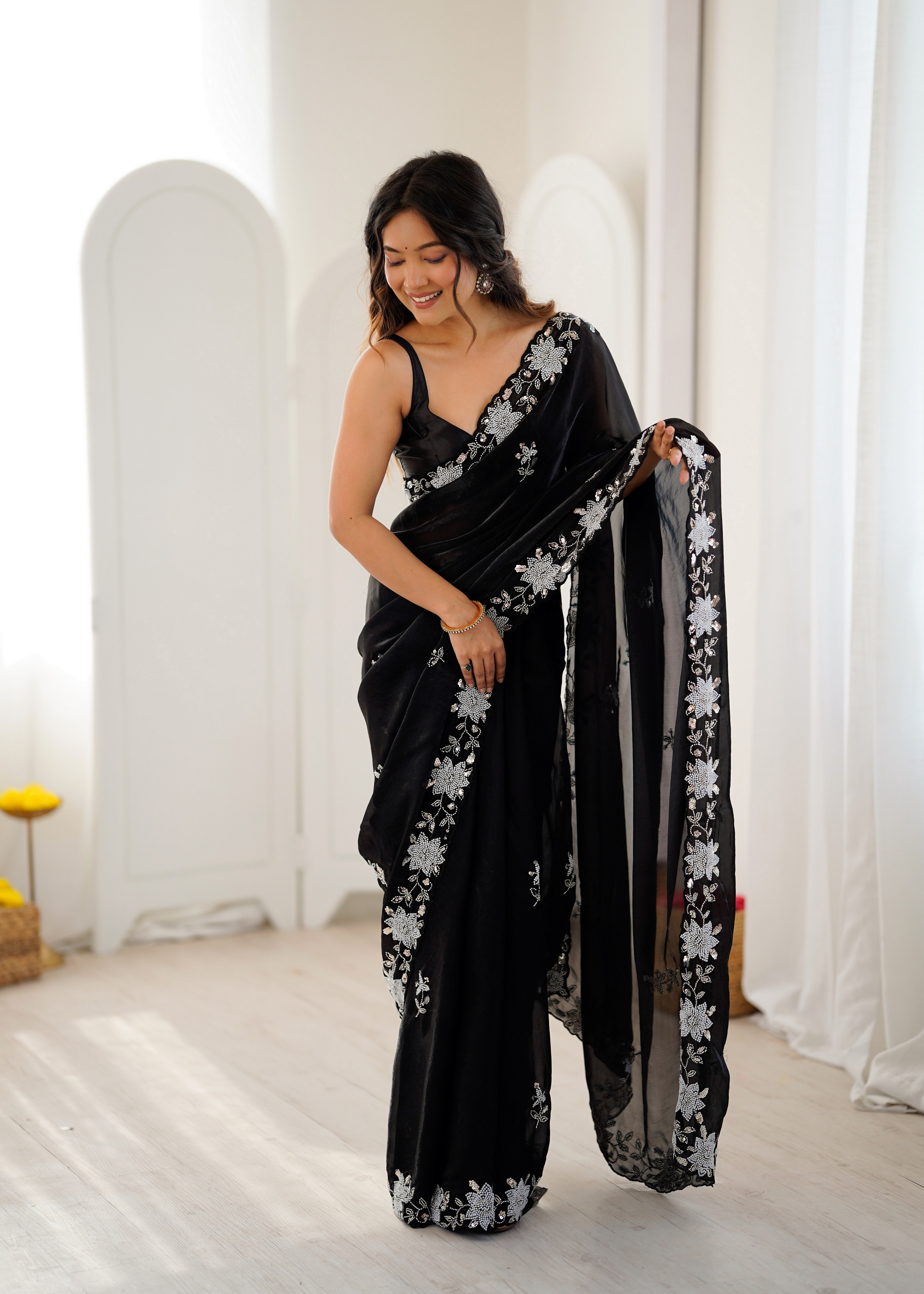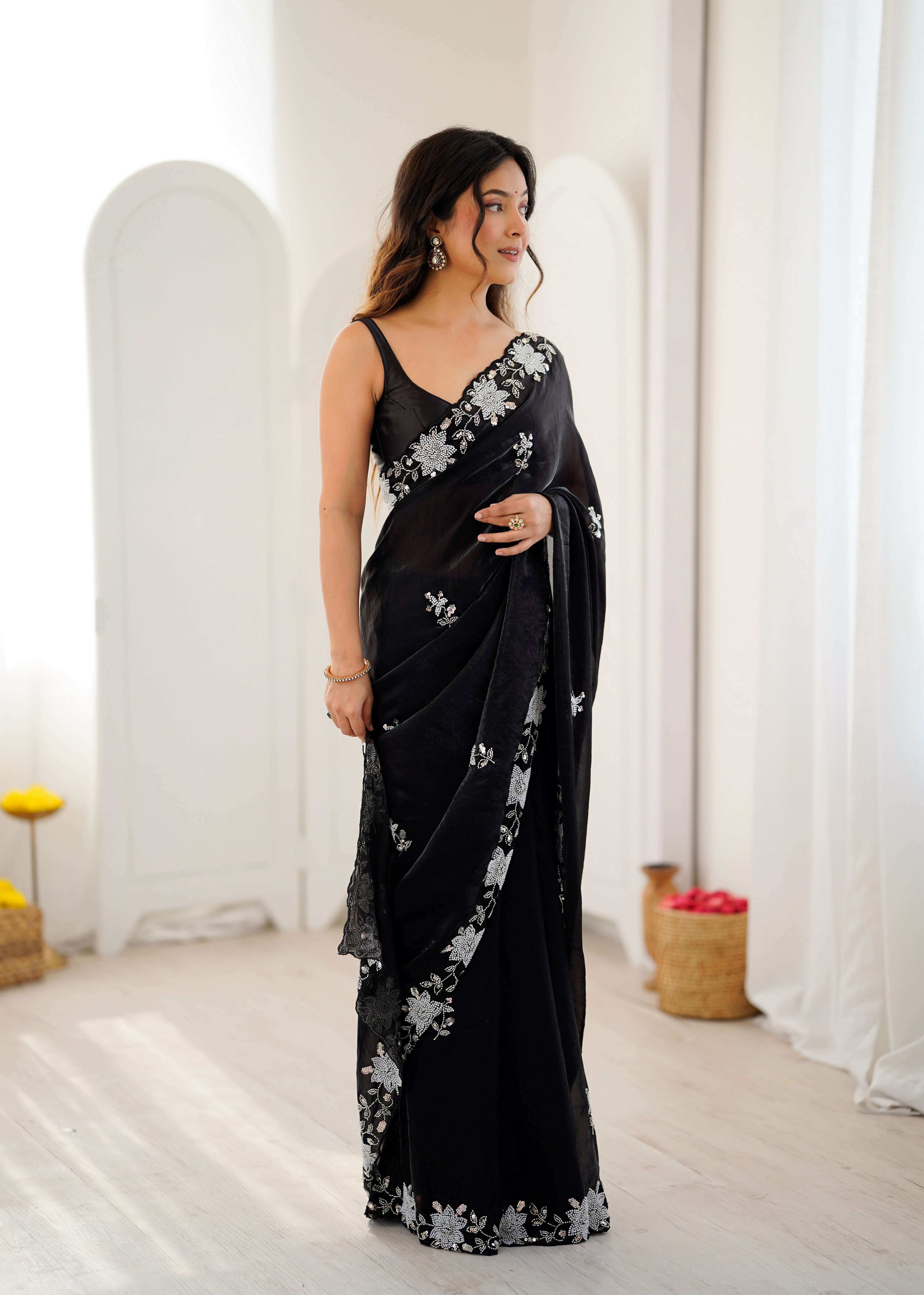 Black Color Fendy Satin Graceful Embroidered Bollywood Saree