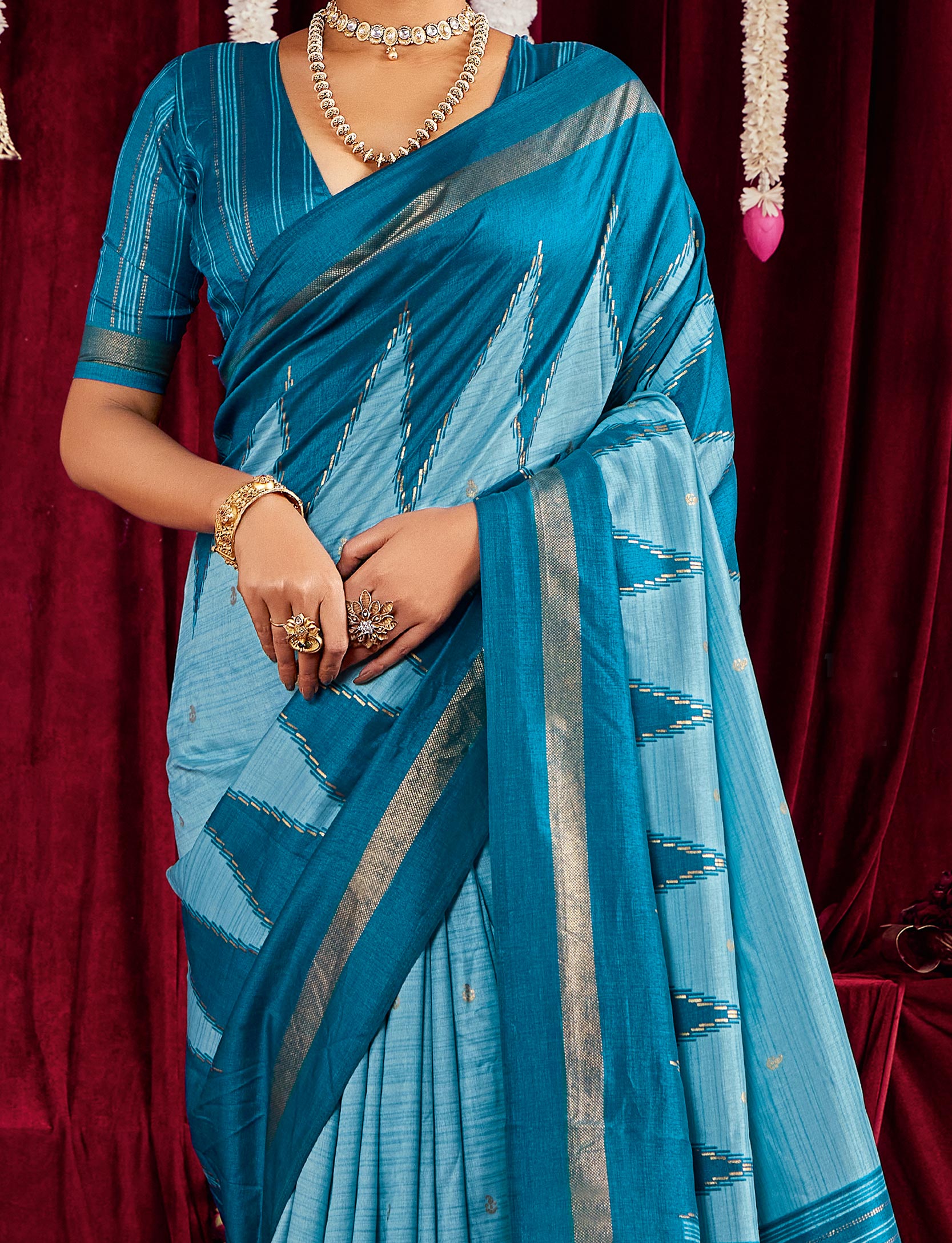Blue Color Ikkat Silk Fabric Designer Zig Zag Printed Traditional Party Looks Saree