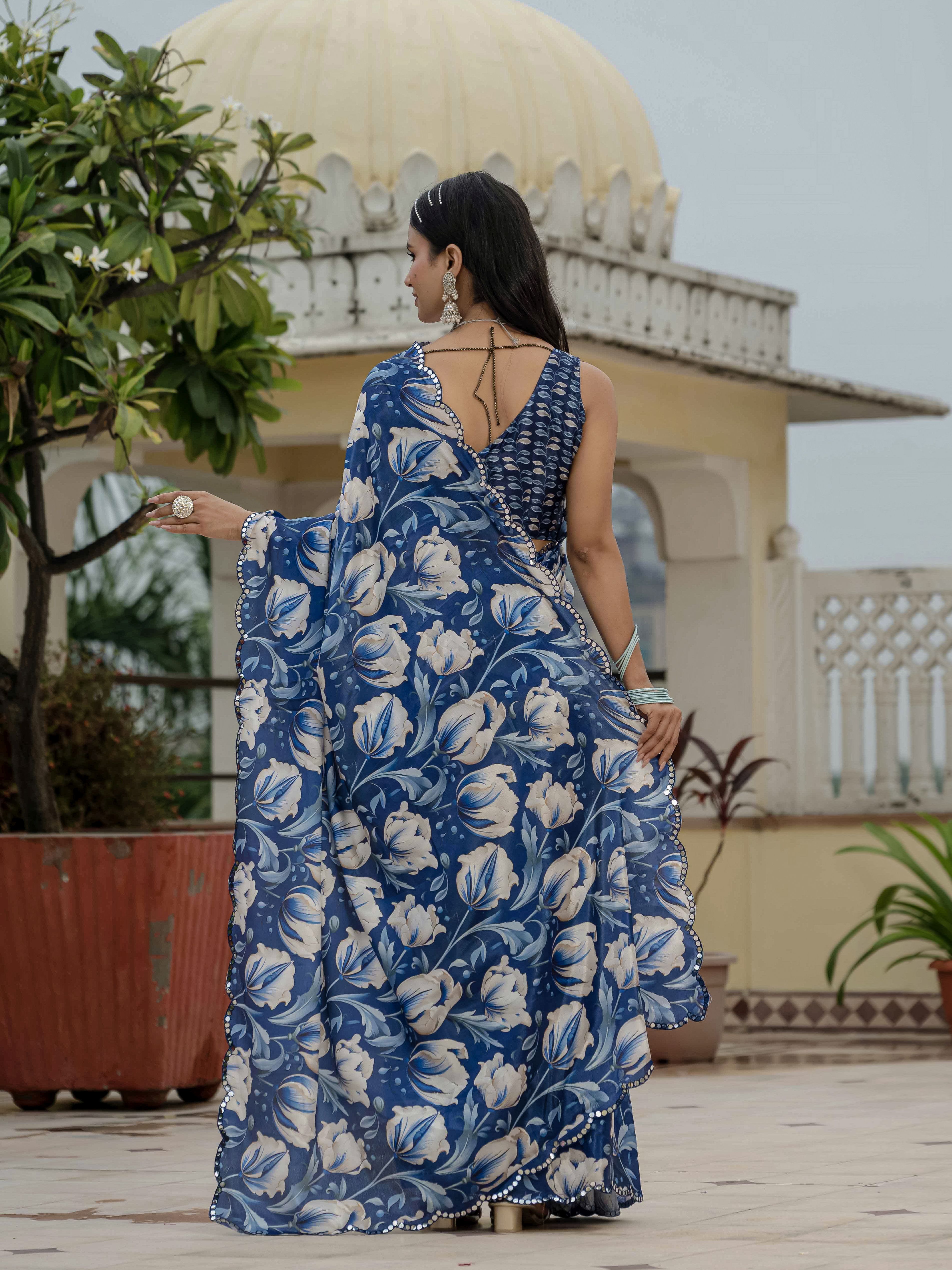 Blue Color Stylish Ready To Wear Chinon Fabric Partywear Saree