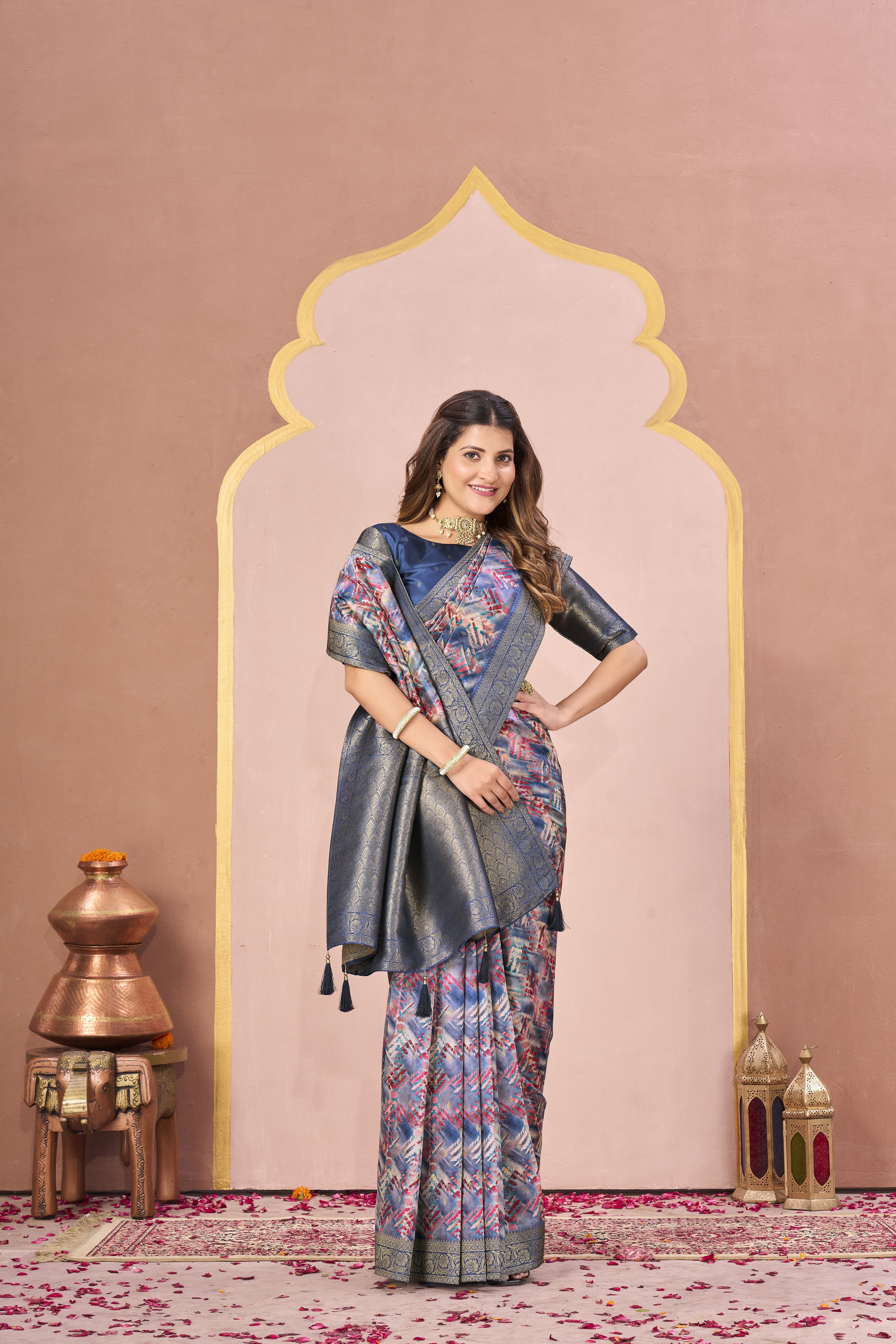 Blue Color Tussar Silk Designer Printed Saree With Woven Designer