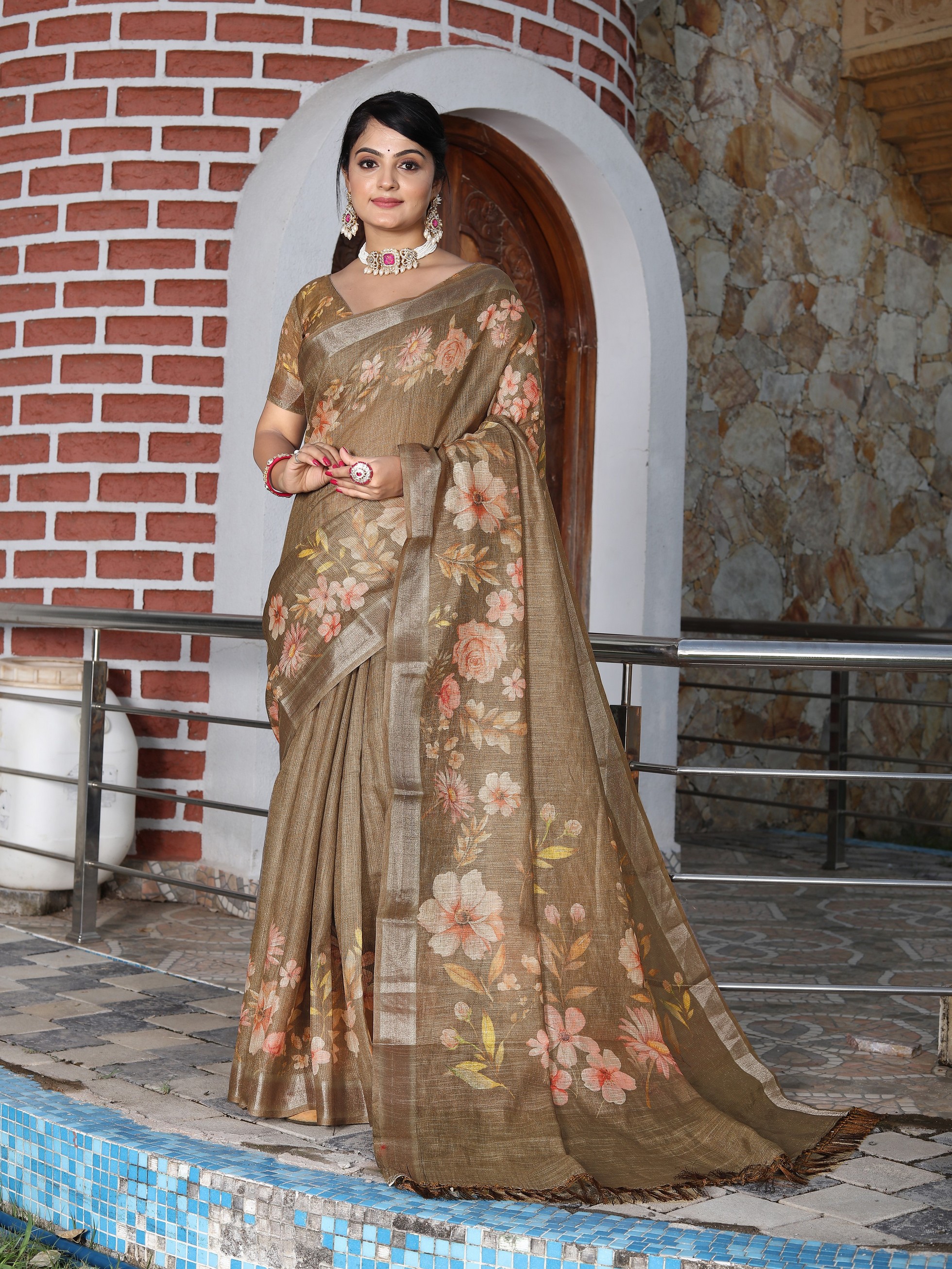 Brown Color Cotton Shimmer Fabric Smart Printed Saree With Woven Border