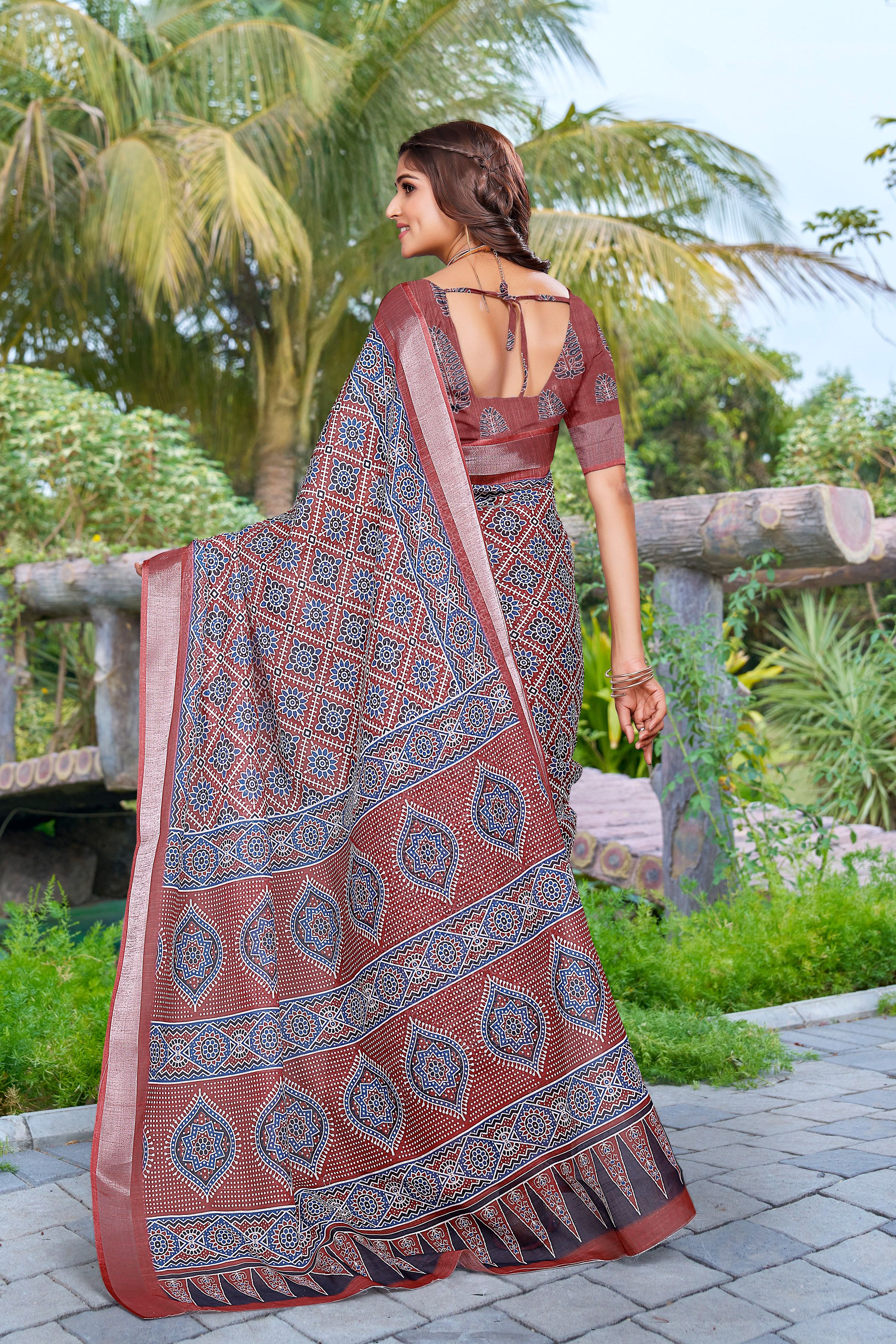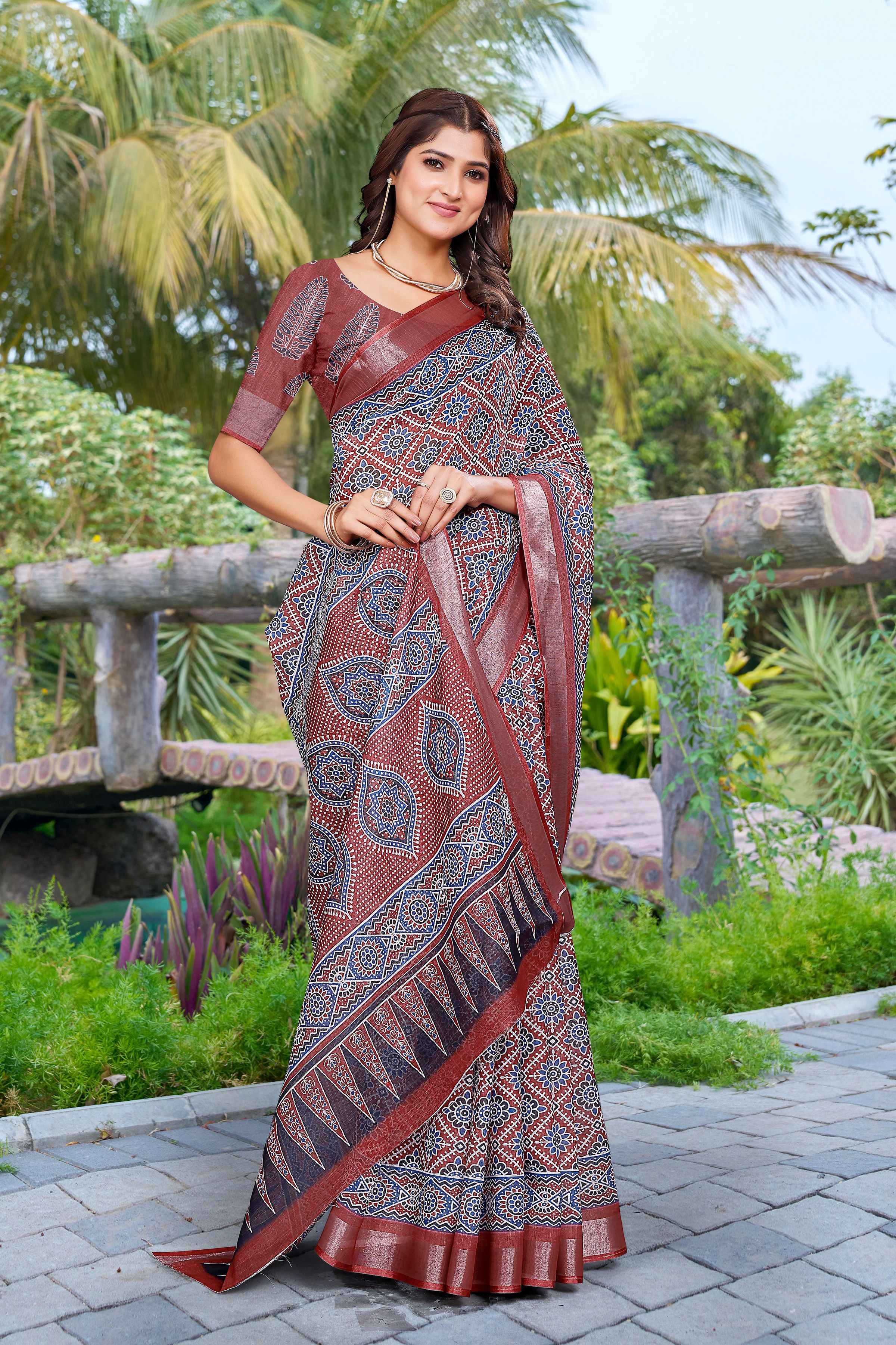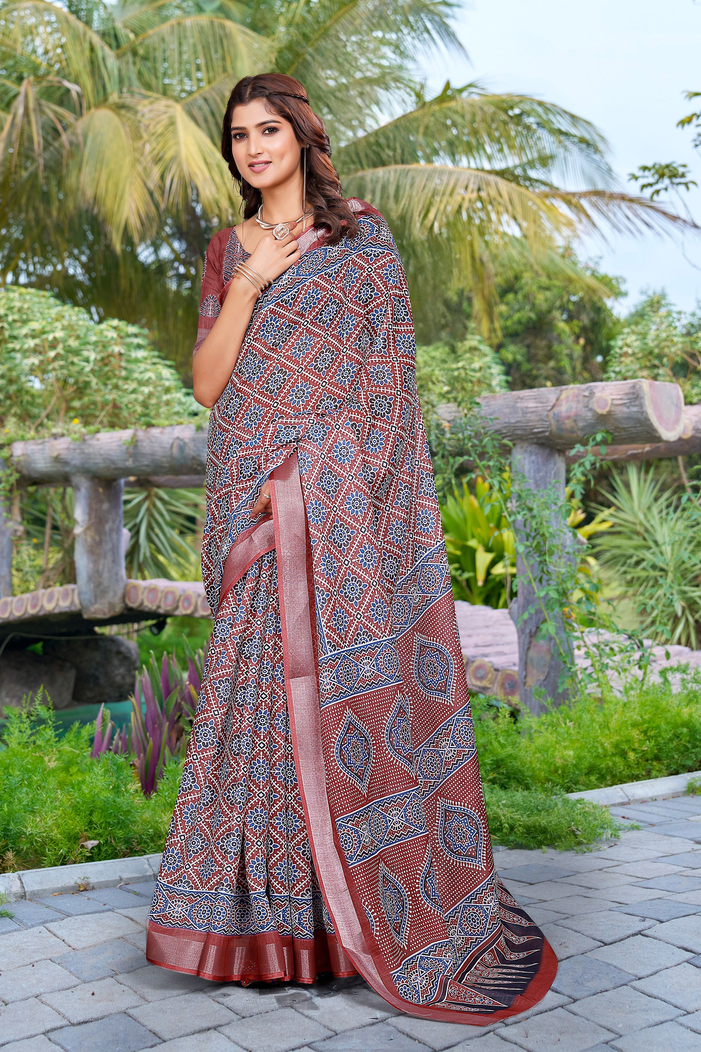 Brown Color Linen Cotton Fabric Beautiful Festive Special Saree