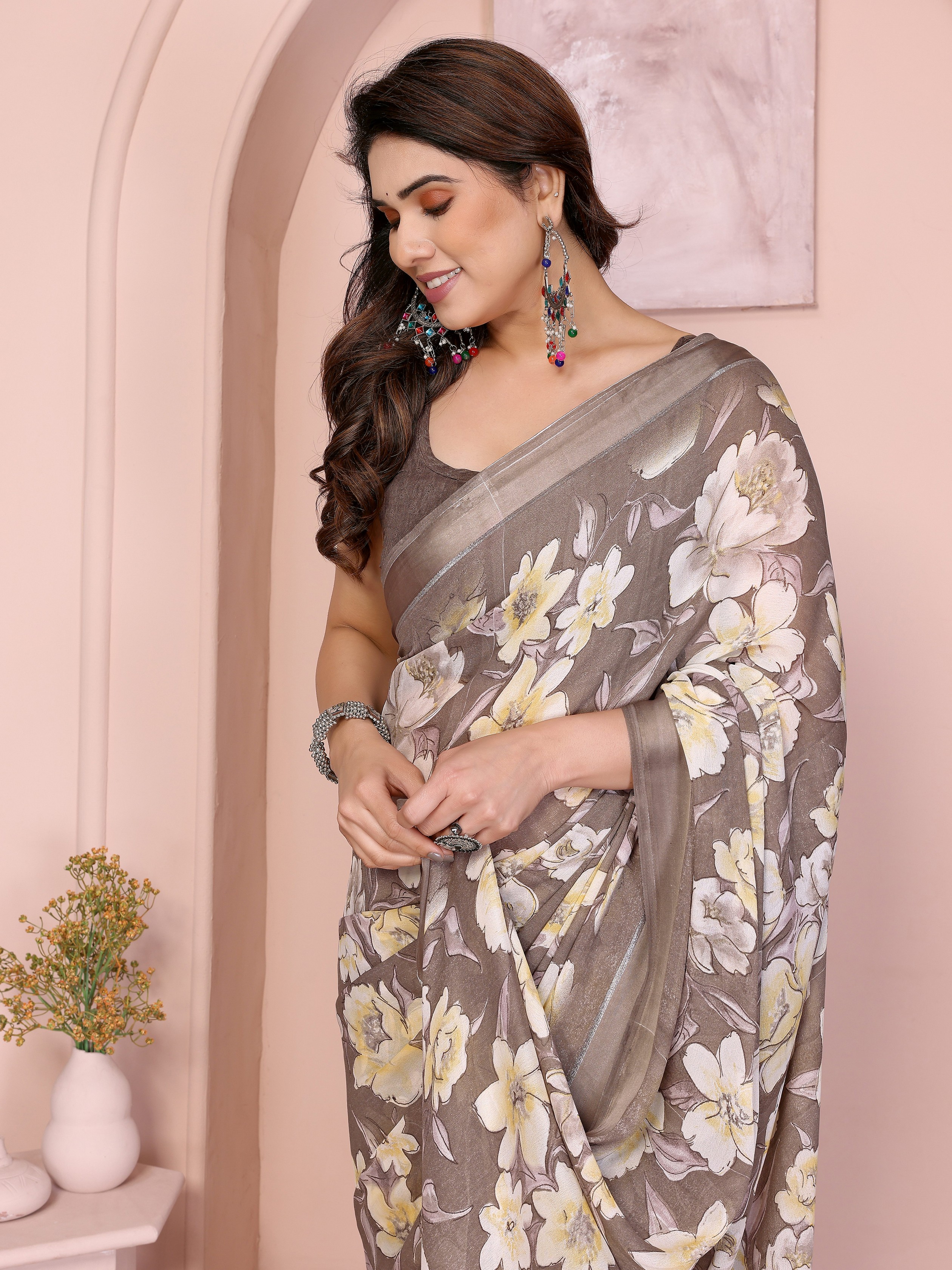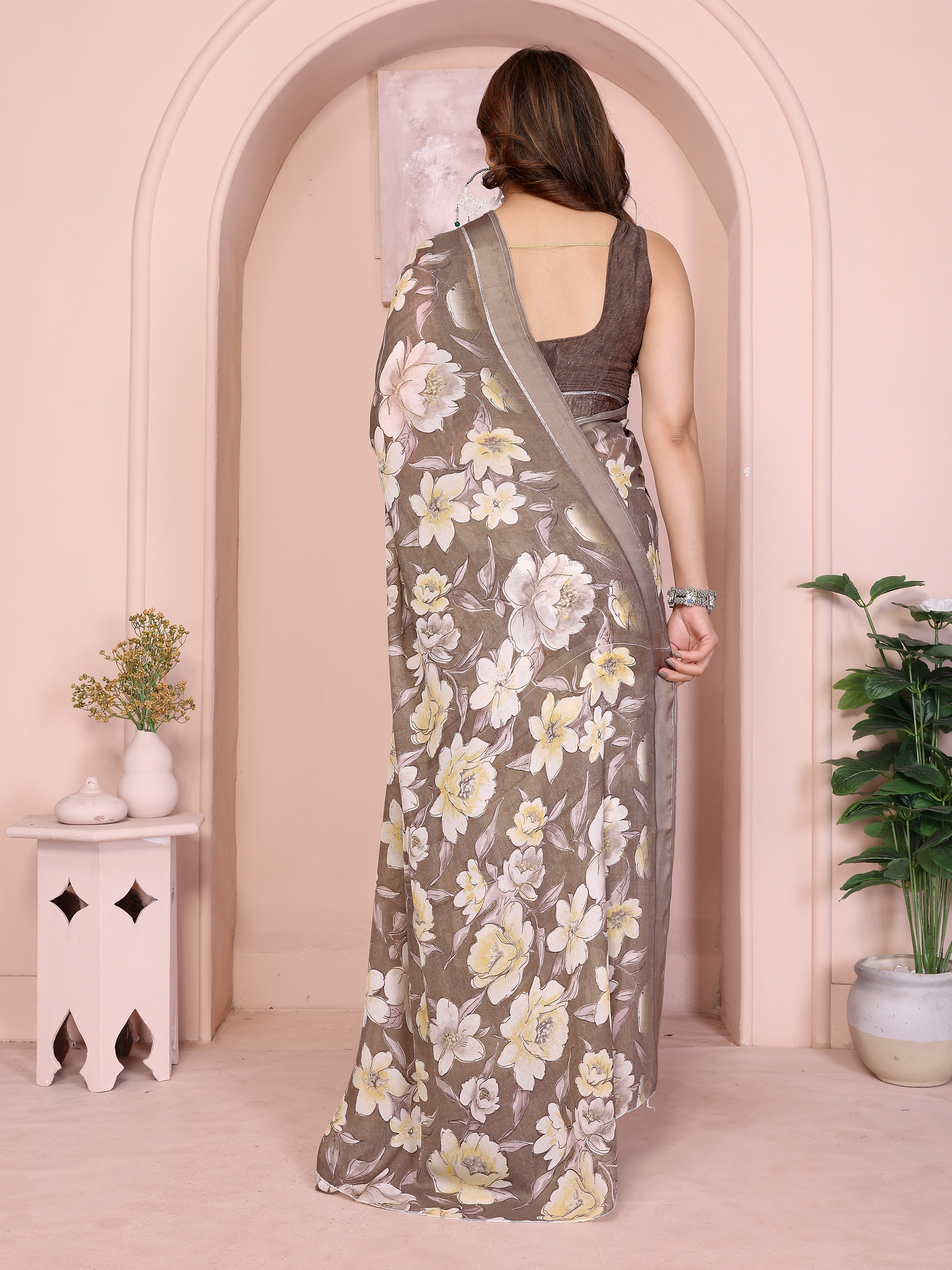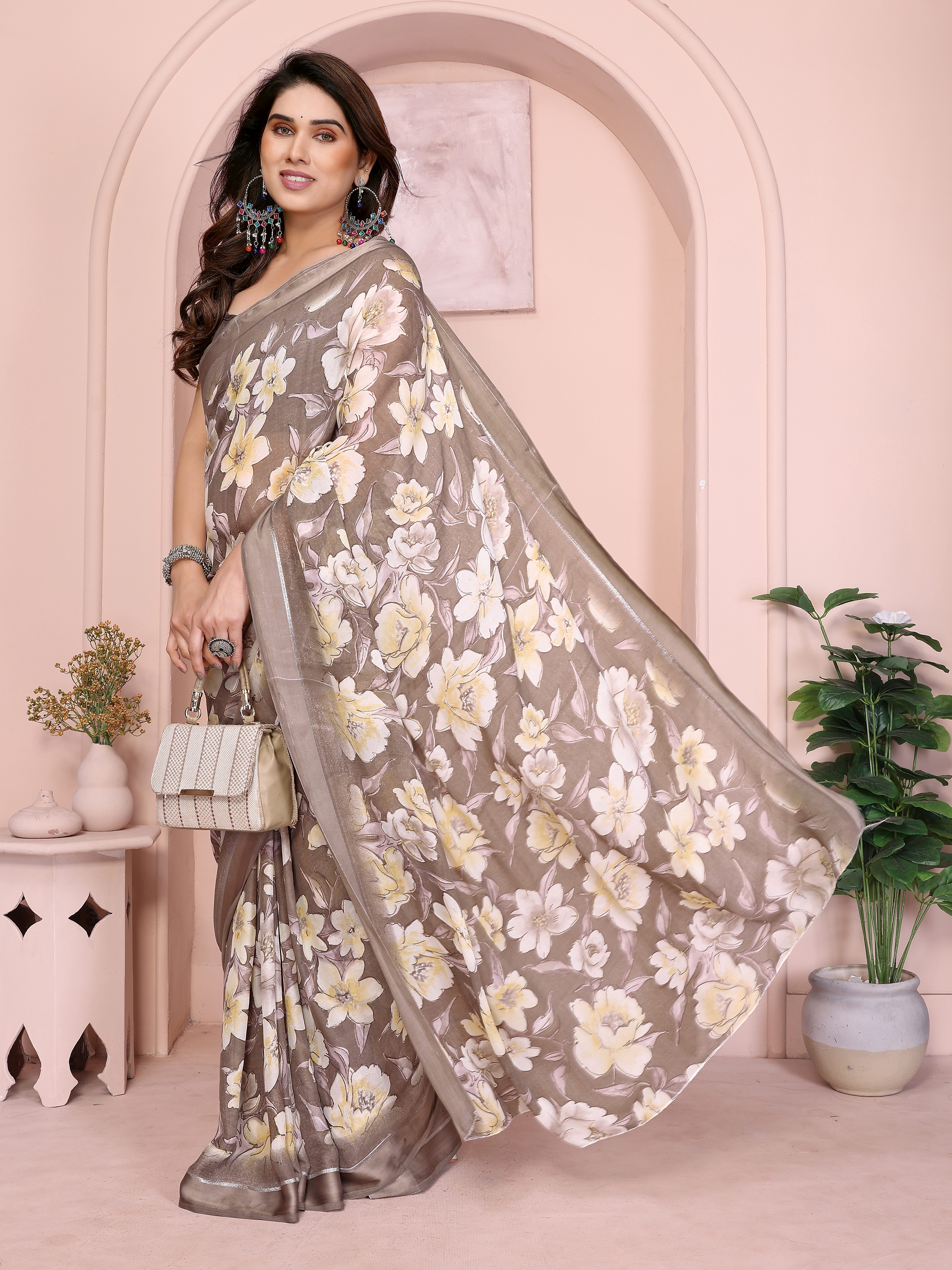 Brown Color Moss Satin Patta Woven Patta Designer Printed Fancy Saree