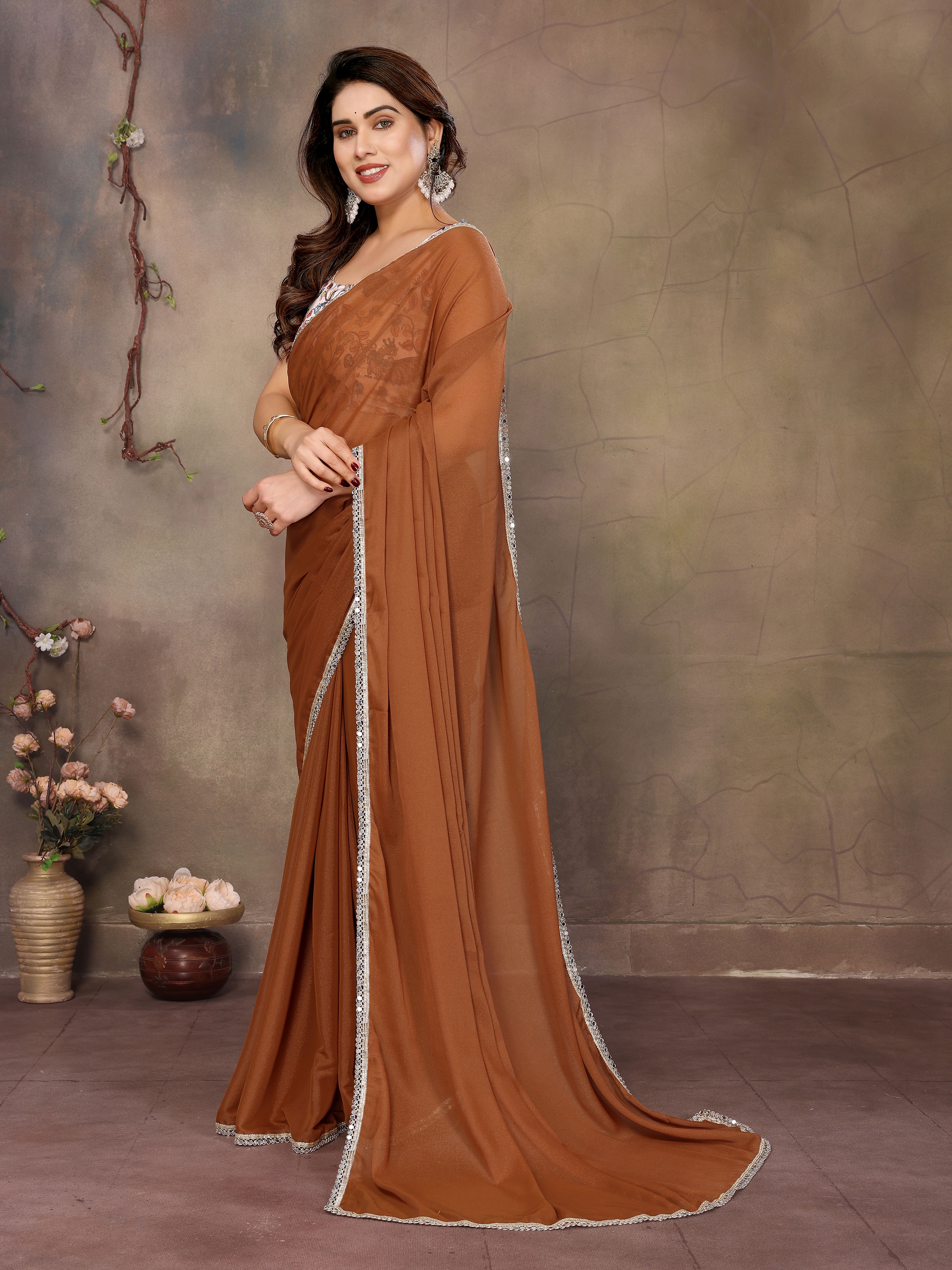 Brown Color Solid Color Fancy Ethnic Saree For Ceremonial Girlie Looks