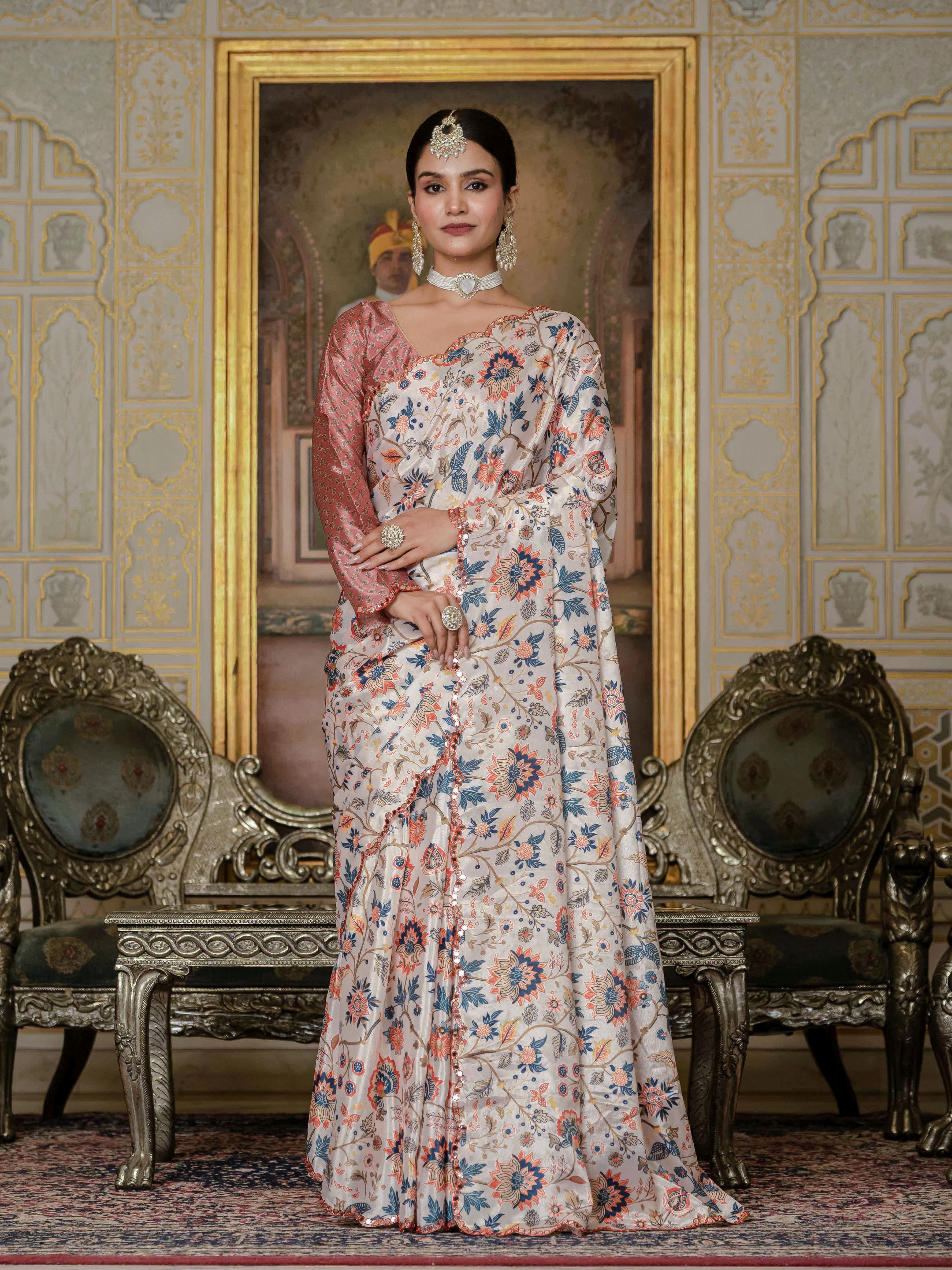 Cream Color Stylish Ready To Wear Chinon Fabric Partywear Saree