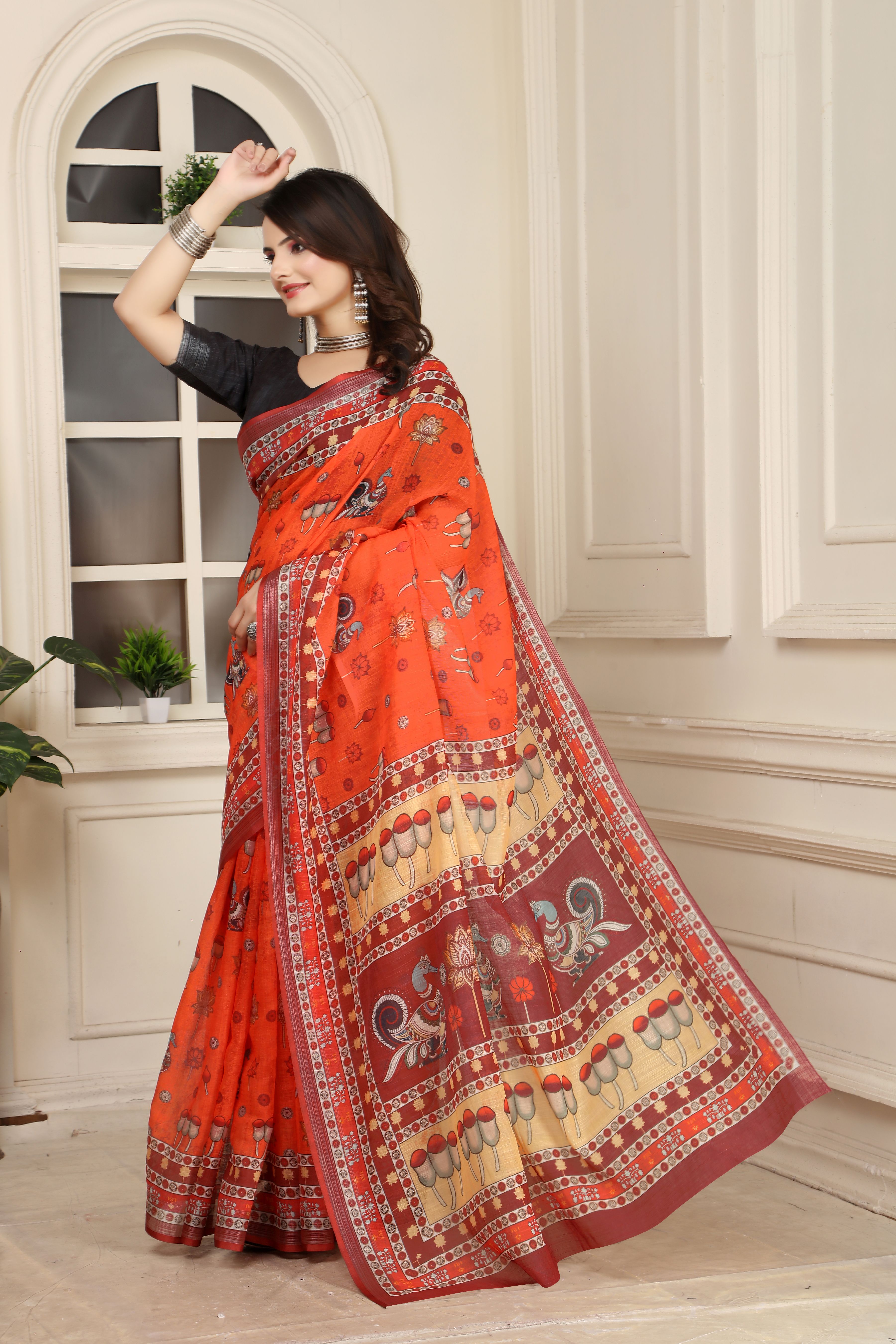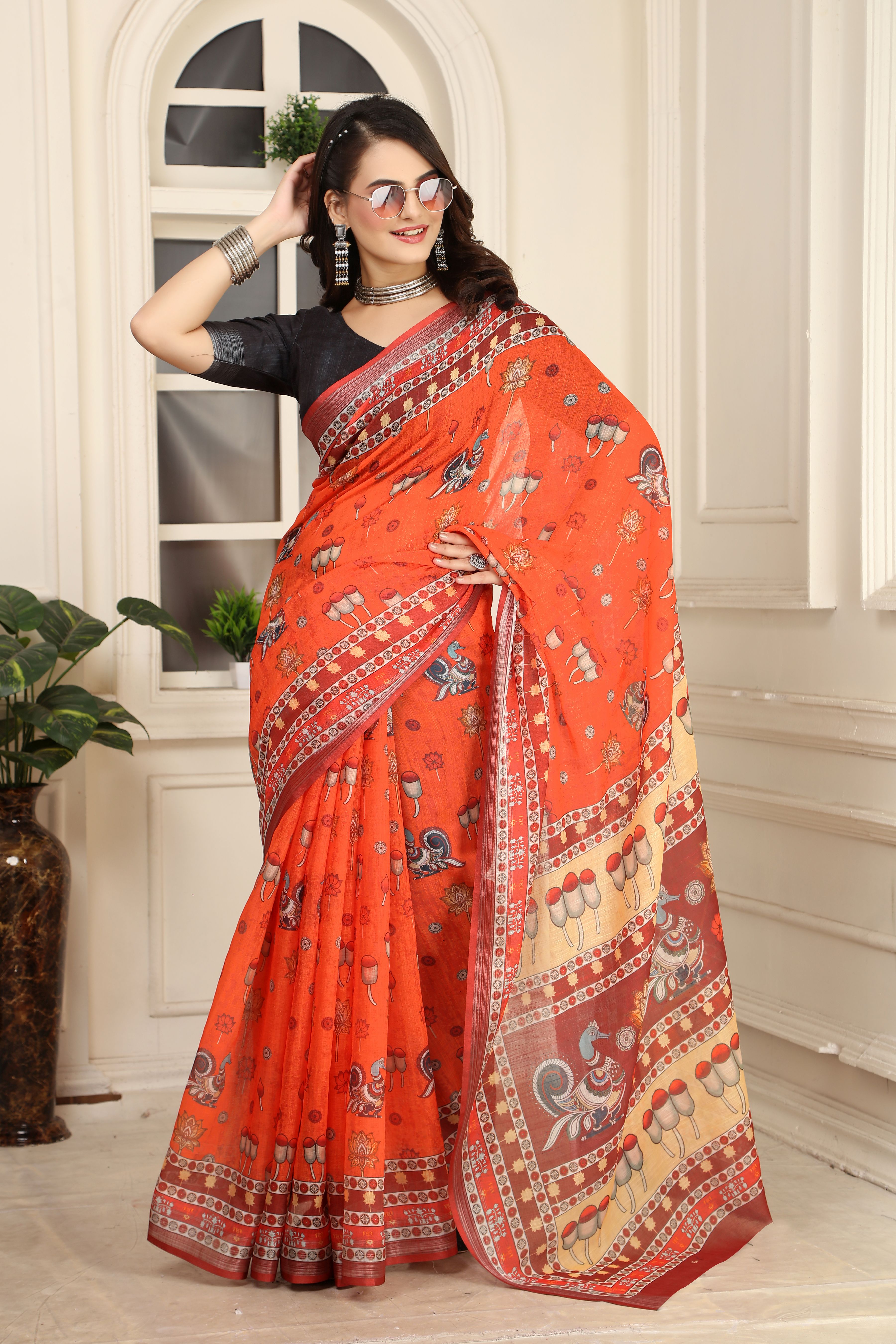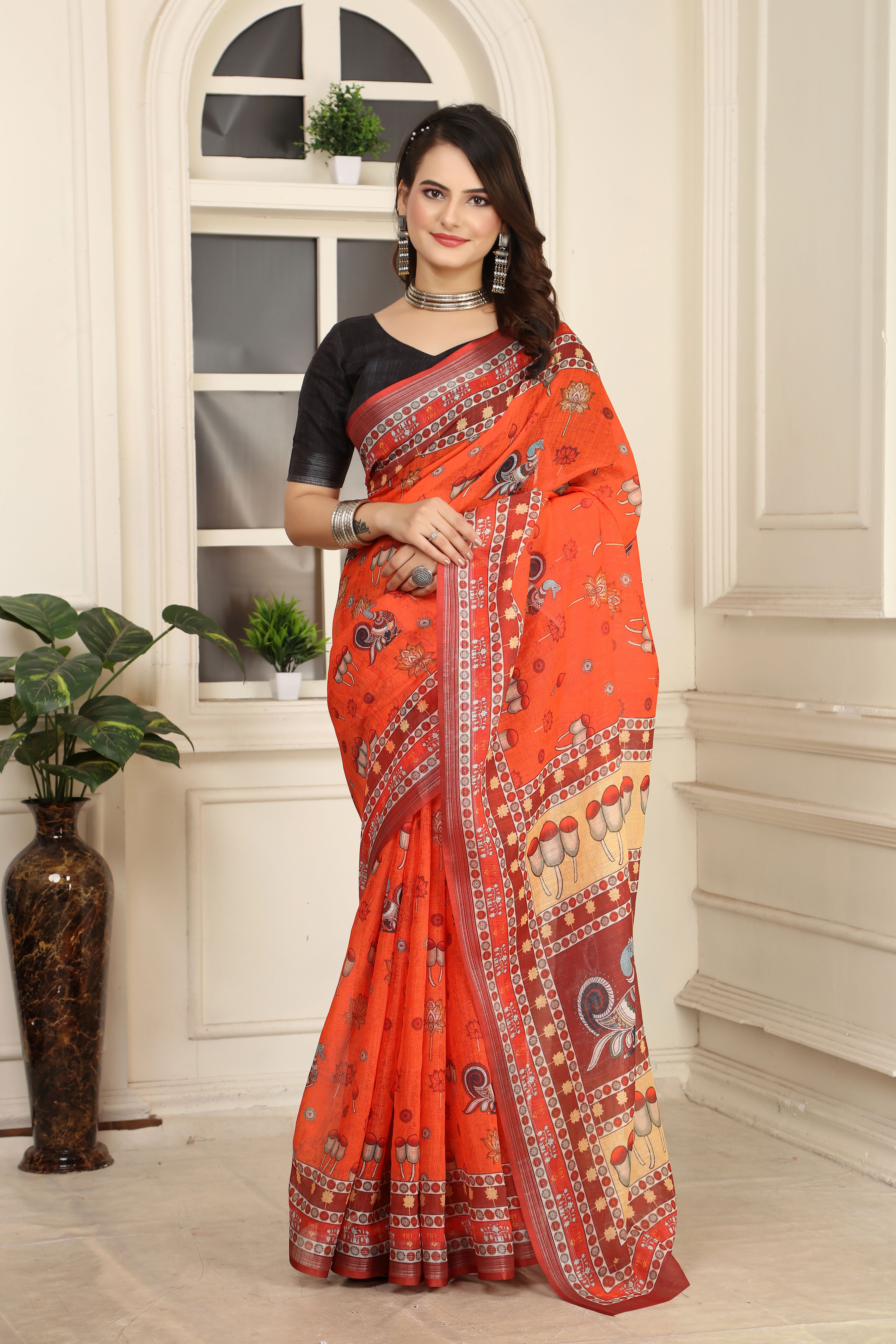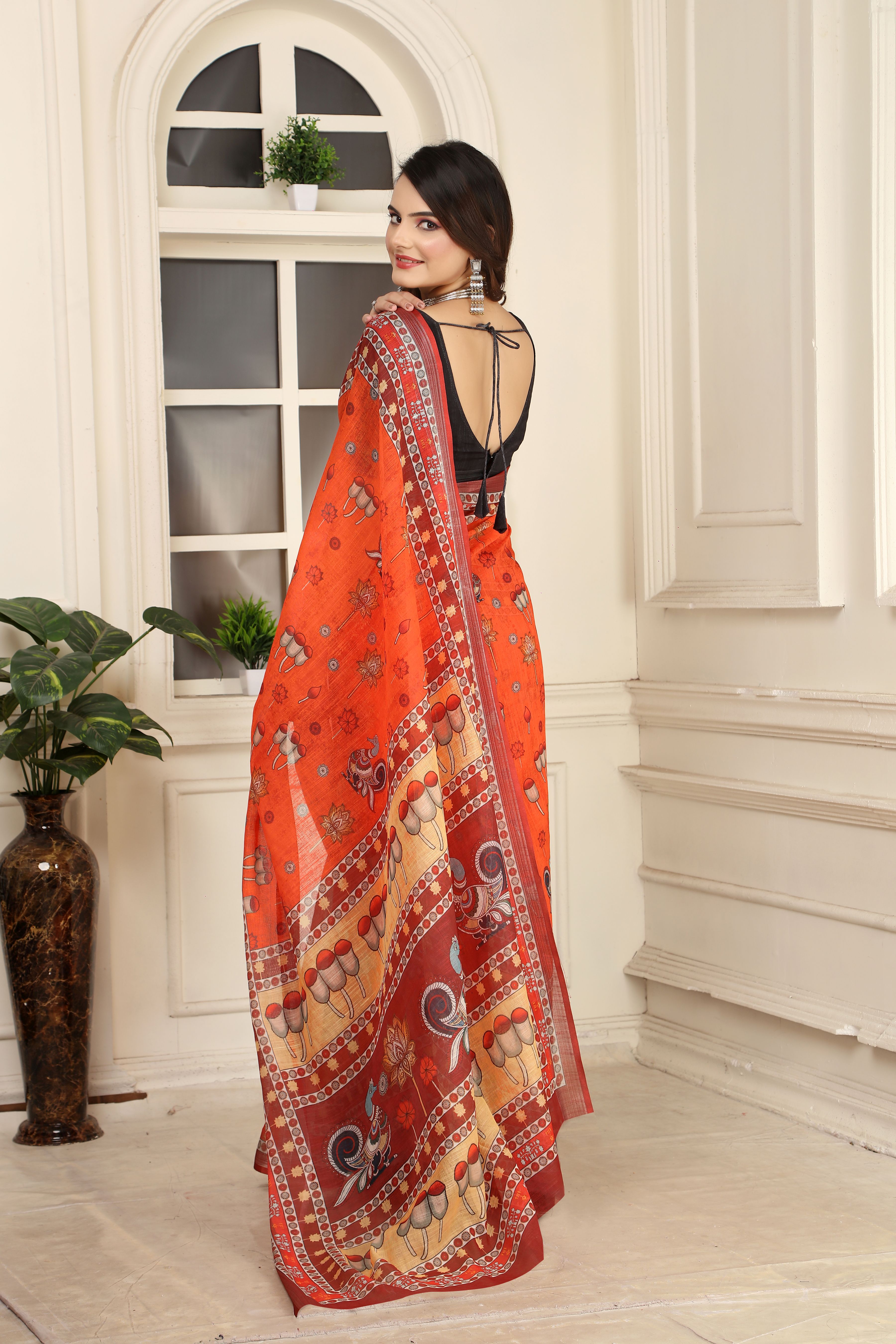 Ethnic Orange Color Beatutiful Linen Cotton Digital Printed Saree