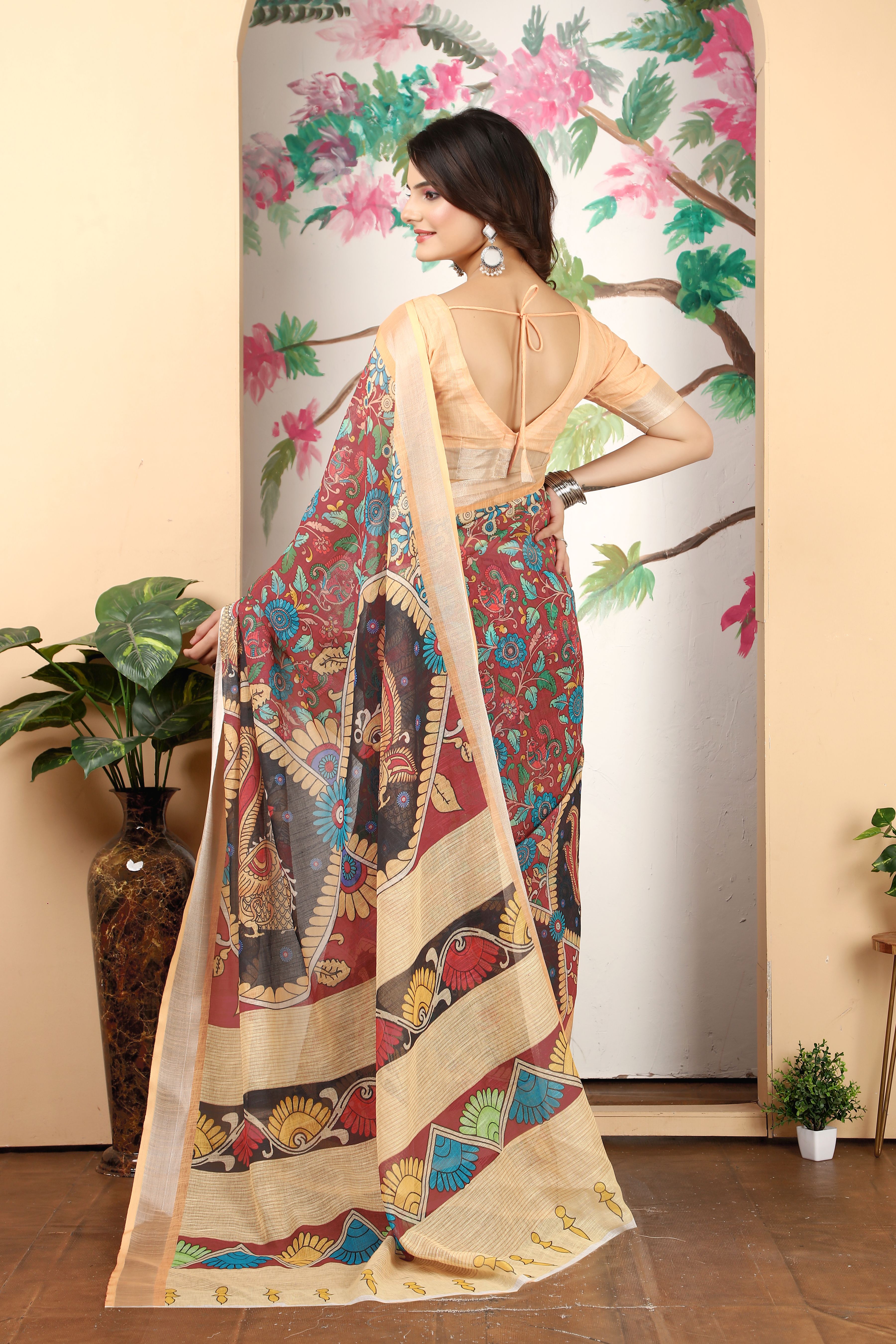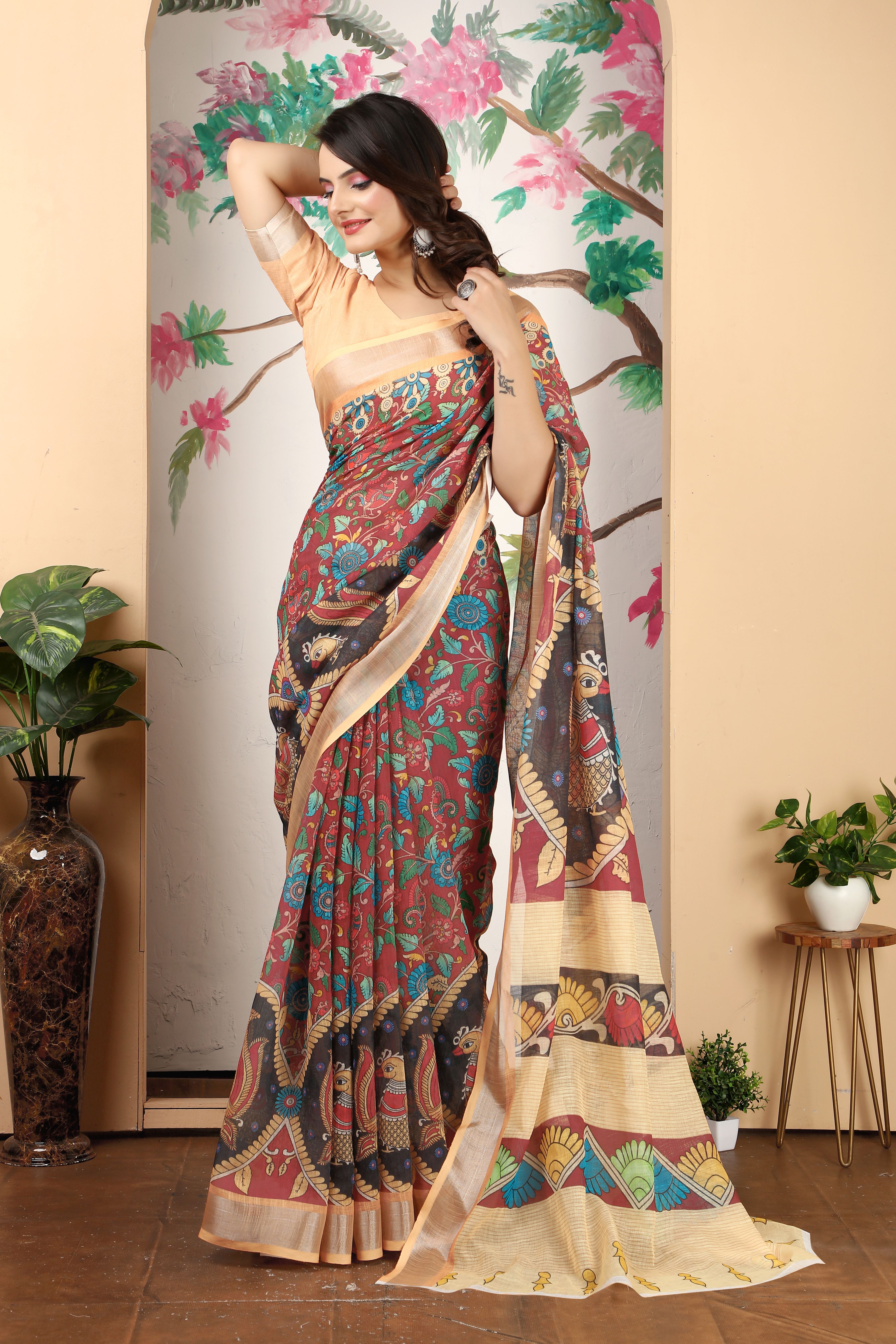 Ethnic Peach Color Beatutiful Linen Cotton Digital Printed Saree