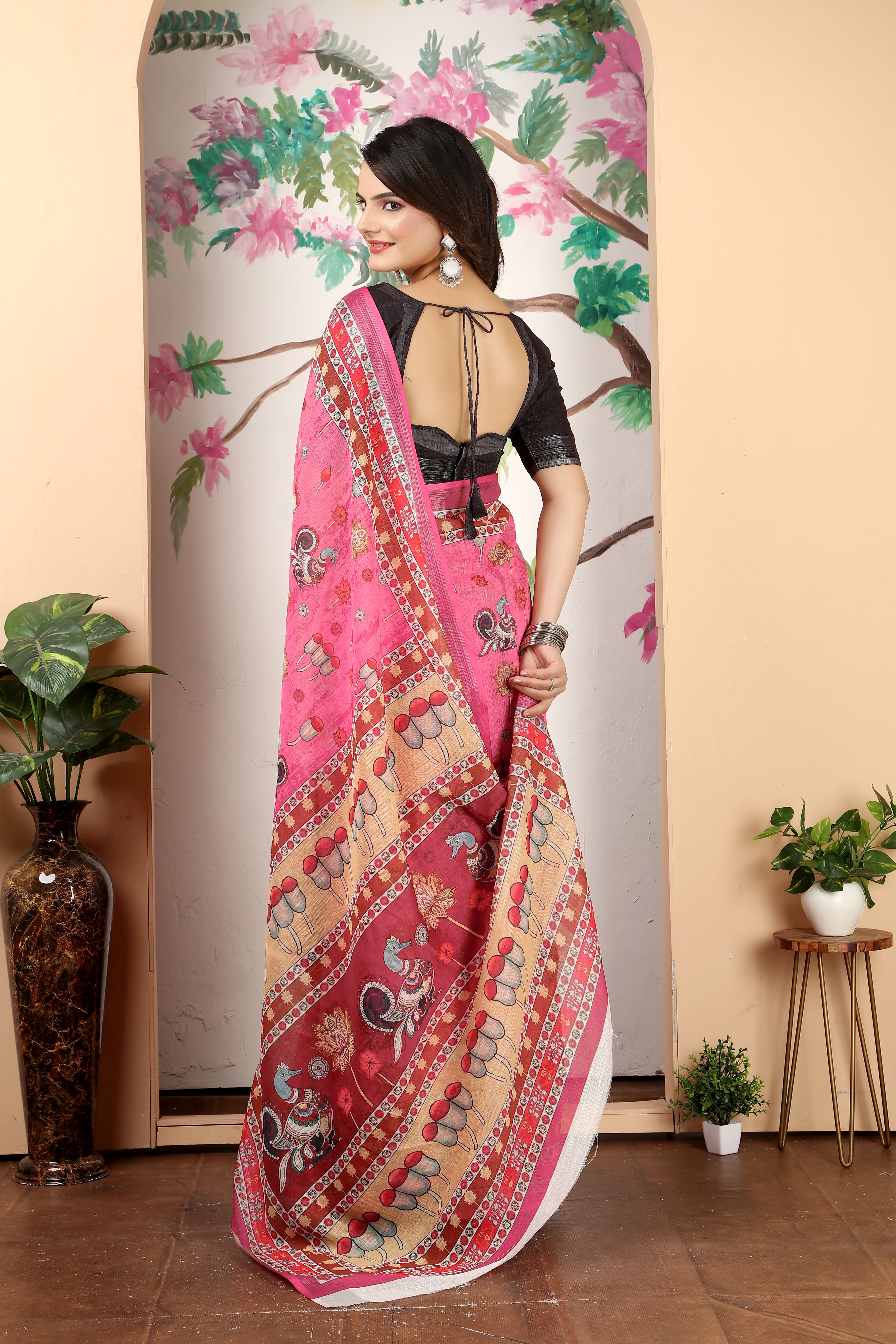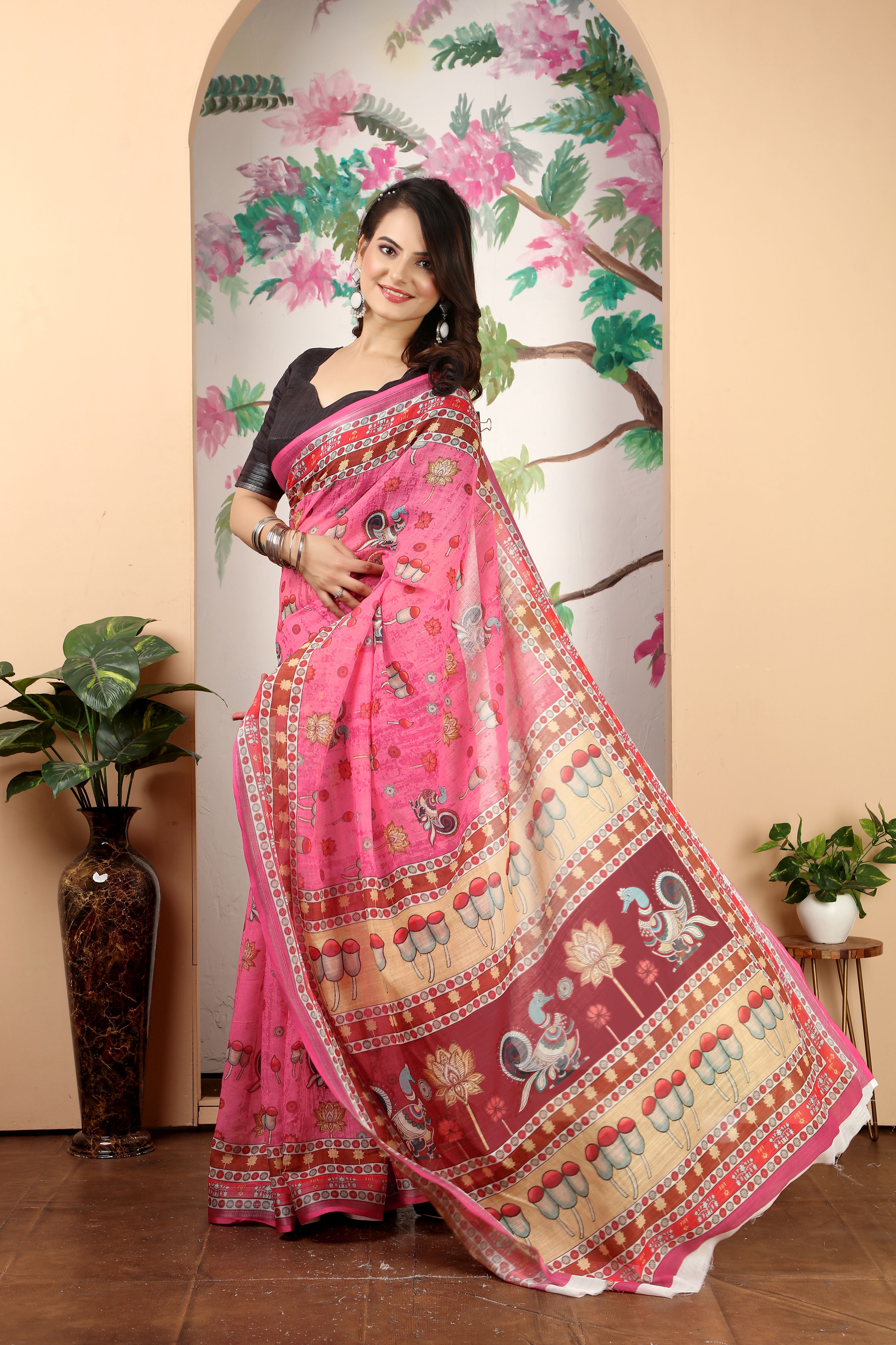 Ethnic Pink Color Beatutiful Linen Cotton Digital Printed Saree