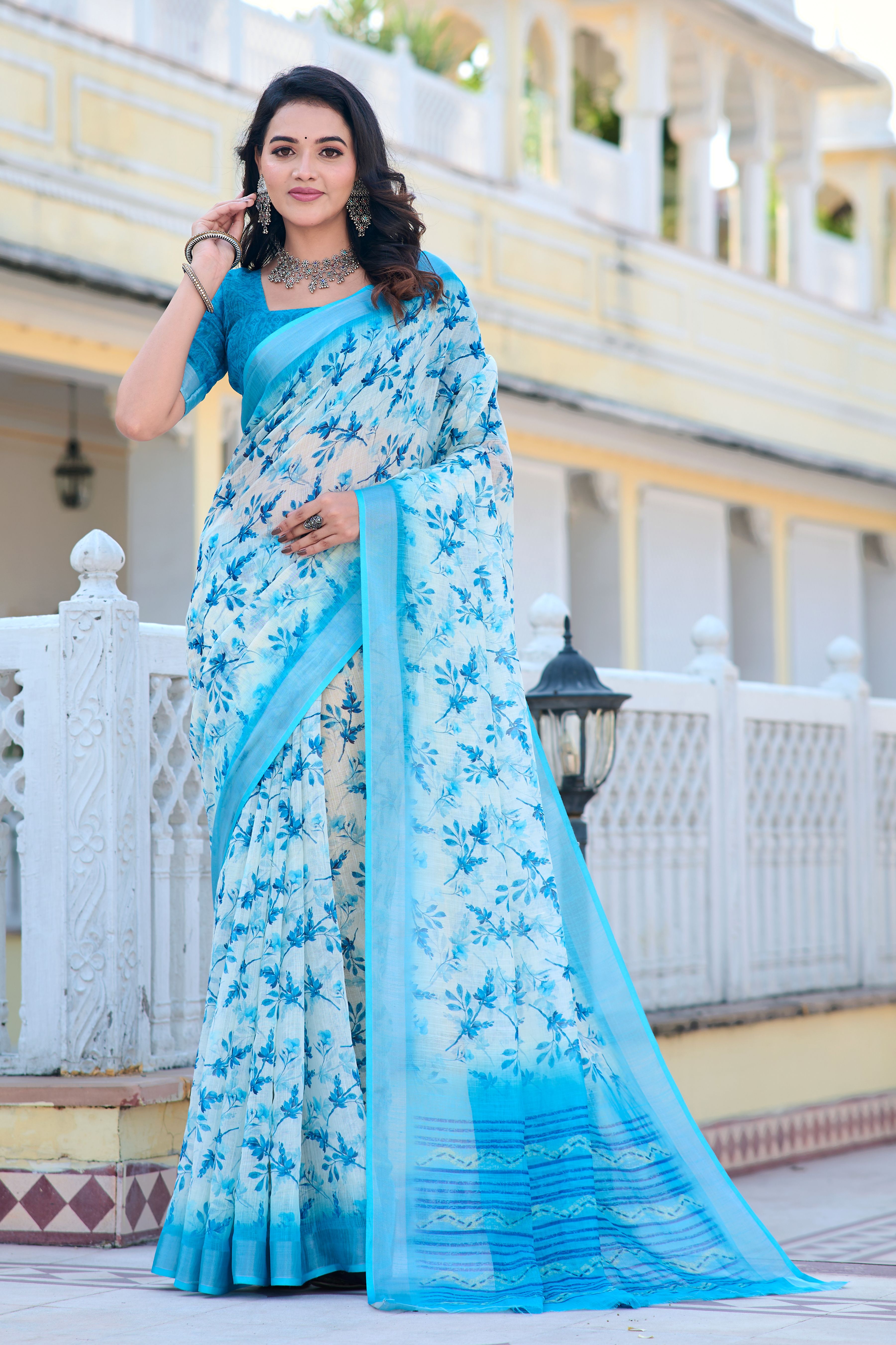 Garb These Festive Saree in Fine Colored.These Saree Are Linen Cotton And Blouse is Fabricated On Linen Cotton Pair.Its Beautified With Woven Jari Border With Designer Digital Printed.
