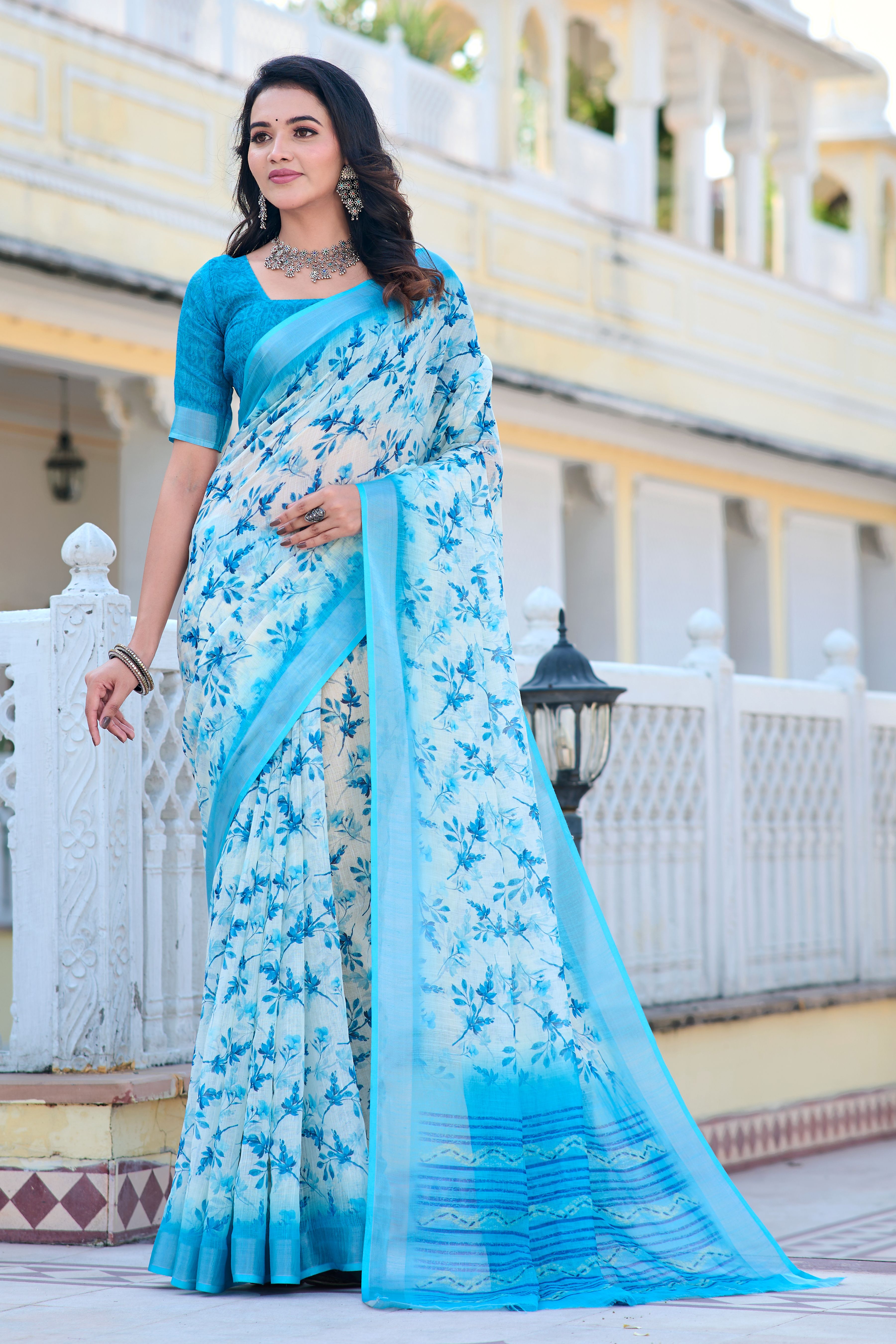 Firozi Color Beautiful Linen Cotton Fabric Designer Festive Wear Saree
