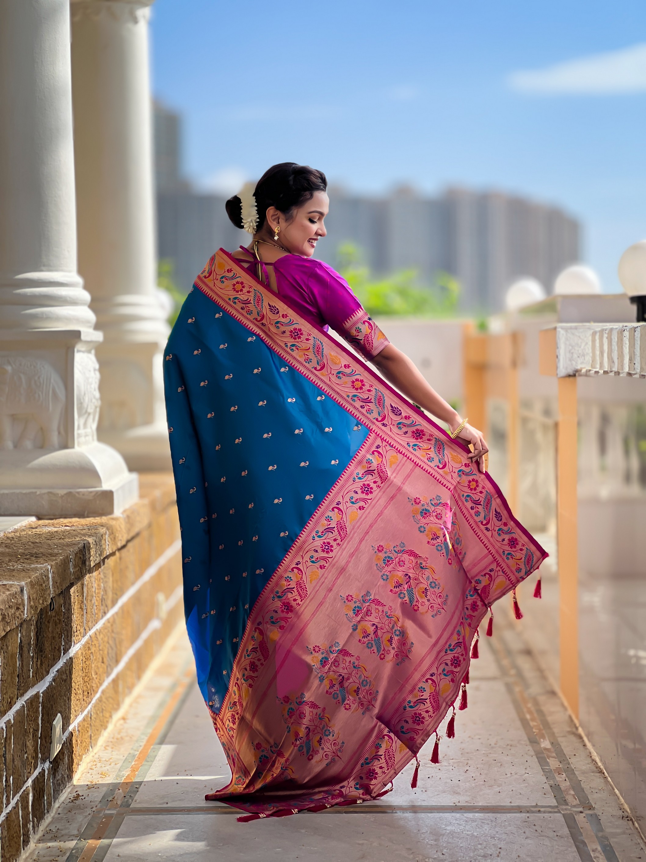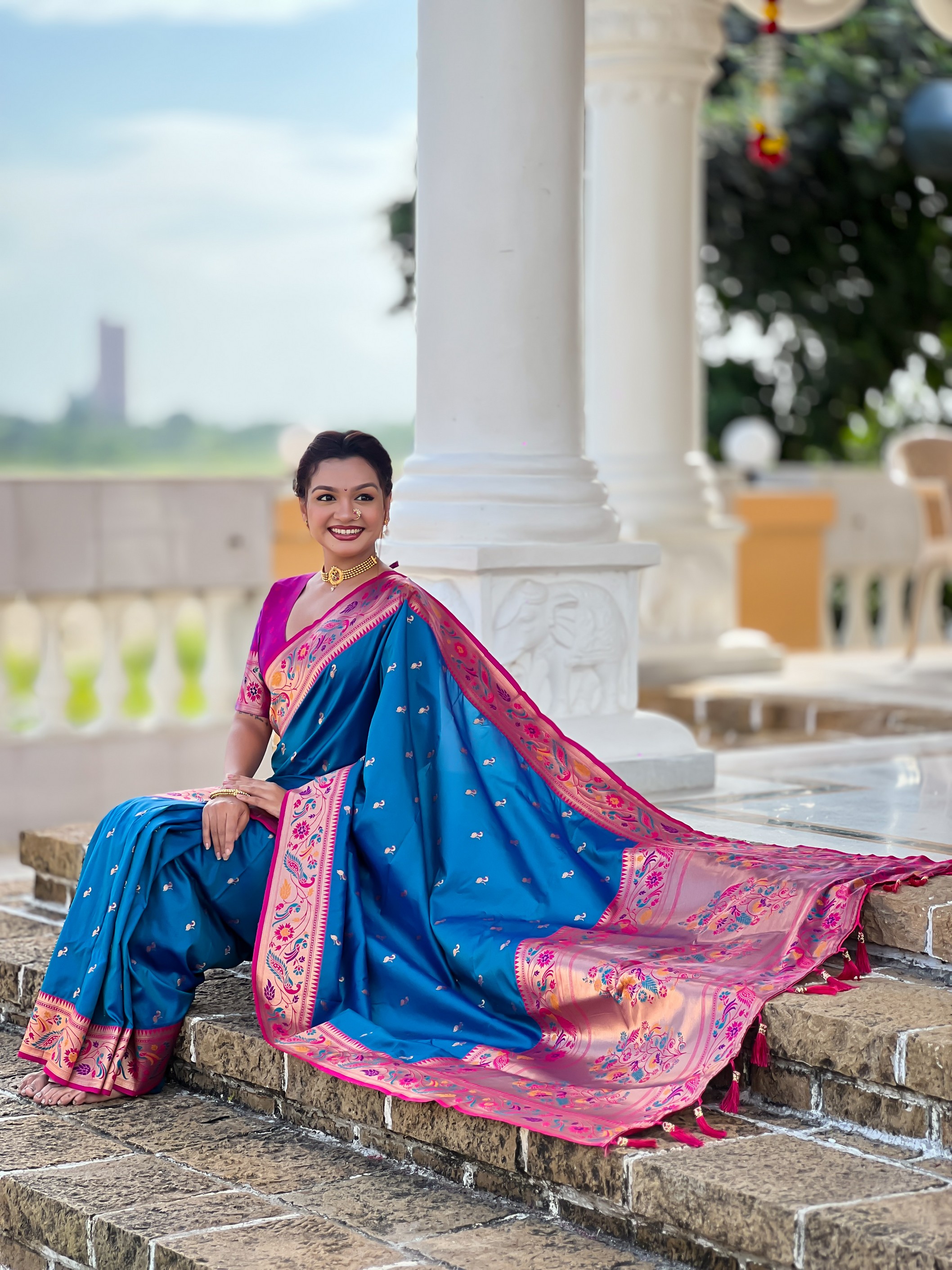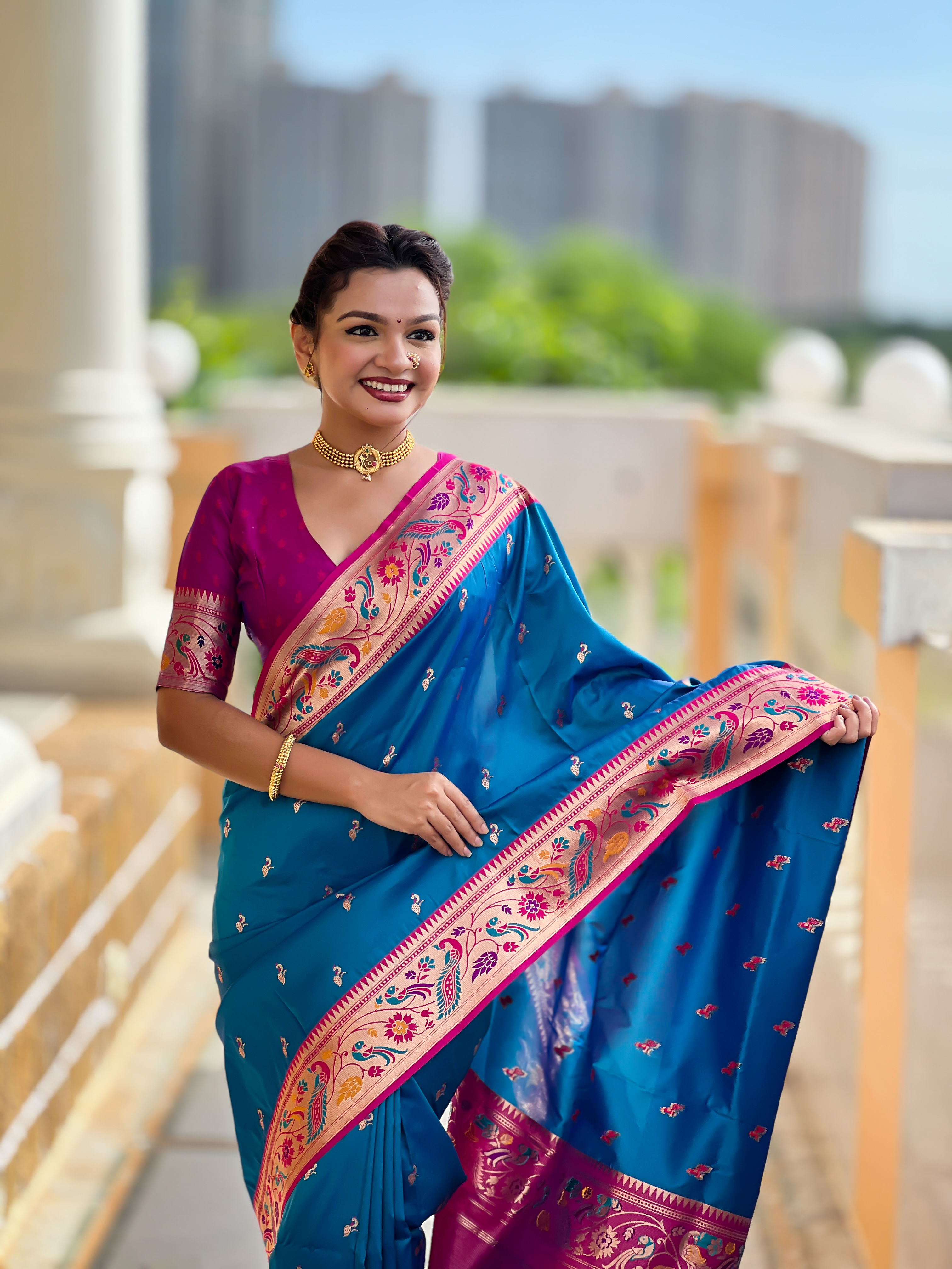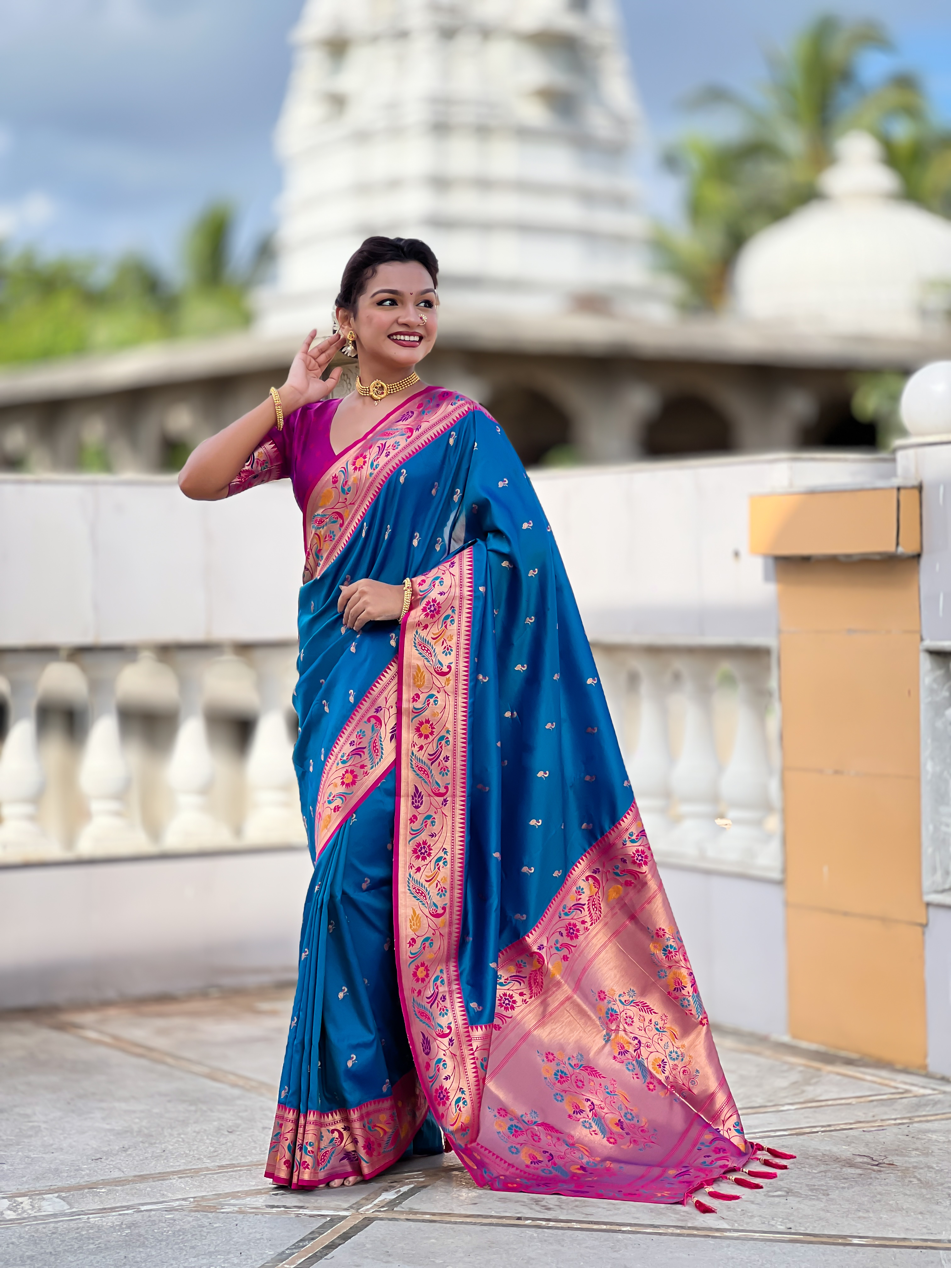 Firozi Color Paithani Silk Fabric Woven Meenakari Jacquard Designer Saree