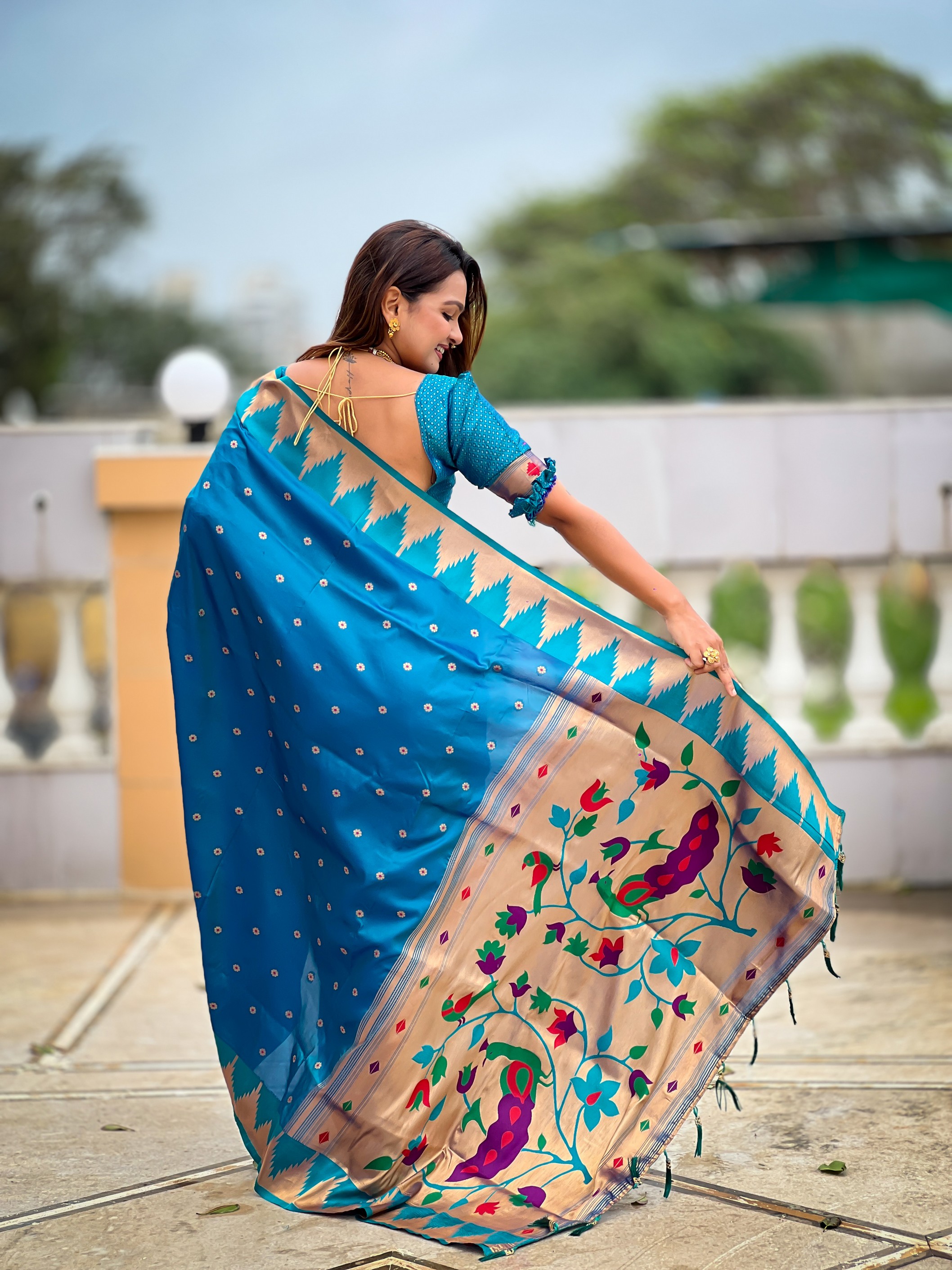 Firozi Color Sophisticated Paithani Silk Fabric Woven Jacquard Meenakari Designer Saree