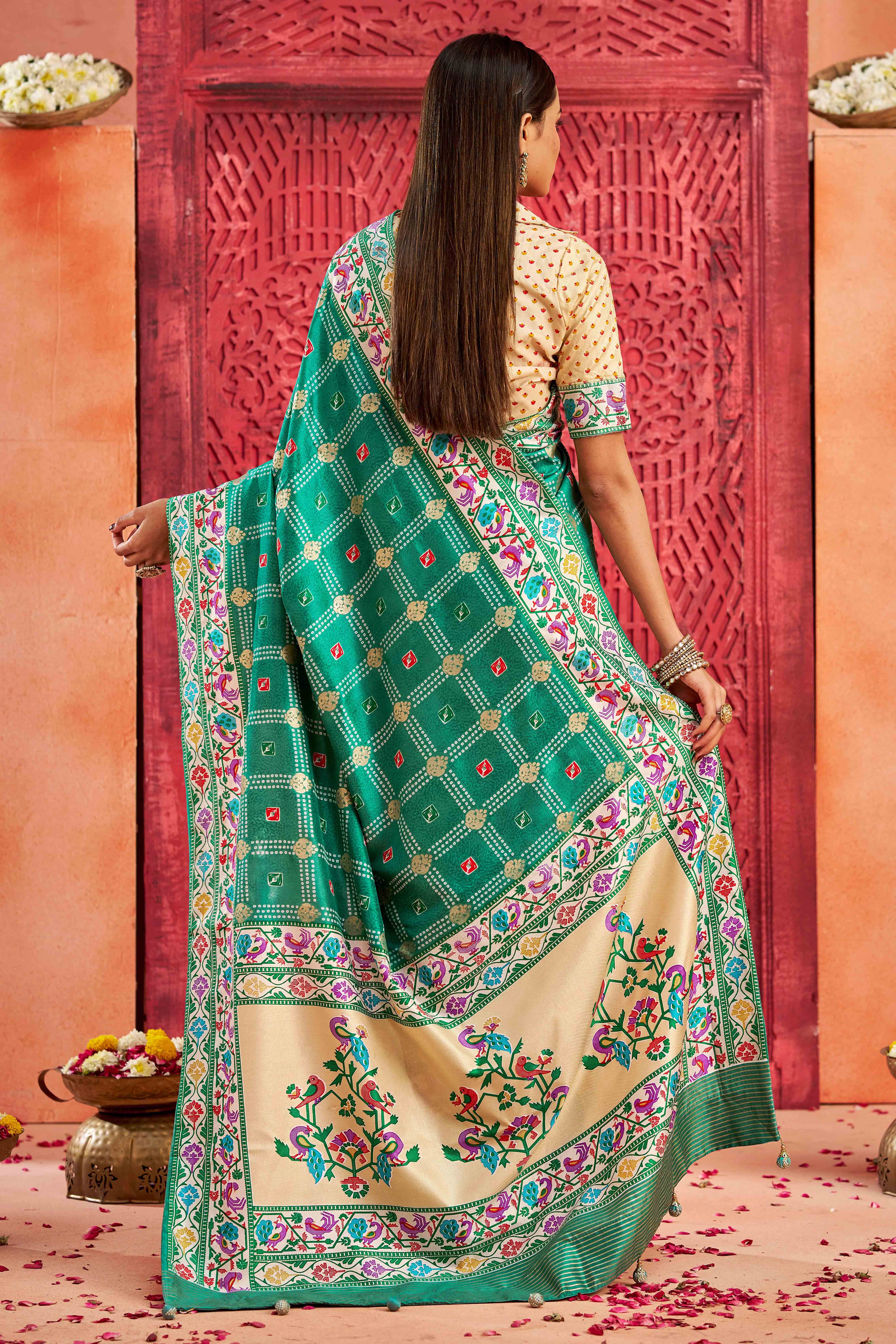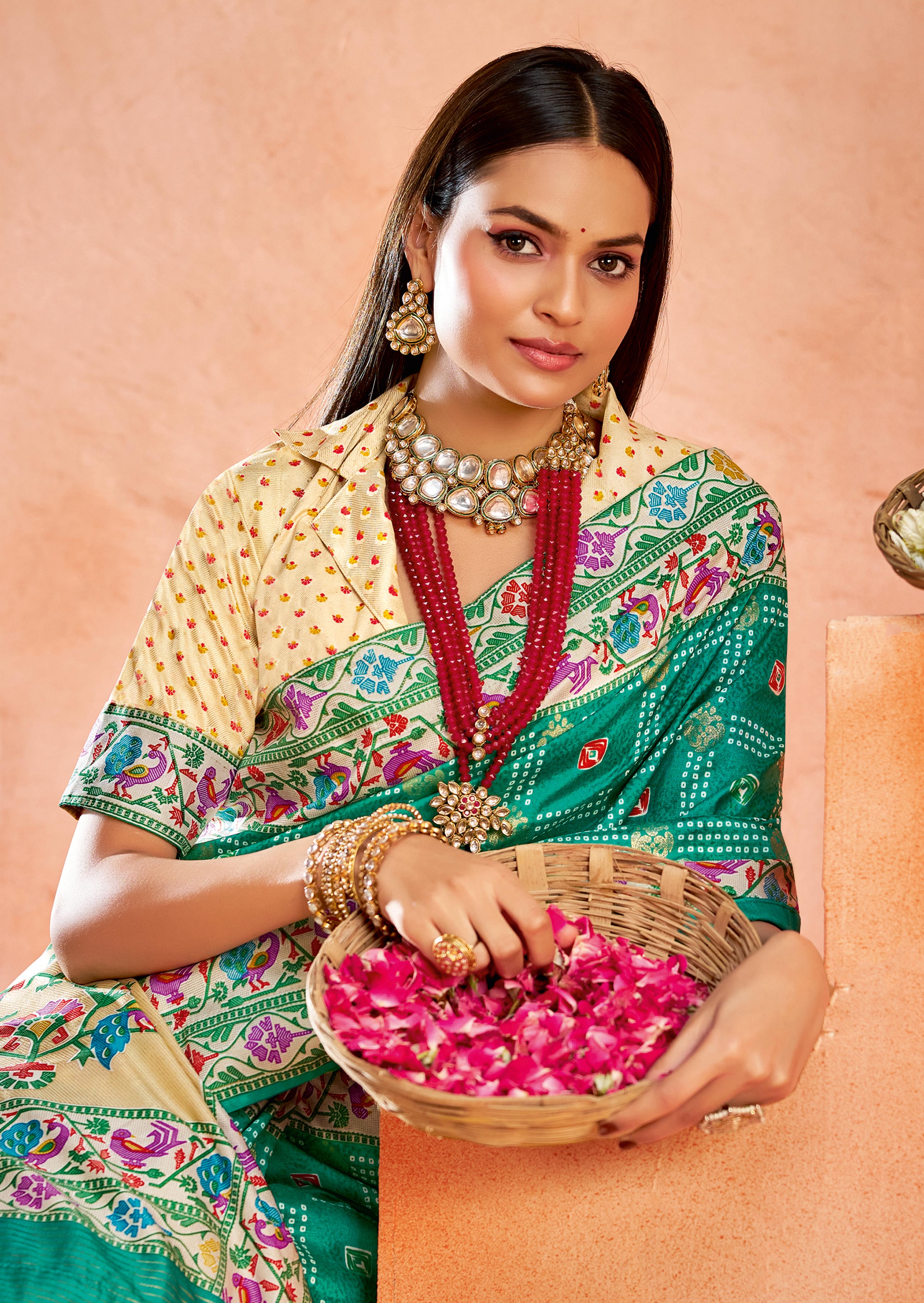 Firozi Color Velvet Tussar Silk Fabric Partywear Saree With Paithani Pallu And Traditional Ghatchola Print