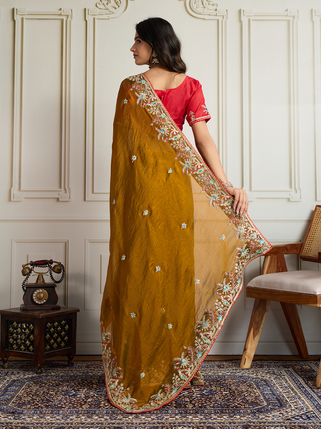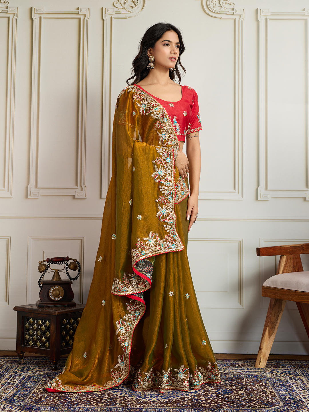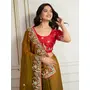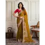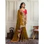Gold Color Frendy Chiffon Fabric Designer Embroidery Work Heavy Ceremonial Saree