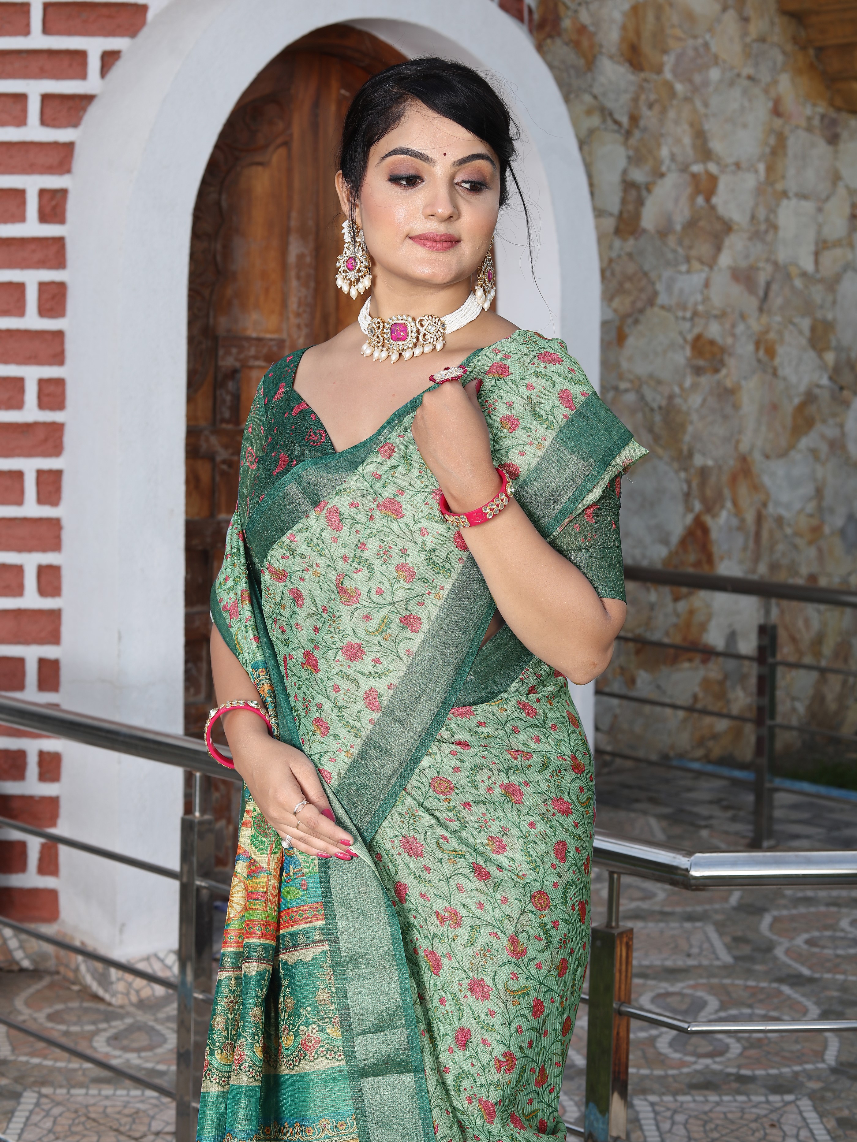 Green Color Cotton Shimmer Fabric Smart Printed Saree With Woven Border