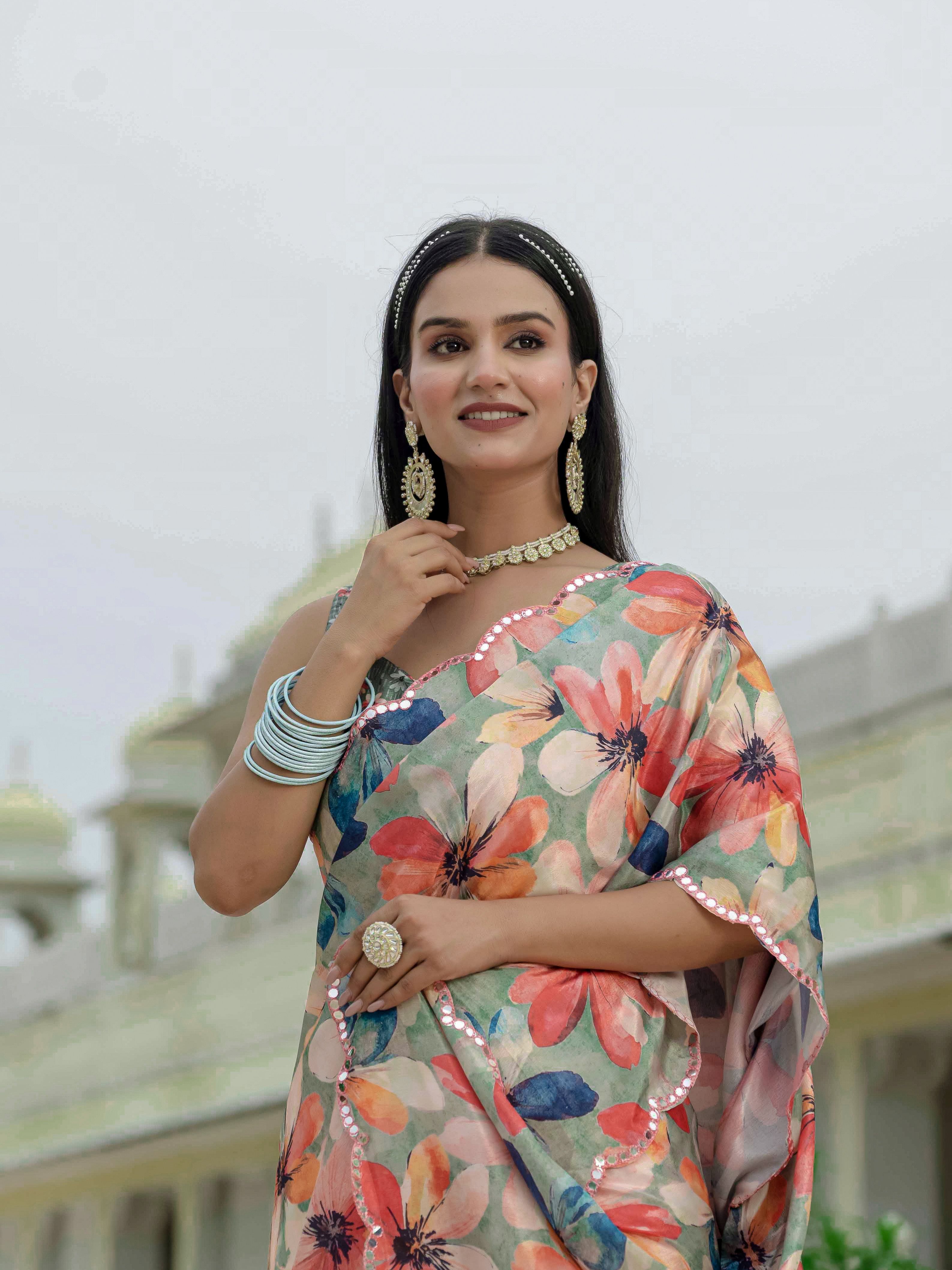Green Color Graceful Chinon Fabric Smart Girlie Printed Ready To Wear Saree