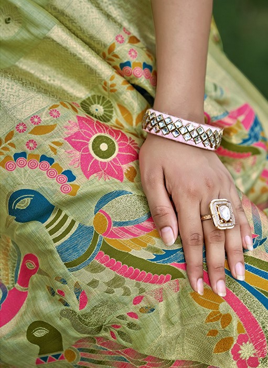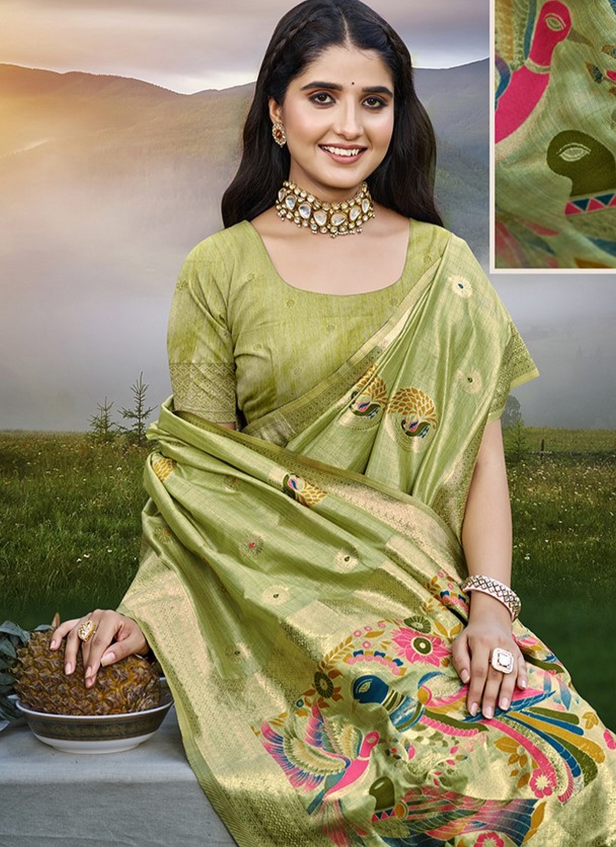 Green Color Graceful Woven Meenakari Designer Saree On Assam Silk Fabric