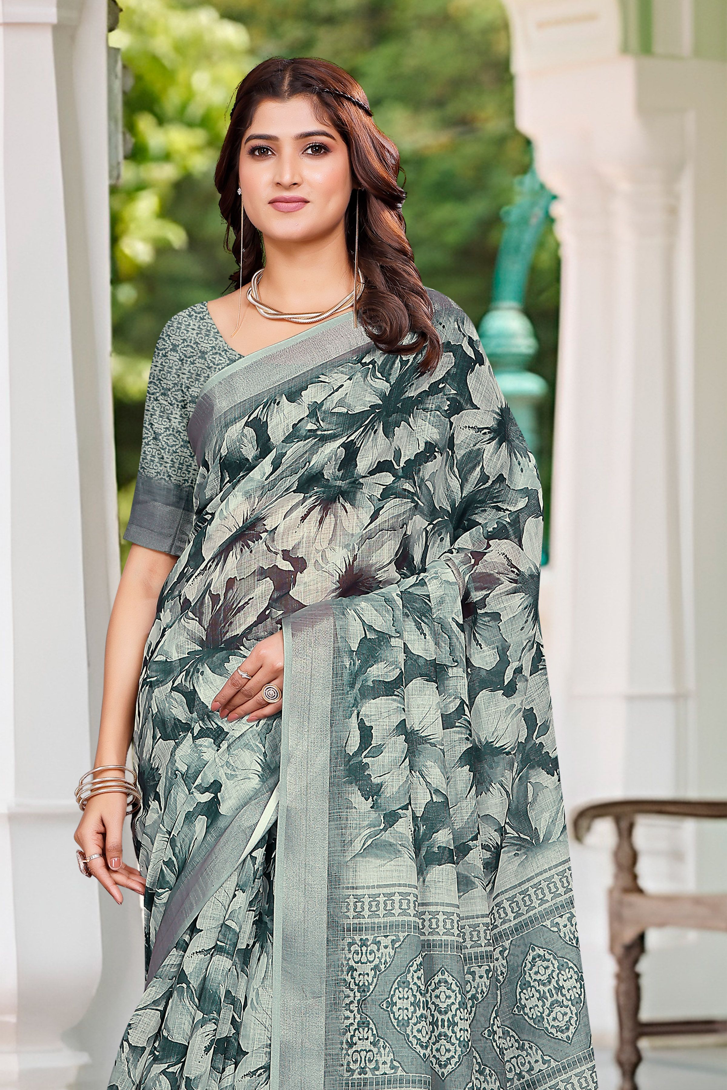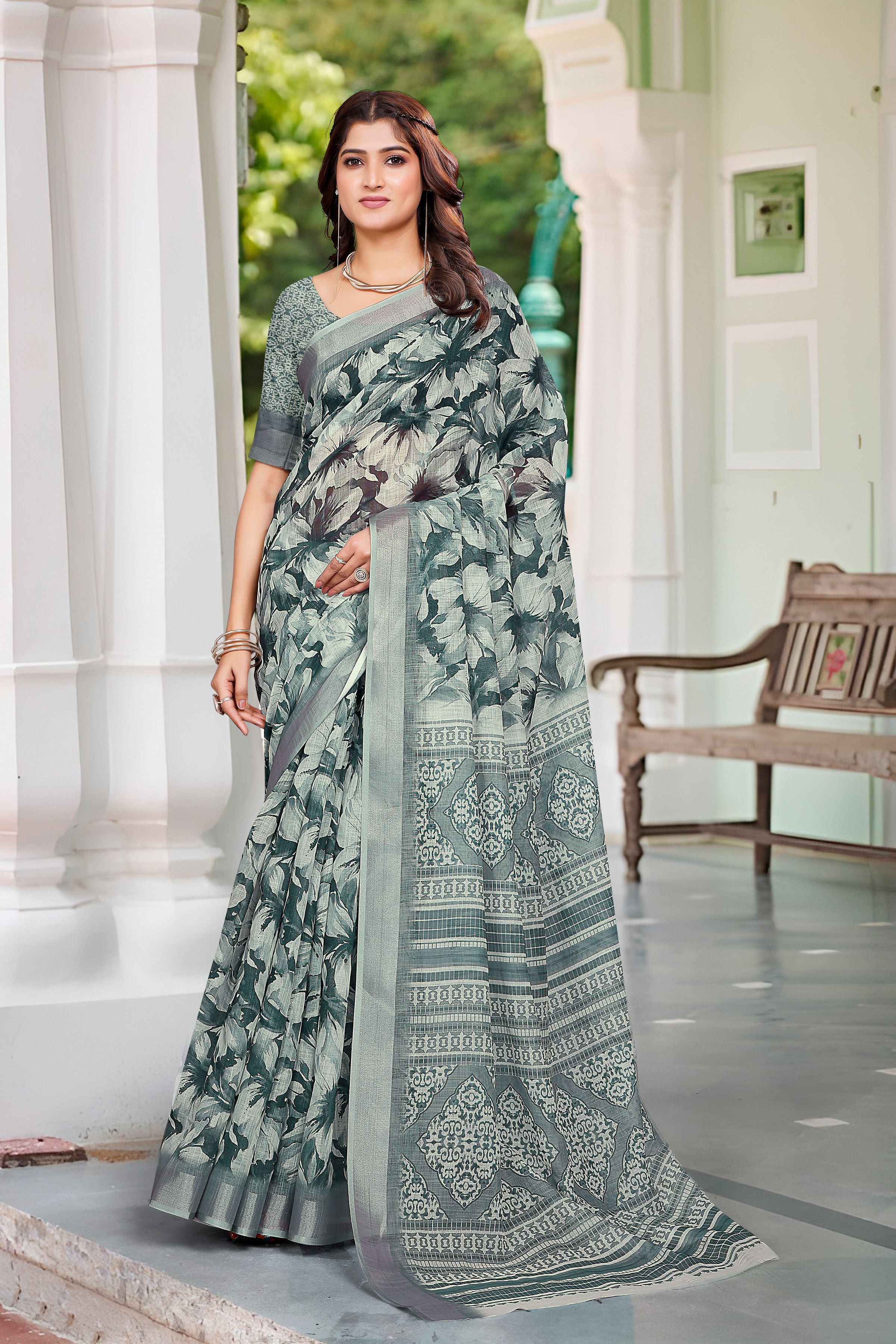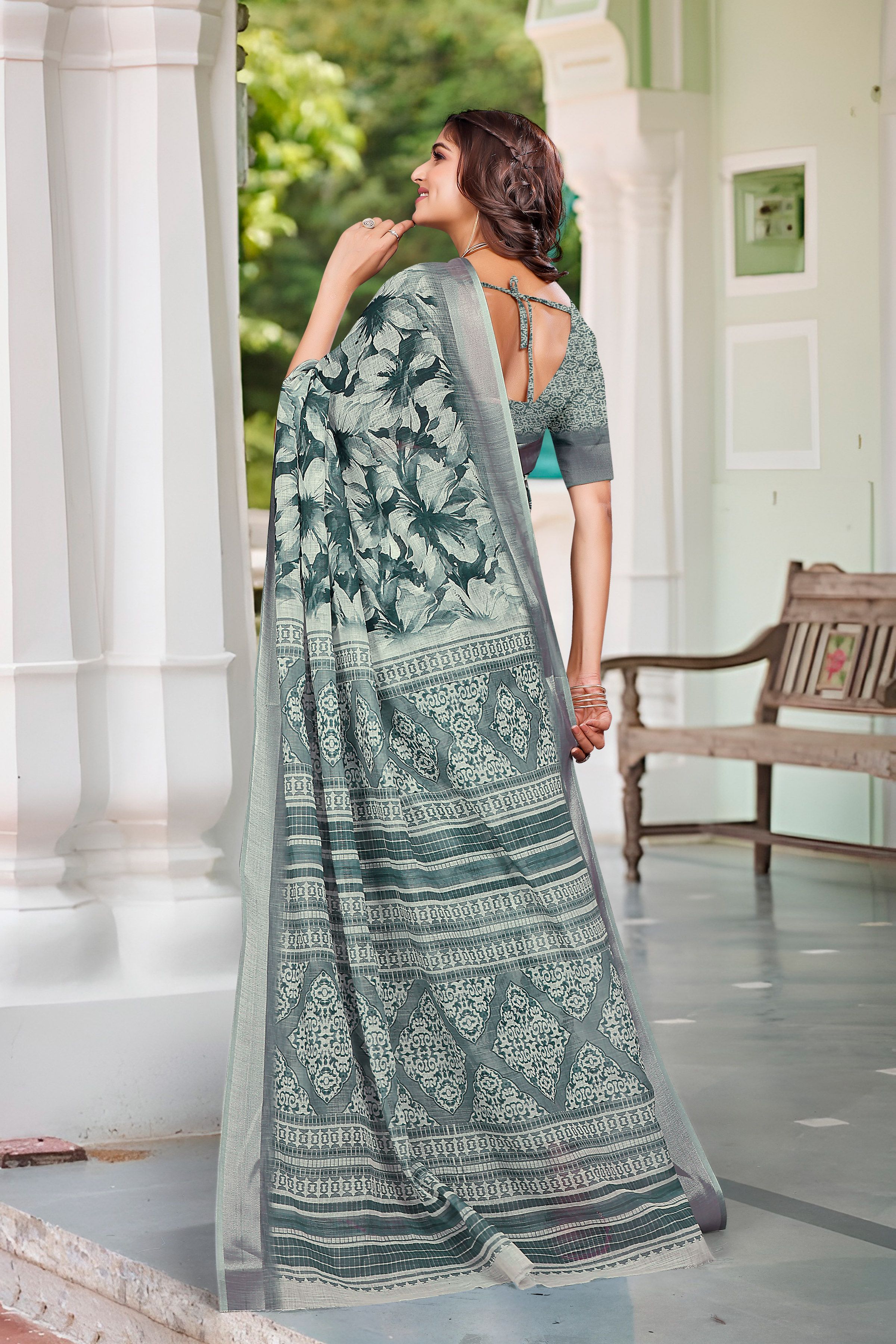 Garb These Festive Saree in Fine Colored.These Saree Are Linen Cotton And Blouse is Fabricated On Linen Cotton Pair.Its Beautified With Wevon Jari Border With Designer Digital Printed.