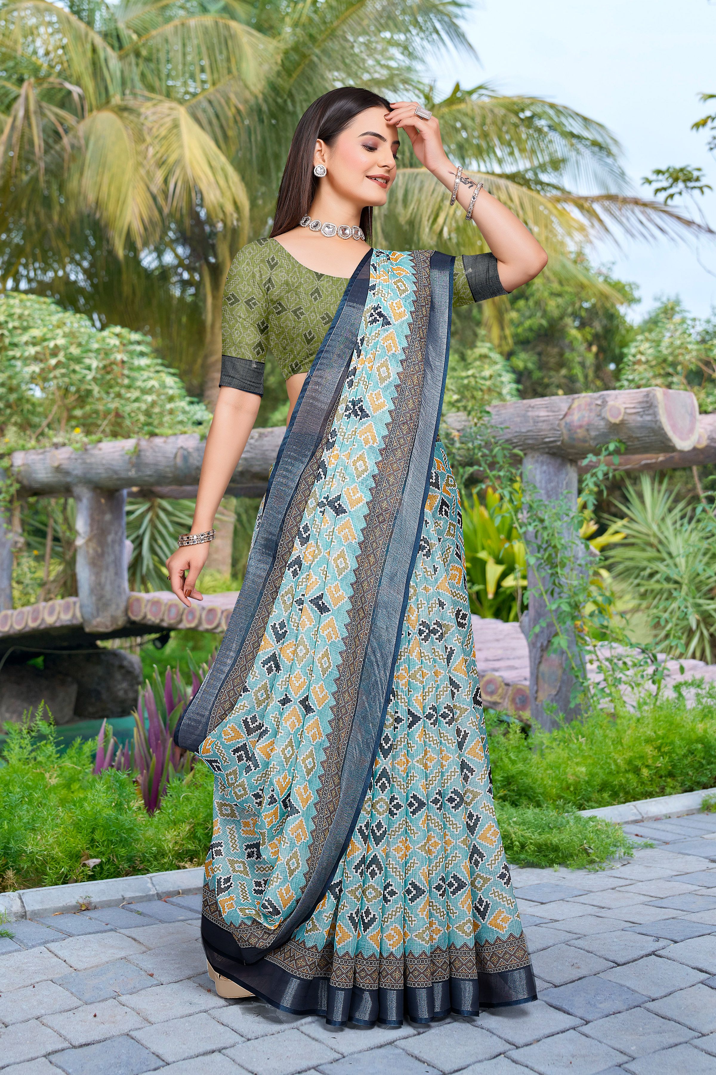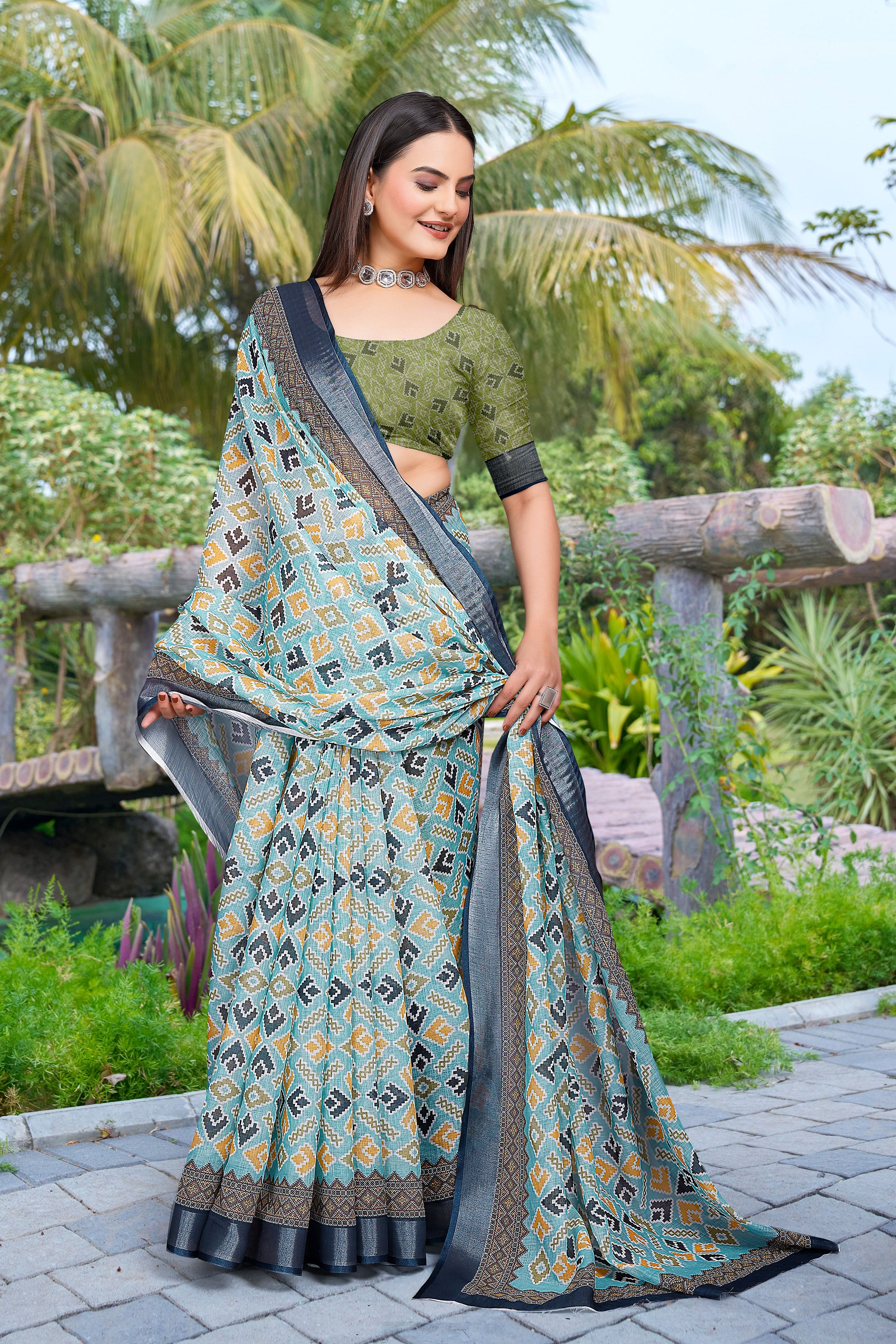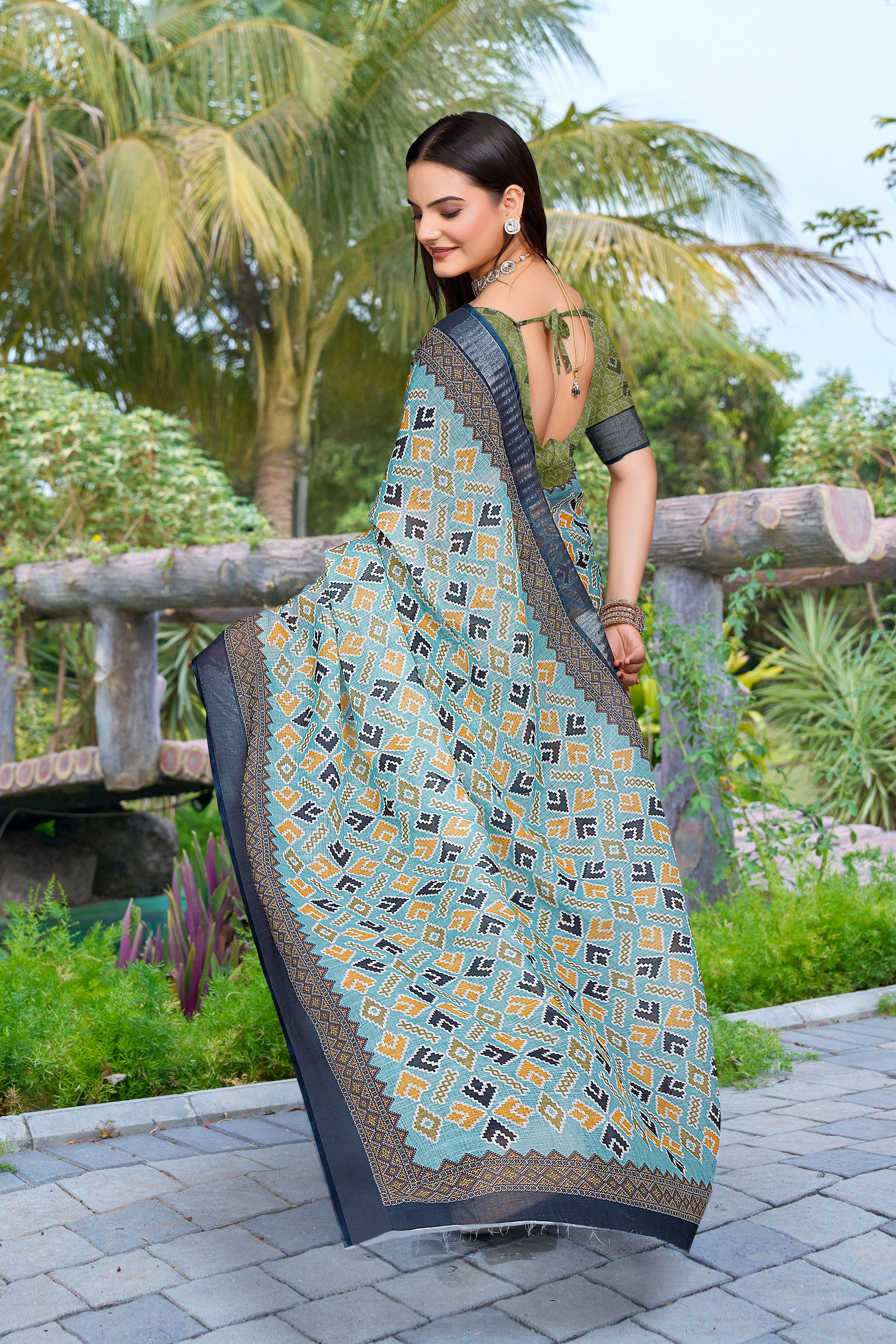 Green Color Linen Cotton Fabric Woven Border Designer Printed Saree