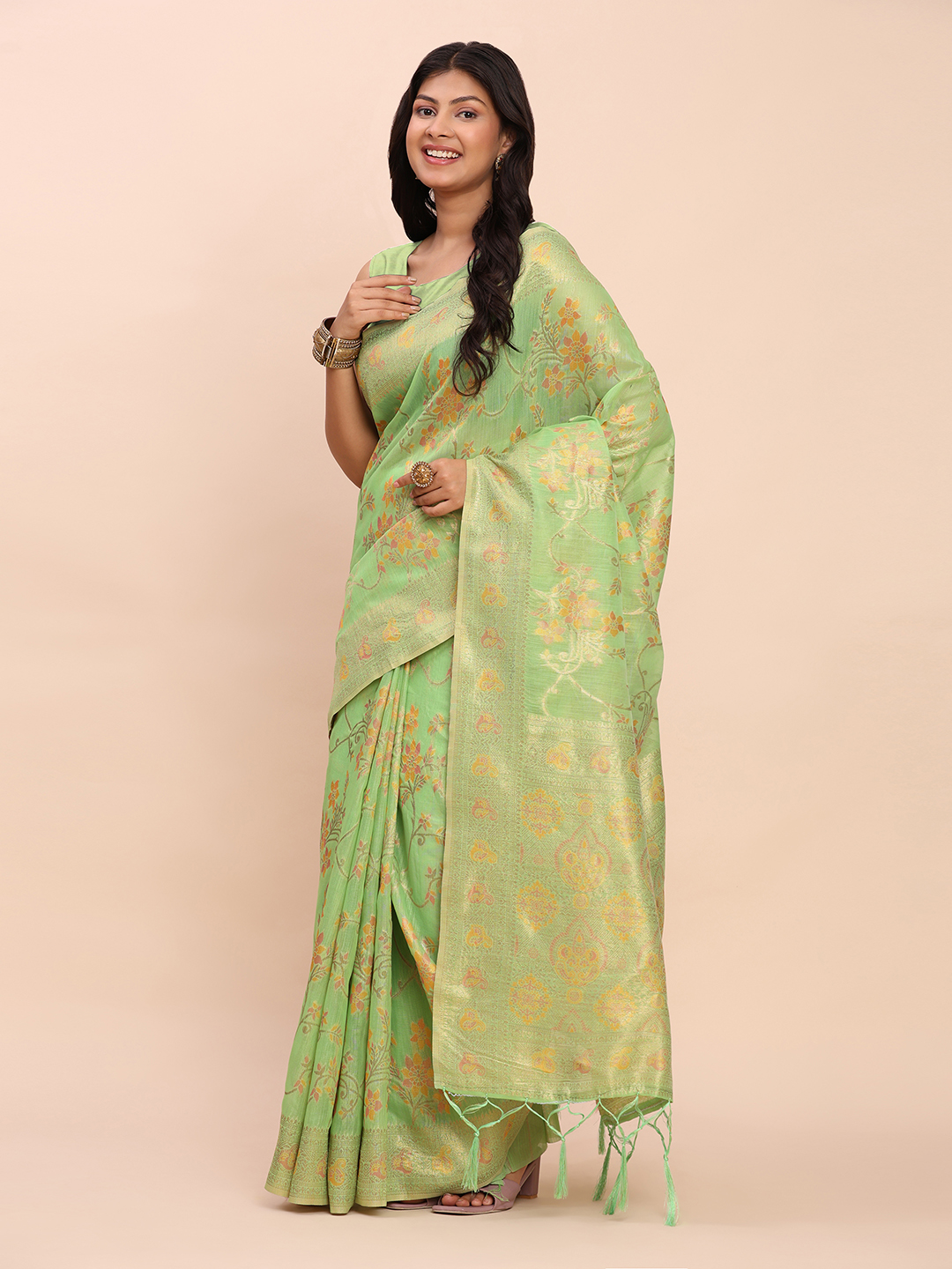 Green Color Linen Cotton Fabric Woven Designer Ethnic Partywear Saree