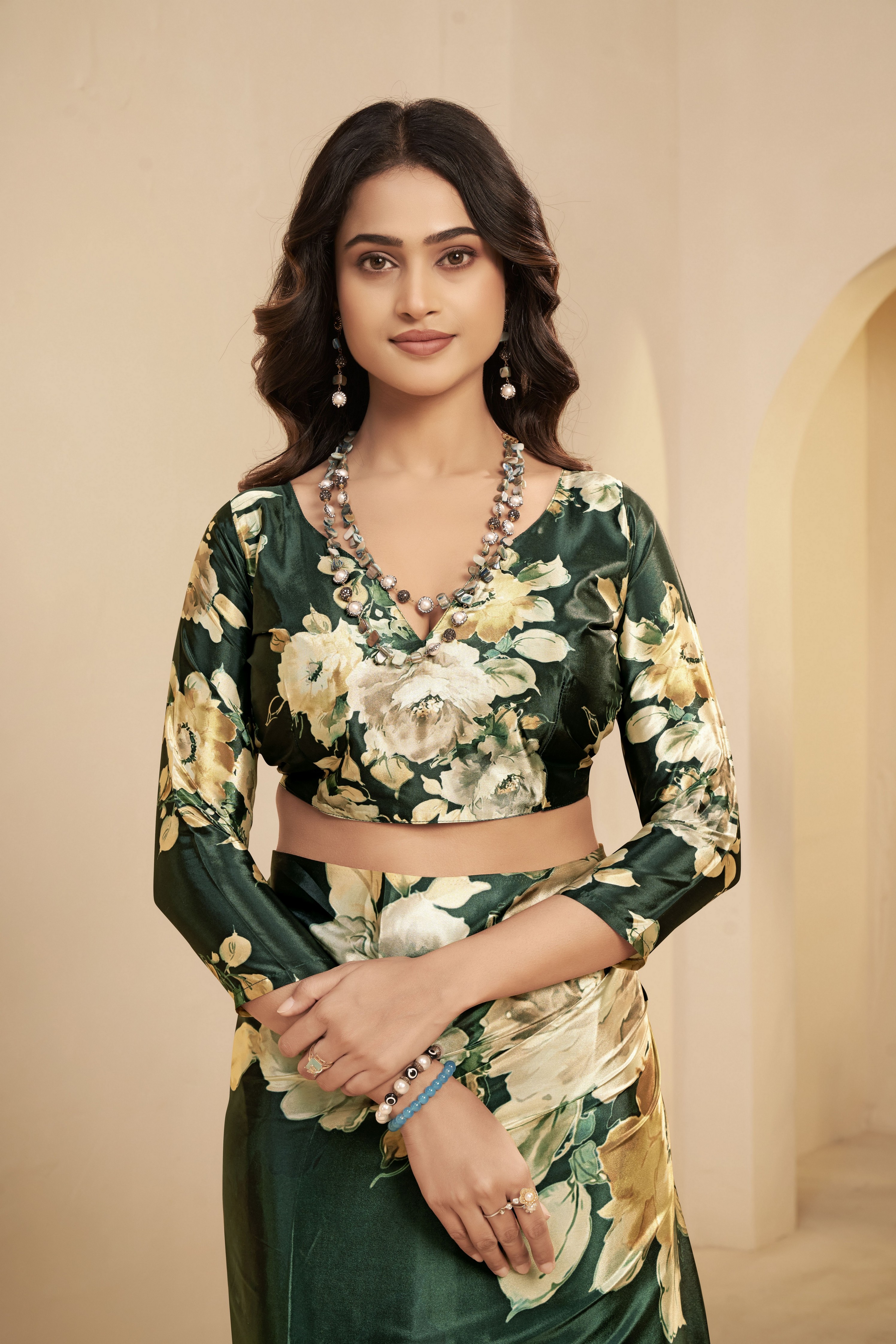 Green Color Malai Crepe Silk Designer Digital Printed Ethnic Partywear Saree